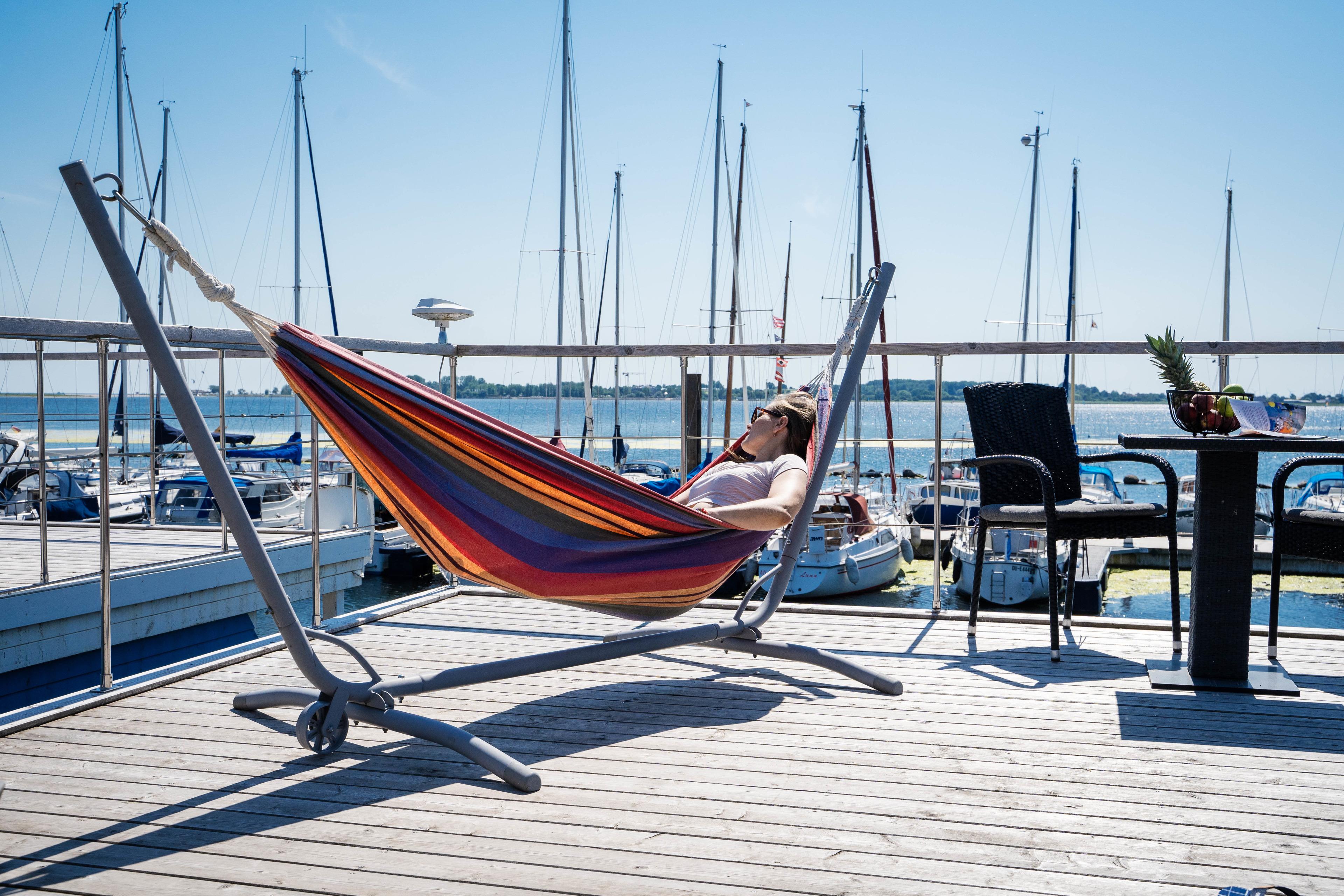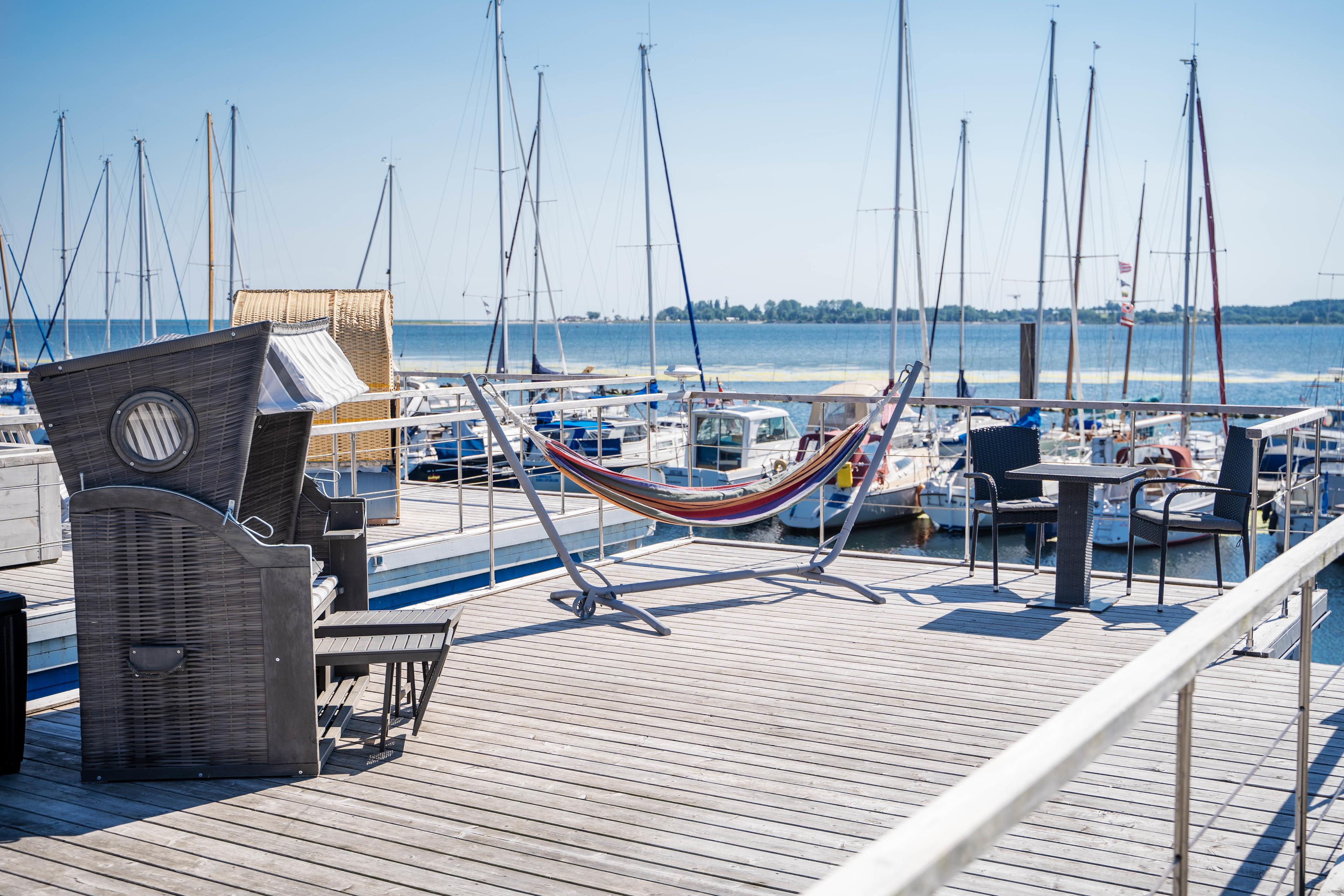 Genießen Sie Ihren Fehmarn Urlaub auf unserem hundefreundlichem Hausboot ELLA und entspannen auf der Hängematte an Deck.