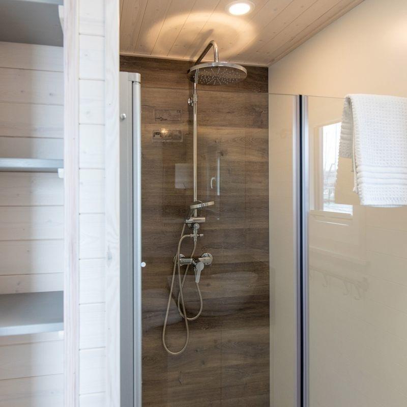 Das Dusch-Bad ist ausgestattet mit Dusche, Waschbecken, Spiegel und Föhn, nur hier befindet sich die Fußbodenheizung. Das Hauboot verfügt über einen 60Liter Warmwasserboiler (warmes Wasser ist daher nur begrenzt nach Verbrauch verfügbar).