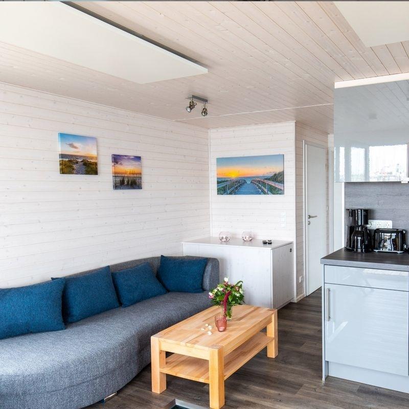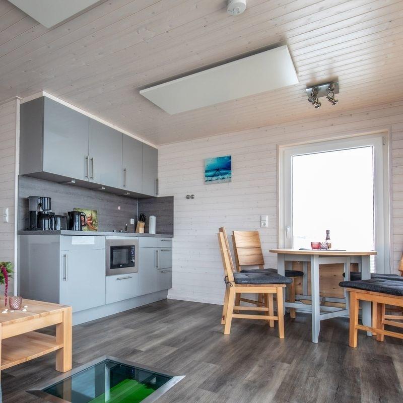 Der Wohnbereich mit interierter Küche und Esstisch, bietet Platz für bis zu 5 Personen.