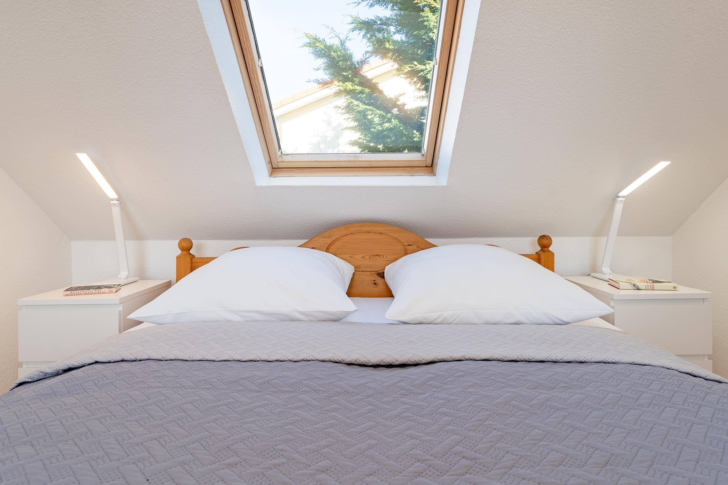 Schlafzimmer: 1 Doppelbett, Verdunkelung: Rollos, Kleiderschrank, Platz für ein Babybett vorhanden