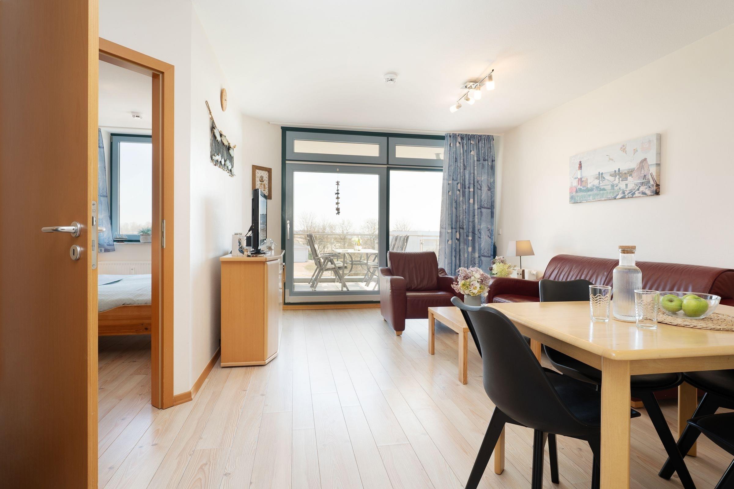 In fantastischer Lage von Fehmarn-Burgtiefe am Südstrand in der 1. Reihe: strandnahe 3-Zimmer-Ferienwohnung für bis zu 4 Erwachsene auf 53 m² Wohnfläche im 1. Stock mit Balkon und Meerblick.