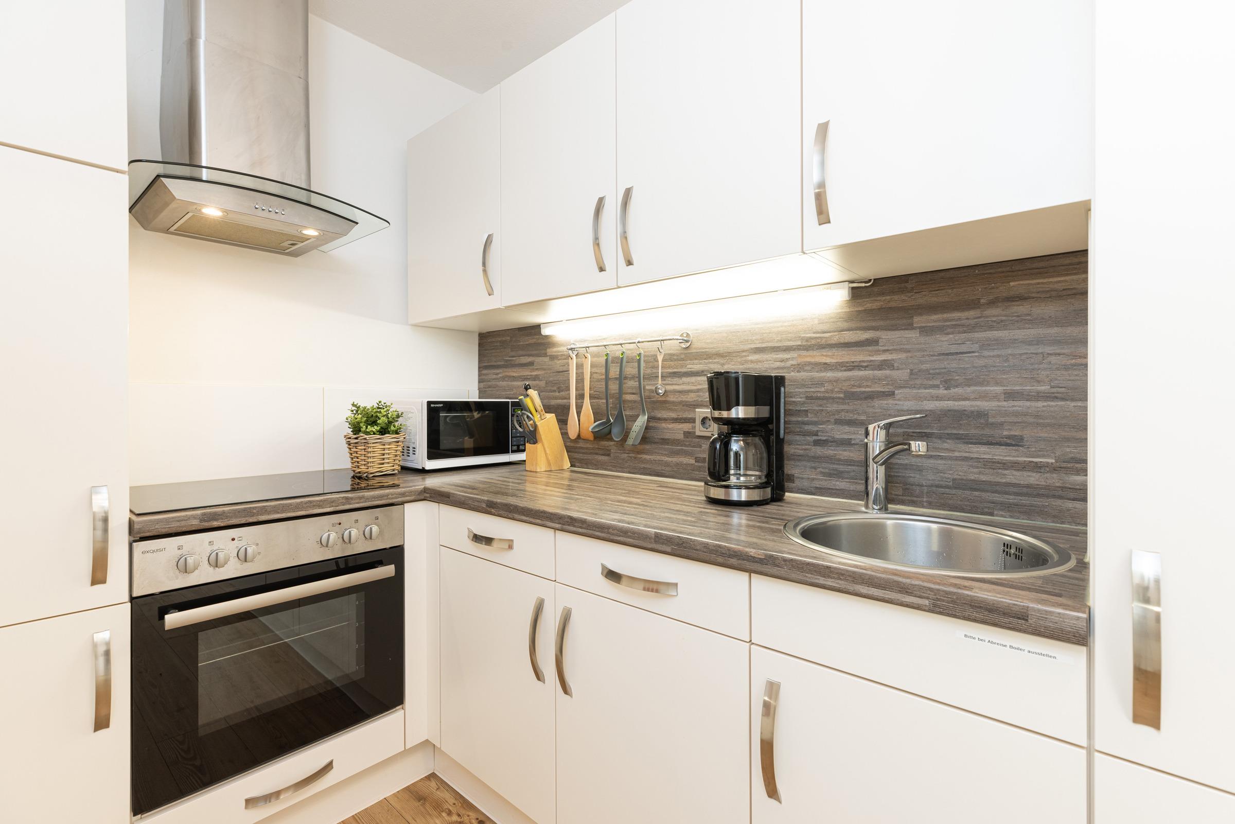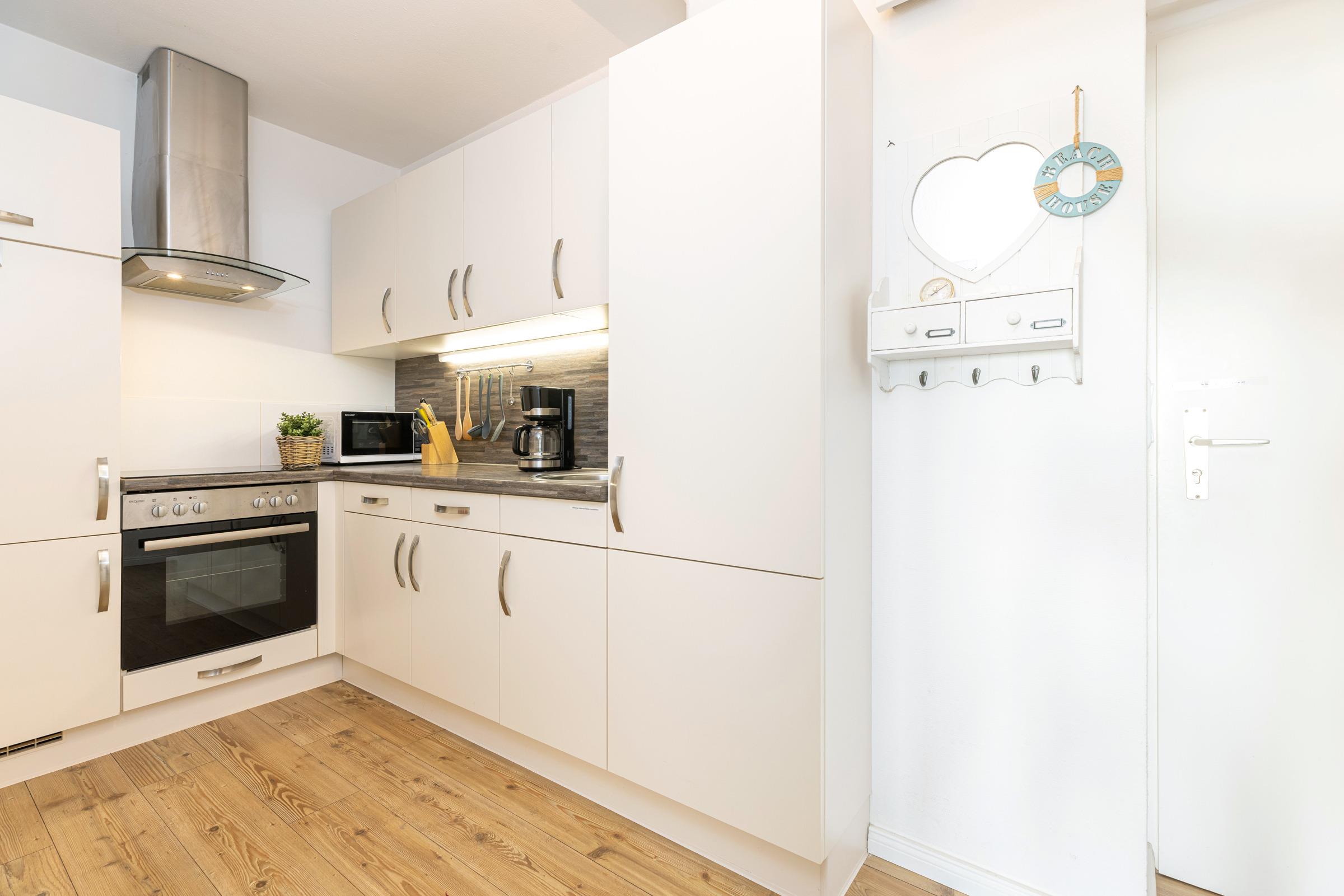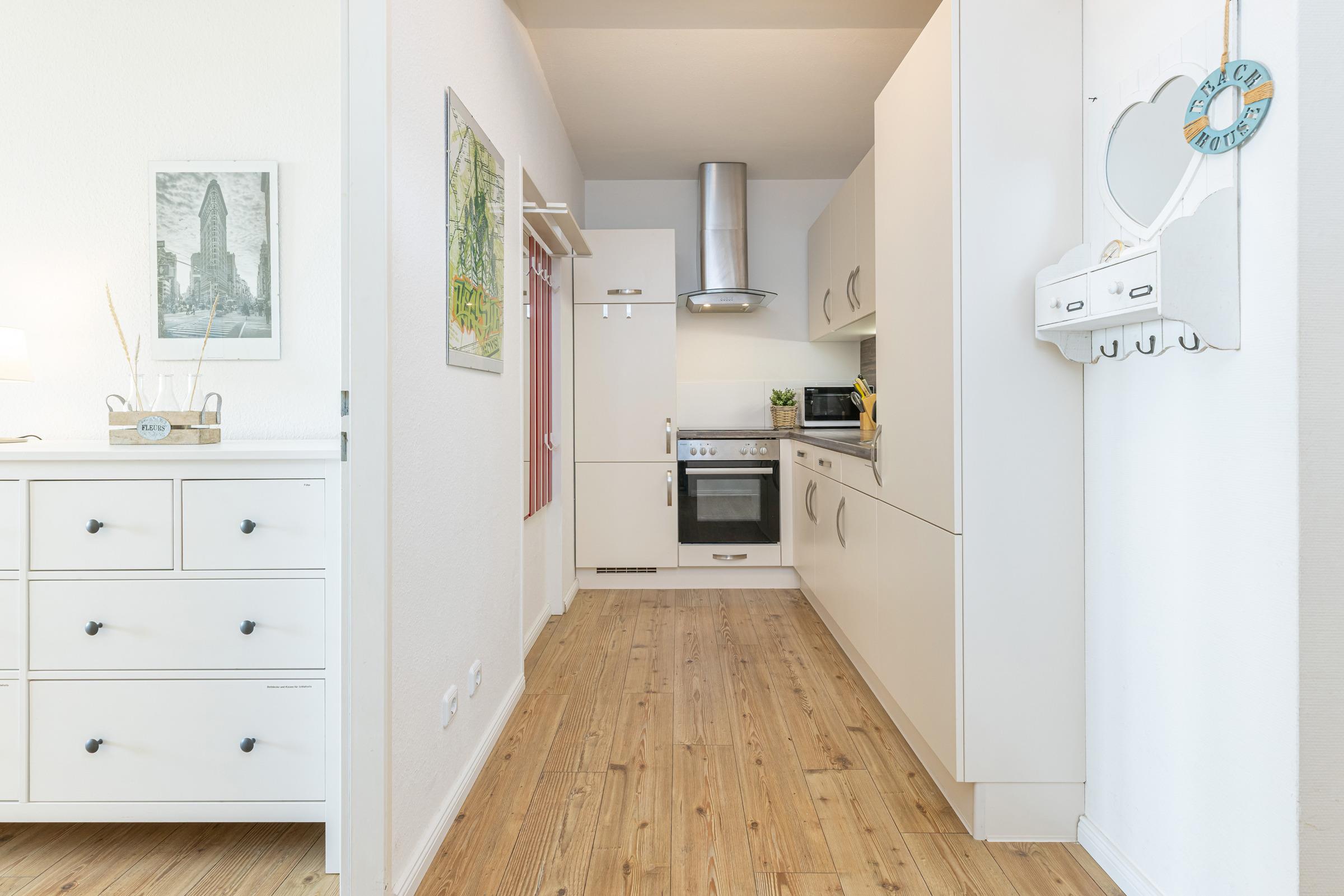 Im kombinierten Wohn-/Schlafraum befindet sich ein Schlafsofa für 2 Personen (140x200 cm), eine Sofaecke mit TV und eine Essecke mit Blick aufs Meer. Am Terrassenfenster als Schiebetür lädt ein 6 m² großer, nach Südwesten ausgerichteter Balkon zum Sonnenbaden oder zum Essen mit Meerblick ein. Ein Flachbildfernseher und ein CD/iPod/mp3-Player mit Radio sind vorhanden. In der Küche befindet sich die übliche Standardausstattung wie Kaffeemaschine, Mikrowelle, Toaster, etc. Im Schlafraum finden Sie ein bequemes Doppelbett (180x200 cm), Kleiderschrank sowie Kommode. Das moderne Bad ist mit einer Dusche, einem Handtuchheizkörper und einem deckenhohen, beleuchteten Wandspiegel ausgestattet. Das Wohn- und Schlafzimmer haben einen Laminatfußboden.