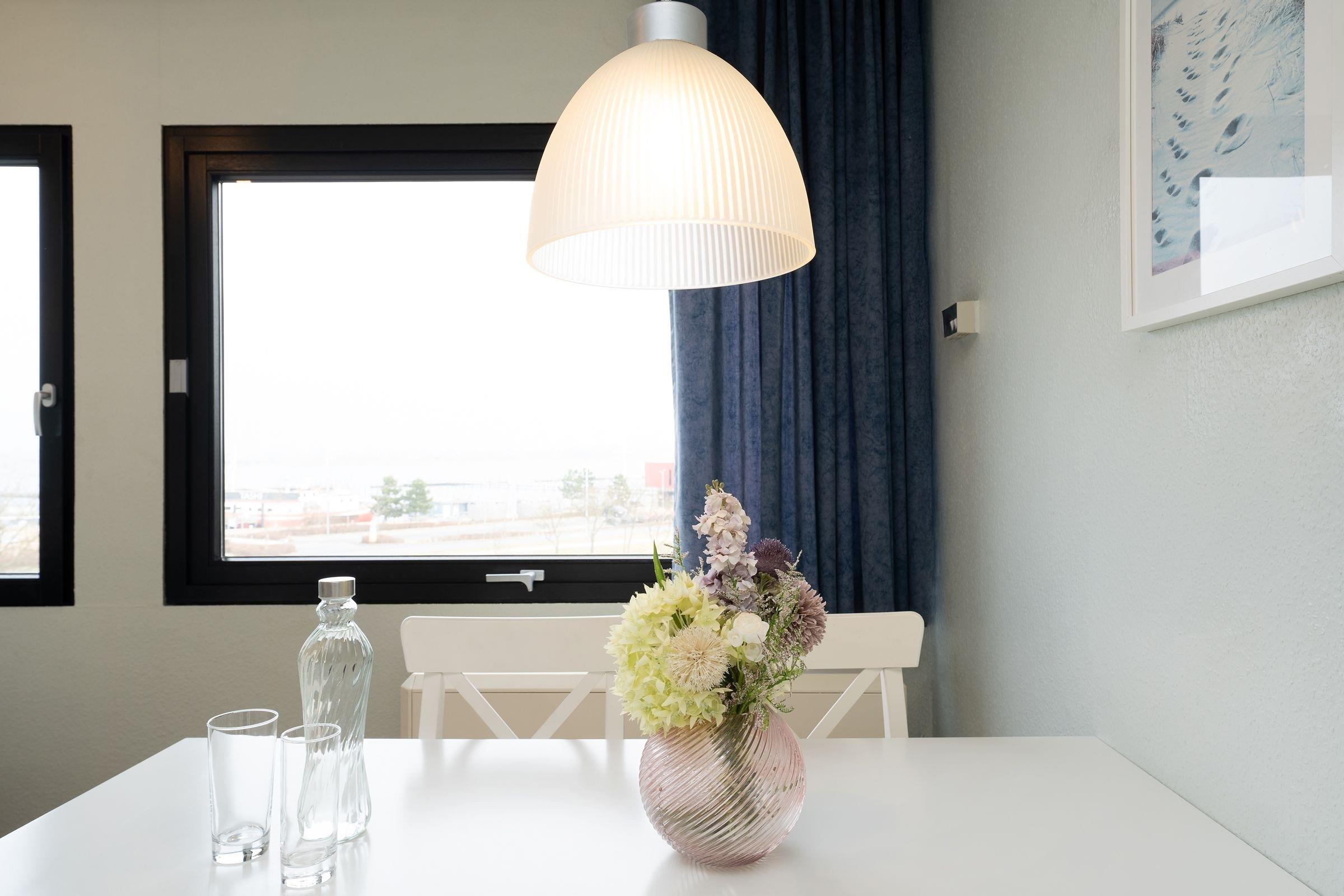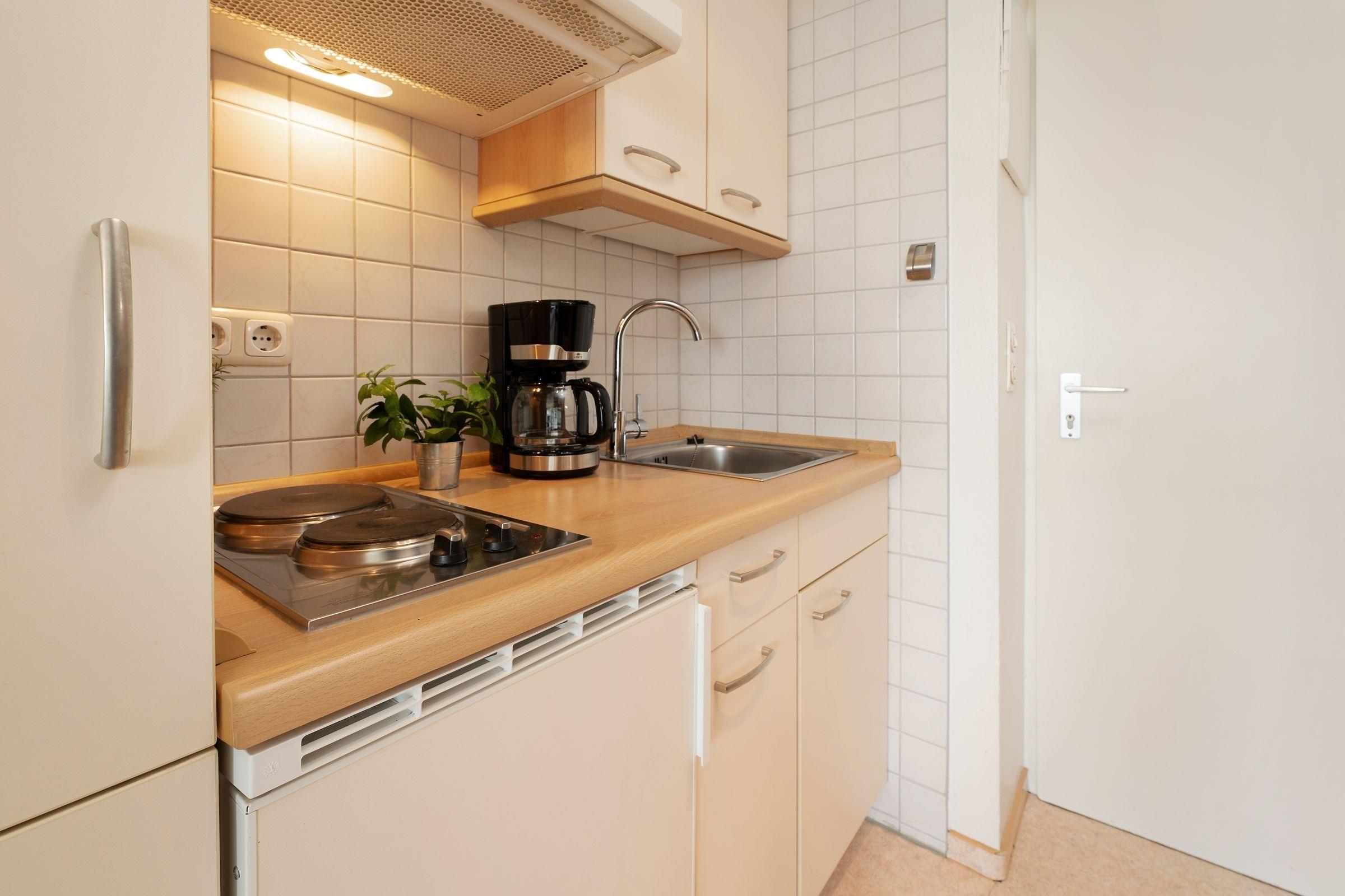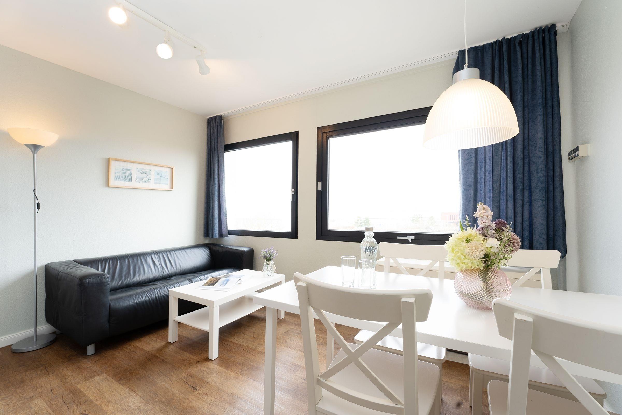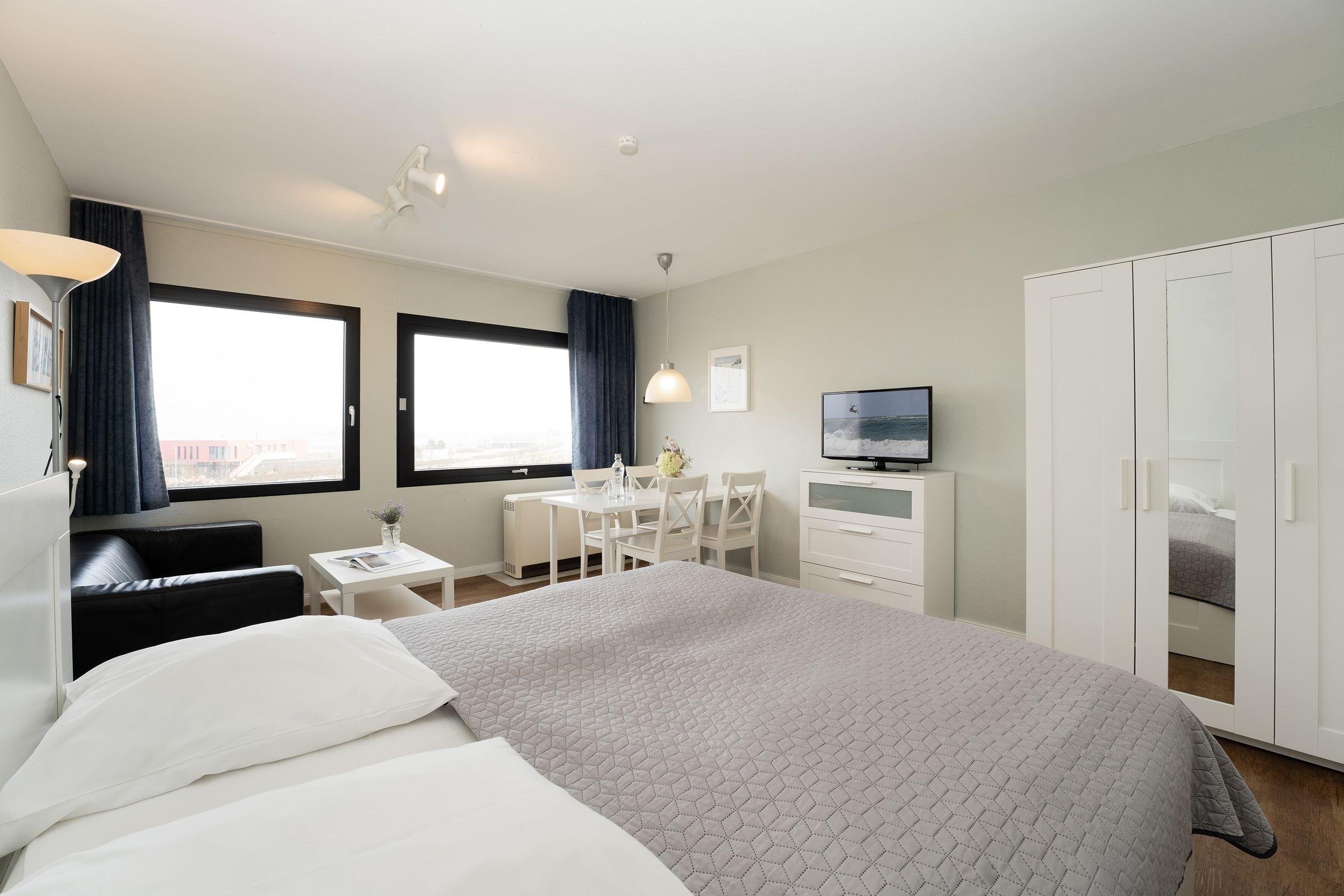 Herzlich Willkommen im Appartement Heimathafen! Hier können Sie wunderbar die Seele baumeln lassen. Die Ferienwohnung besticht durch ihre wunderbare Lage - umgeben von Wasser. Im hellen Wohn-/Schlafbereich befindet sich ein gemütliches kleines Sofa, ein schöner Esstisch sowie ein bequemes Doppelbett (180x200 cm) zum Träumen. Durch die großen Fenster haben Sie praktisch von überall aus einen tollen Meerblick. Öffnen Sie die Fenster, um dazu noch die frische Meeresluft zu atmen und um den Möwen zu lauschen. In der kleinen, offenen Kochnische mit Herd, Kühlschrank, Kaffeemaschine und Wasserkocher können Sie sich gut selbst verpflegen. Für Kinder steht separat, zwischen dem Küchenbereich und dem innenliegen Badezimmer mit Badewanne mit Duschfunktion, ein Etagenbett zur Verfügung. Fußläufig befinden sich kleine Läden für die Brötchen am Morgen, ein Waschsalon und Lokale, um bei Tee und Kuchen den Tag zu genießen, den Sonnenuntergang an der Uferpromenade und die letzten Kiter zu beobachten.
