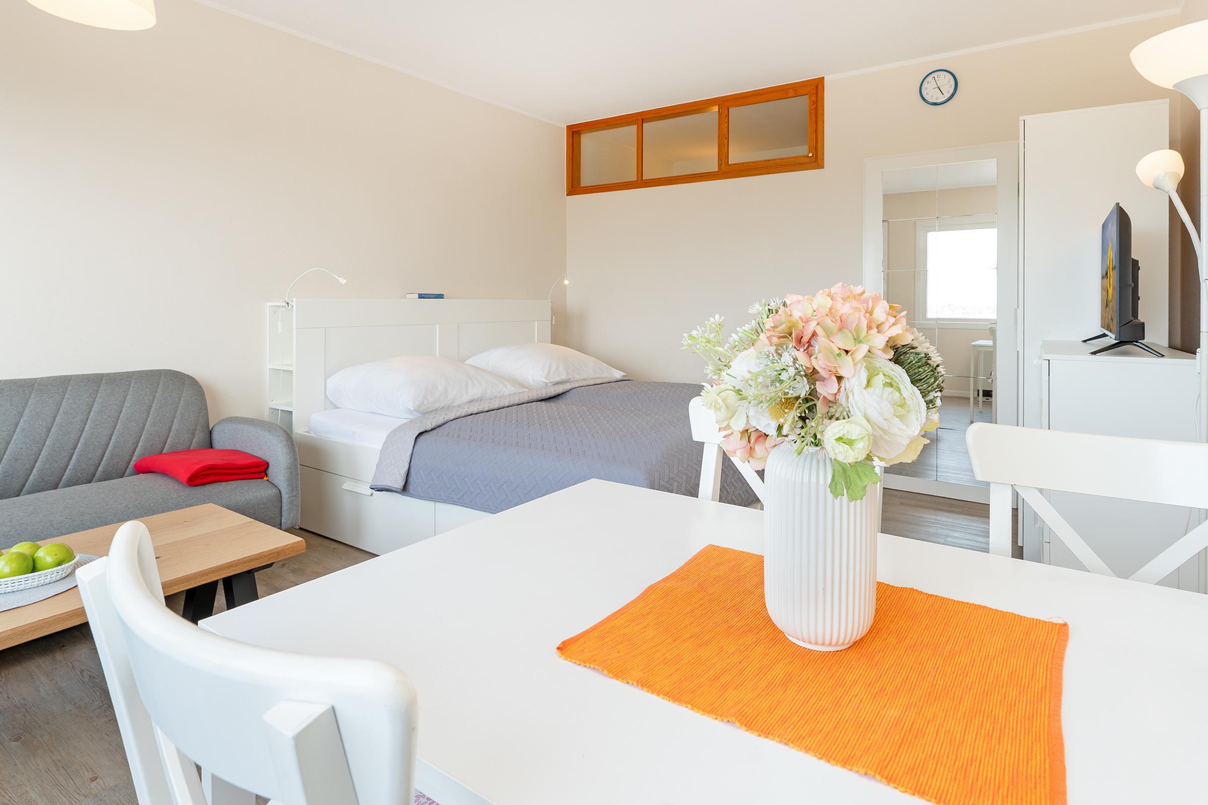 Bequem mit dem Fahrstuhl erreichen Sie Ihr Urlaubsdomizil. Im gemütlichen Wohn-/ Schlafraum befindet sich ein bequemes Doppelbett (180x200 cm) zum Träumen sowie ein Esstisch und ein kleines Sofa mit TV-Gerät. Das Etagenbett steht zwischen der kleinen, aber gut ausgestatteten Küche und dem Badewannen-Bad. Das Besondere ist sicher die Lage dieser Ferienwohnung, weil Sie von Wasser umgeben ist. Unser Tipp: Öffnen Sie das Fenster, um die frische Meeresluft zu atmen und um den Rufen der Möwen zu lauschen. Praktisch: Fußläufig finden Sie kleine Läden für die Brötchen am Morgen, einen Waschsalon und Lokale, um bei Tee und Kuchen den Tag zu genießen oder abends den Sonnenuntergang an der Uferpromenade und die letzten Kiter zu beobachten.
