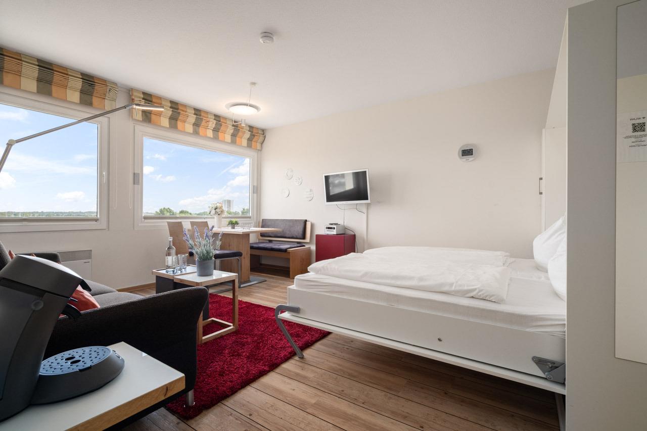 Die Wohnung Hafenkoje besticht durch einen großzügigen Esstisch direkt am Fenster, von dem aus Sie den Hafen und die Boote beobachten können. Die moderne und geschmackvolle Einrichtung sorgt für Gemütlichkeit und Wohlfühlatmosphäre. Die gut ausgestattete Küche lädt zum Kochen ein, während das moderne Badezimmer für Entspannung sorgt. Als Schlafgelegenheiten erwarten Sie ein Schrank-Doppelbett im Wohnbereich sowie zwei Einzelbetten im separaten Schlafzimmer. Genießen Sie den Blick auf den malerischen Hafen und die entspannte Atmosphäre, die diese Unterkunft zu bieten hat.