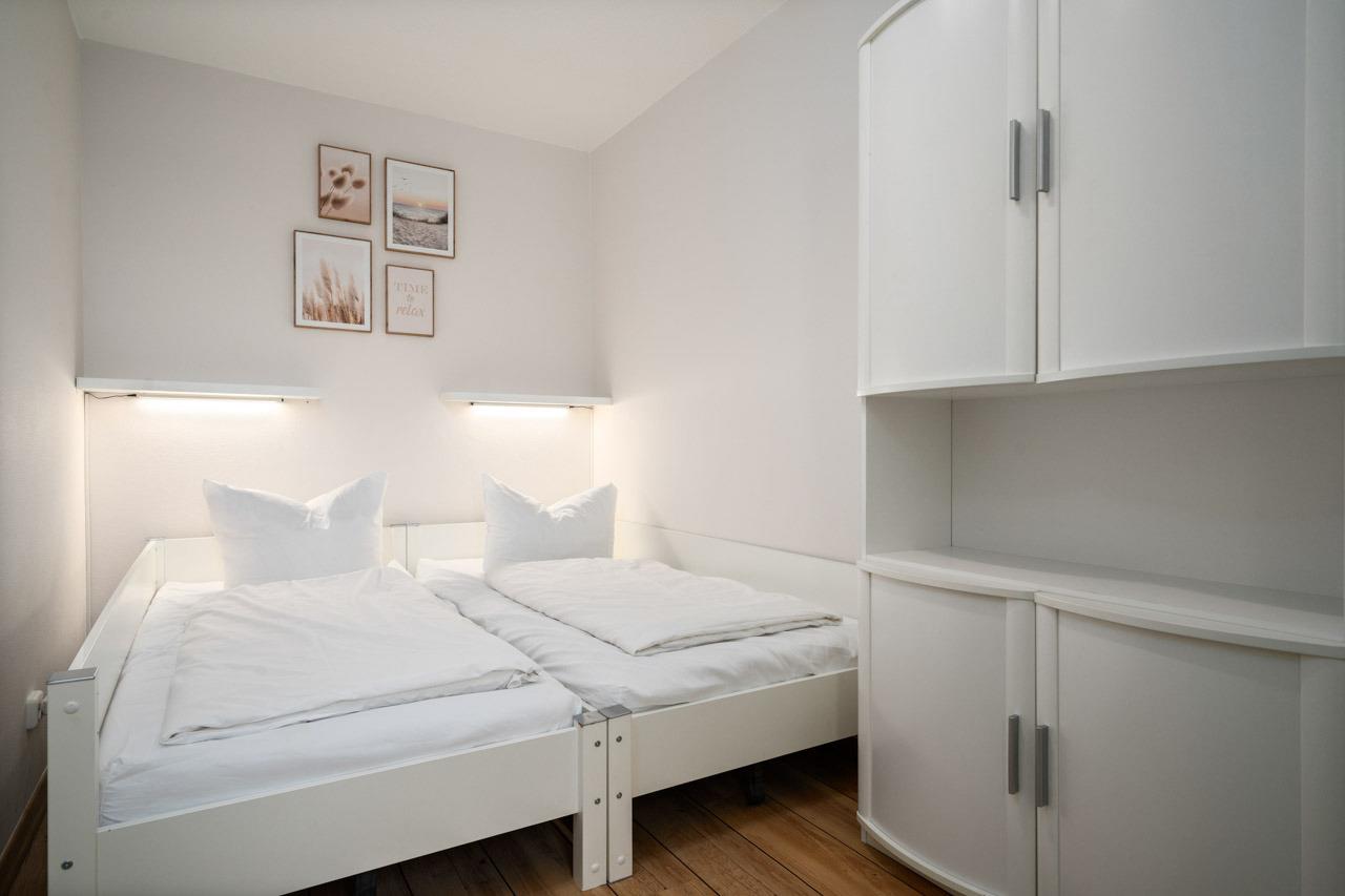 Schlafzimmer: 2 Einzelbetten, Verdunkelung: Plissee, Kleiderschrank, kein Platz für ein Babybett vorhanden