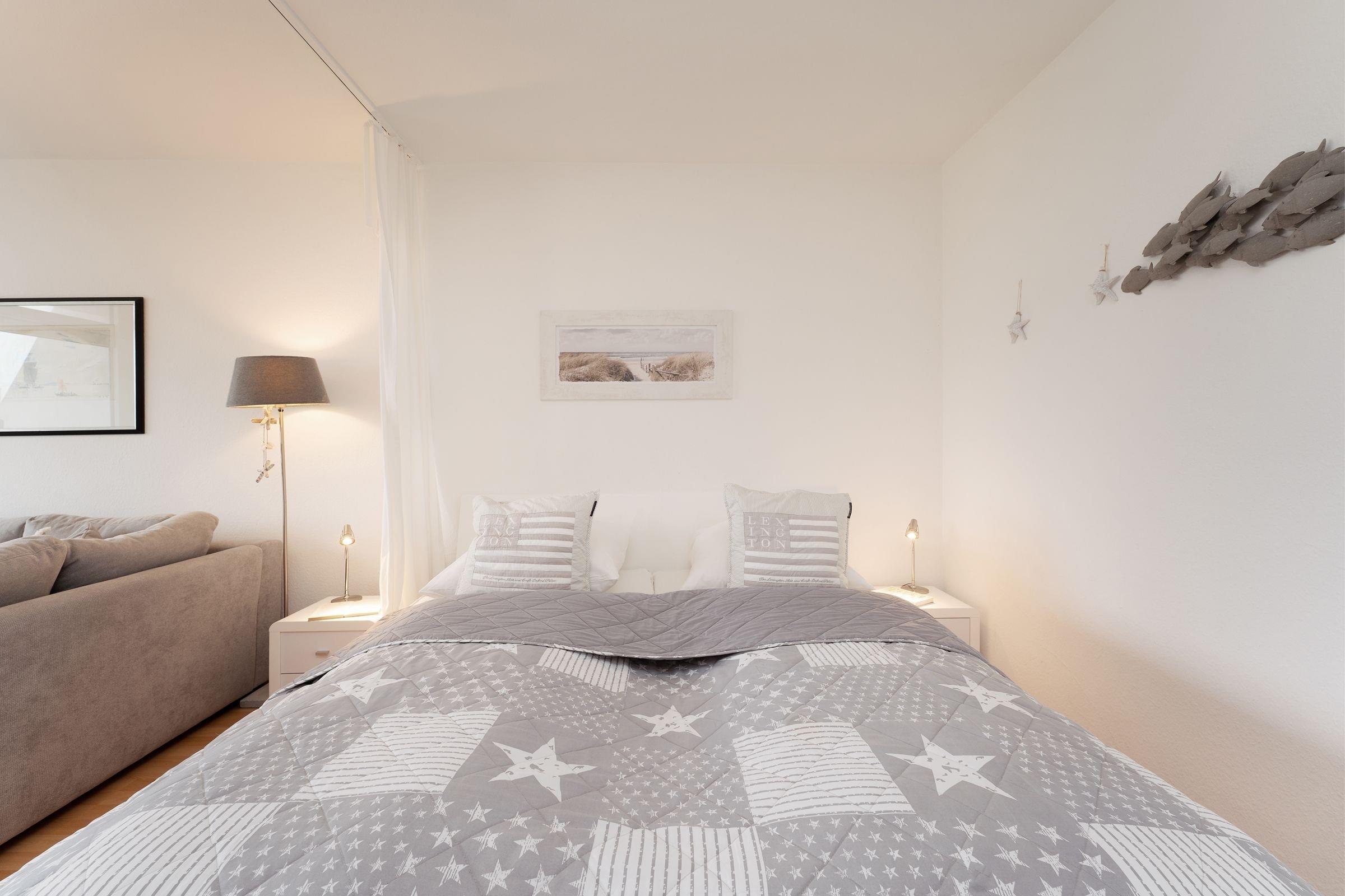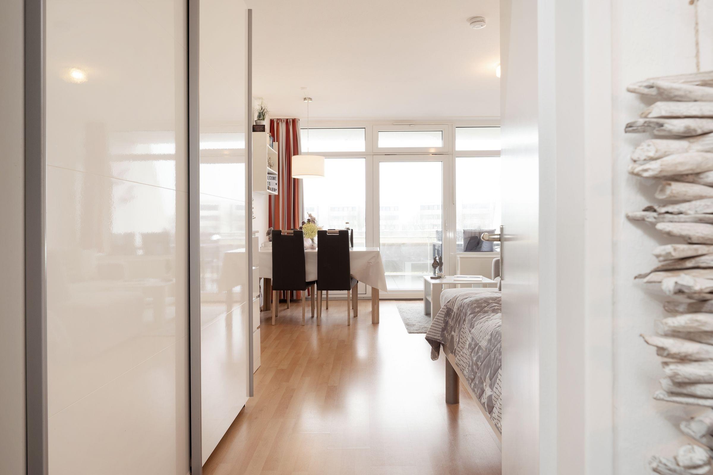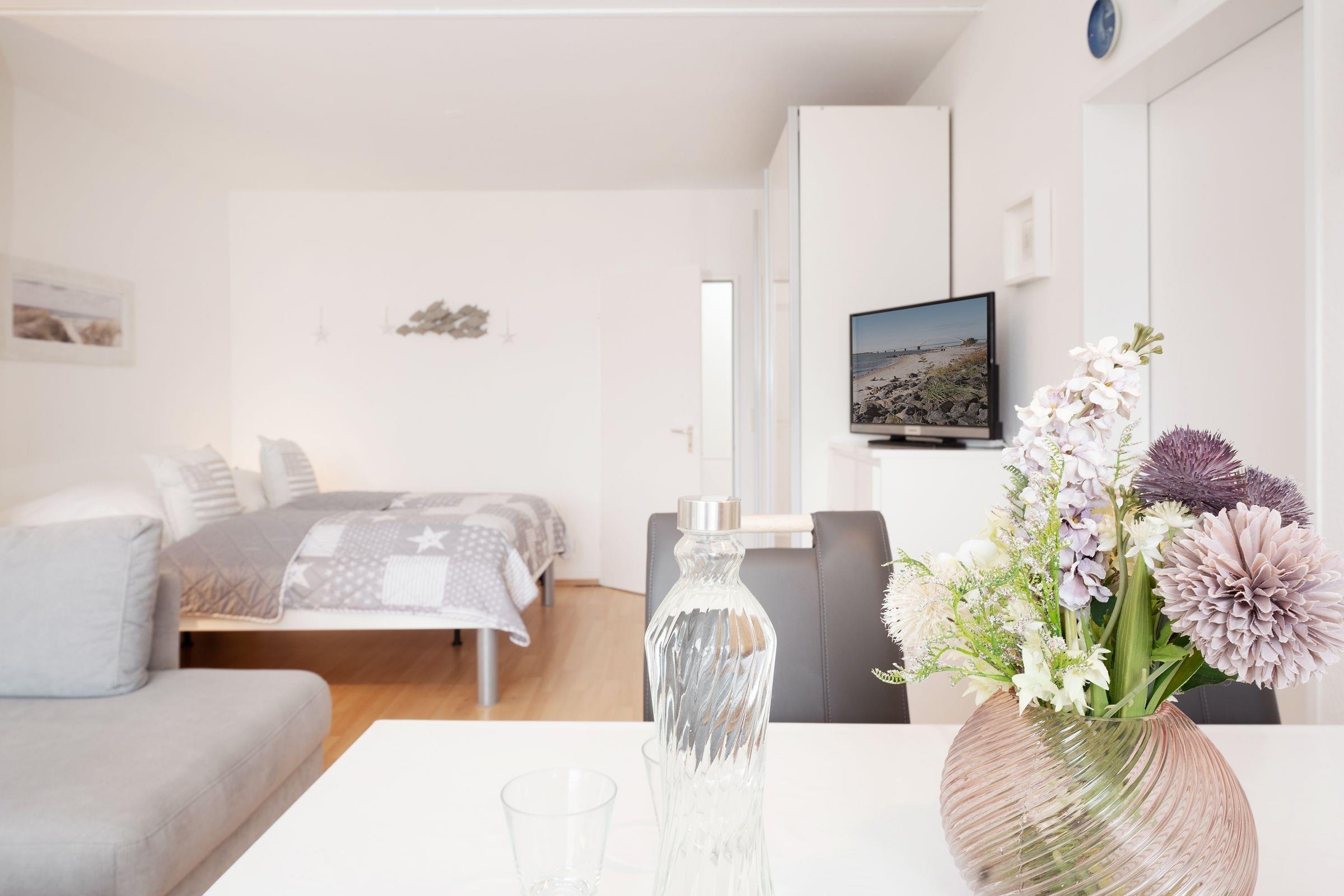 Diese gemütliche und geschmackvoll eingerichtete Ferienwohnung bietet die ideale Kombination aus Komfort und Nähe zur Ostsee. Nur 100 Meter von Fehmarns traumhaften Südstrand entfernt, ist sie der perfekte Ausgangspunkt für einen entspannten Urlaub. Der helle Wohnbereich besticht durch eine stilvolle Einrichtung mit kuscheligem Sofa und moderner Unterhaltungstechnik, darunter ein Flachbild-TV. Die angrenzende möblierte Terrasse mit Südausrichtung lädt zum Entspannen ein und bietet Platz für ein nettes Frühstück im Freien. Im hinteren Bereich des Wohnraums steht ein komfortables Doppelbett (2x 100x200 cm), das für süße Träume sorgt. Ein Vorhang bietet Gemütlichkeit und Privatsphäre. Die geschlossene Küche ist gut ausgestattet und verfügt über ein Ceranfeld, Backofen, Spülmaschine, Kühlschrank mit Gefrierfach, Mikrowelle, Toaster und Kaffeemaschine. Der Essbereich ist optimal für gesellige Mahlzeiten eingerichtet. Das separate Schlafzimmer bietet ein bequemes Einzelbett (90x190 cm) sowie ein Etagenbett (2x 90x190 cm) und ausreichend Stauraum. Das Badezimmer ist modern gestaltet und mit einer Badewanne mit Duschfunktion ausgestattet.