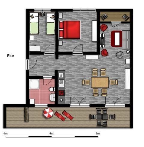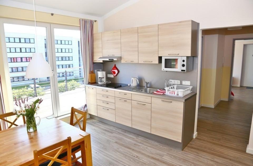Mit dieser Wohnung mieten Sie eine der größten Wohnungen am Südstrand. Mit 80qm, 2 separaten Schlafzimmern, großem Wohnzimmer mit Essbereich, Badezimmer mit Fenster und einer nochmals fast 35qm Dachterrasse ist die Wohnung ideal für Familien. Auch für 2 Pärchen, die gern zusammen Urlaub machen möchten aber doch Ihren Freiraum brauchen, ist die Wohnung ideal. Im Objekt befindet sich ein festes w-lan Netzwerk. Die bodentiefen Fenster lassen viel Tageslicht herein und und schaffen eine warme Atmospähre. Direkt am Wasser gelegen, bietet das Haus den perfekten Ausgangspunkt für entspannte Tage am Meer. Ein separates Schlafzimmer ist mit Doppelbett (180x200cm) und Kleiderschrank ausgestattet. Das zweite separate Schlafzimmer verfügt über 2 Einzelbetten (90x200cm), die aber auch zu einem Doppelbett zusammengeschoben werden können. Beide Schlafzimmer haben den Blick auf den Yachthafen und können den Sonnenauf- und -untergang genießen. Vom Wohnzimmer können Sie auf den Balkon nach Norden - Hafenseite das Panorama des Hafens genießen. Die südliche Dachterrasse mit über 35qm ist ein besonderes Highlight im Urlaub. Das Sofa kann bequem zu einem Doppelschlafsofa 160x200 verwandelt werden. Der große Esstisch mit Versorgungsbar bietet Ihnen alles, was Sie in Ihrem Urlaub benötigen, auch wenn Sie mal nicht Essen gehen möchten. Mikrowelle, Kühlschrank, Cerankochfeld, Mini-Mobilbackofen, Kaffeemaschine, Wasserkocher, Eierkocher, Toaster - alles ist vorhanden.