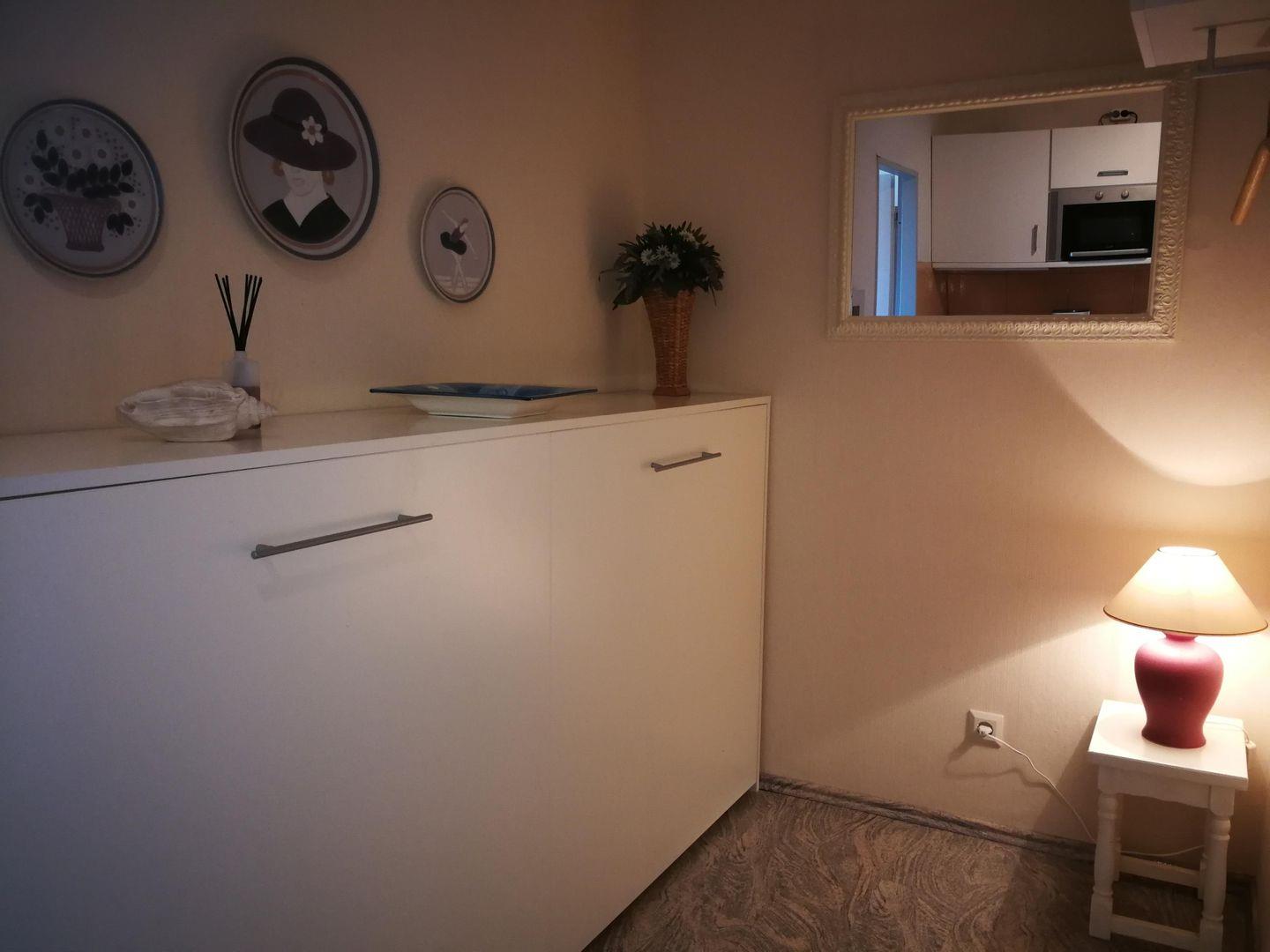 Das Appartement ist für 2 Personen ausgestattet. Der Wohnbereich ist mit einem integriertem Essbereich, einem komfortablen Schrankbett (180*200 cm), sowie einer Fernsehecke und einer großen Fensterfront ausgestattet. Genießen Sie den Ausblick auf den Segelhafen und den Hafen von Burgstaaken.