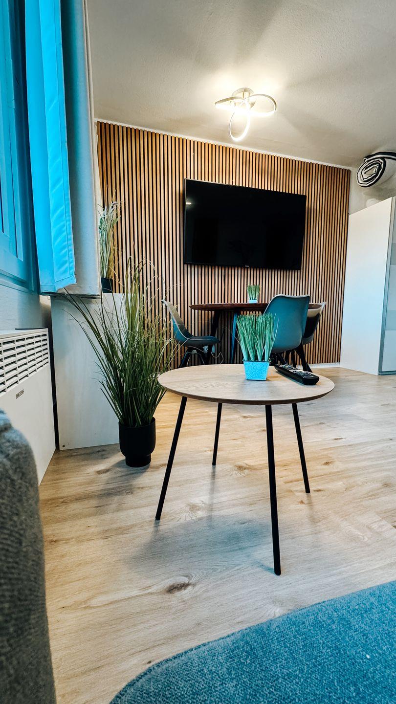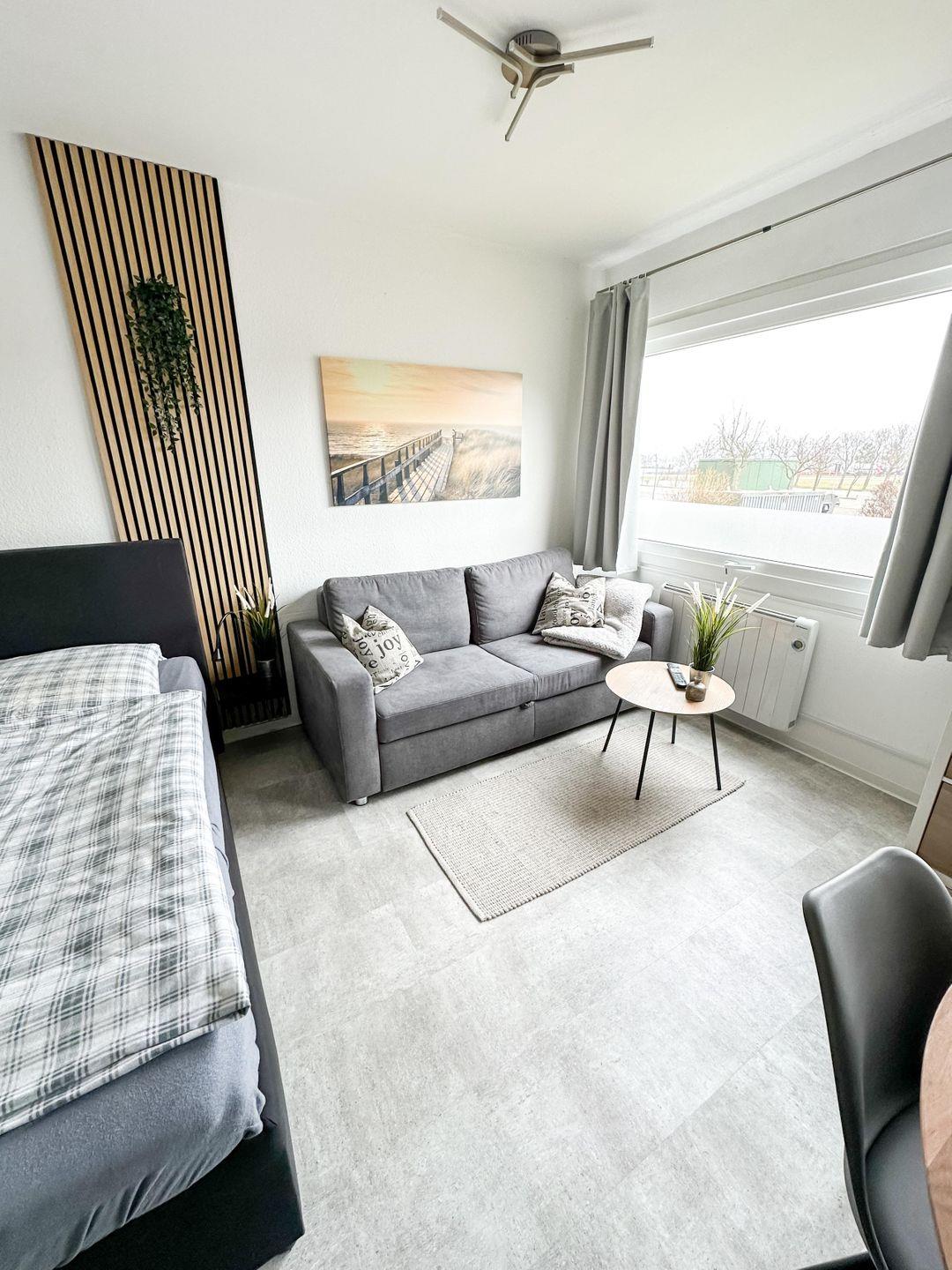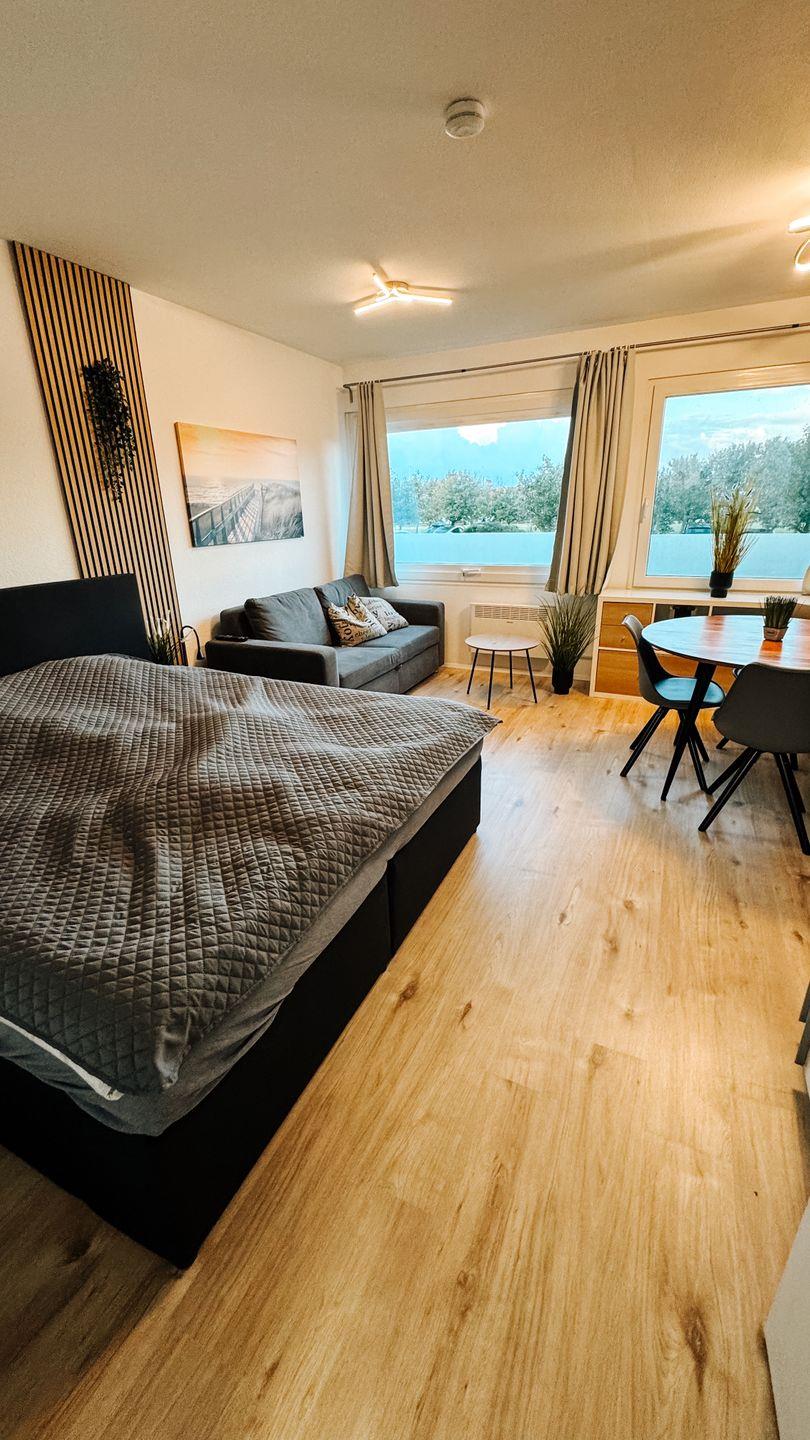 Im Wohnraum erwartet Sie ein komfortables Doppelbett sowie ein Schlafsofa, perfekt für Familien oder Freunde. Ein großer Fernseher steht für entspannte Abende zur Verfügung.