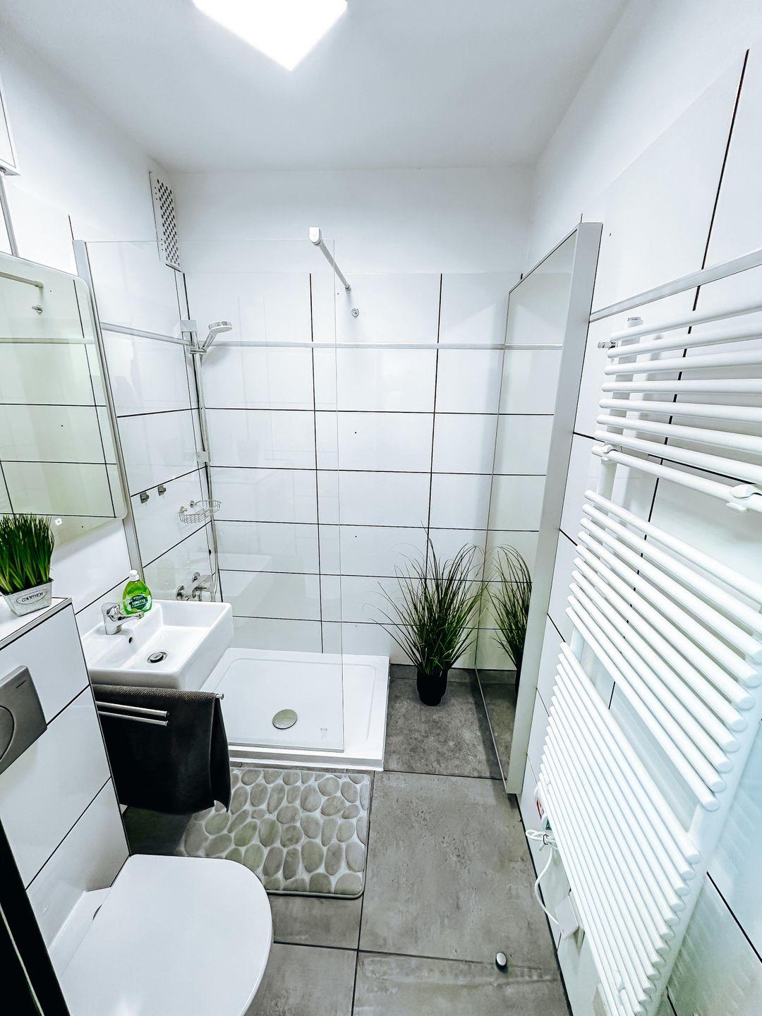 Das renovierte Badezimmer bietet Ihnen eine bequeme Walk-in-Dusche, WC und ein kleines Waschbecken für Ihre persönliche Pflege.