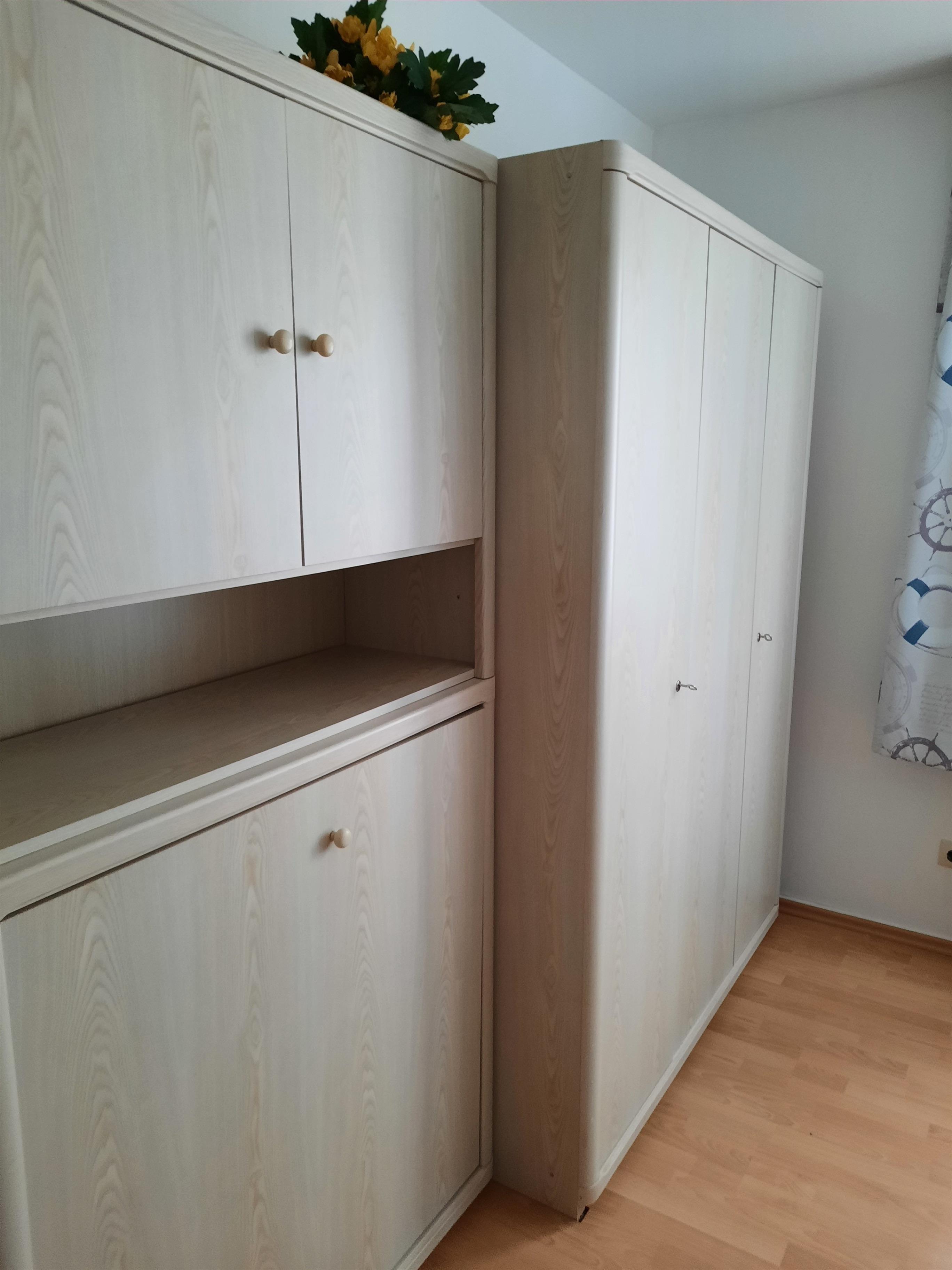 Nebenraum mit zwei separaten Betten, einem dreitürigen Schrank und einem Schreibtisch.