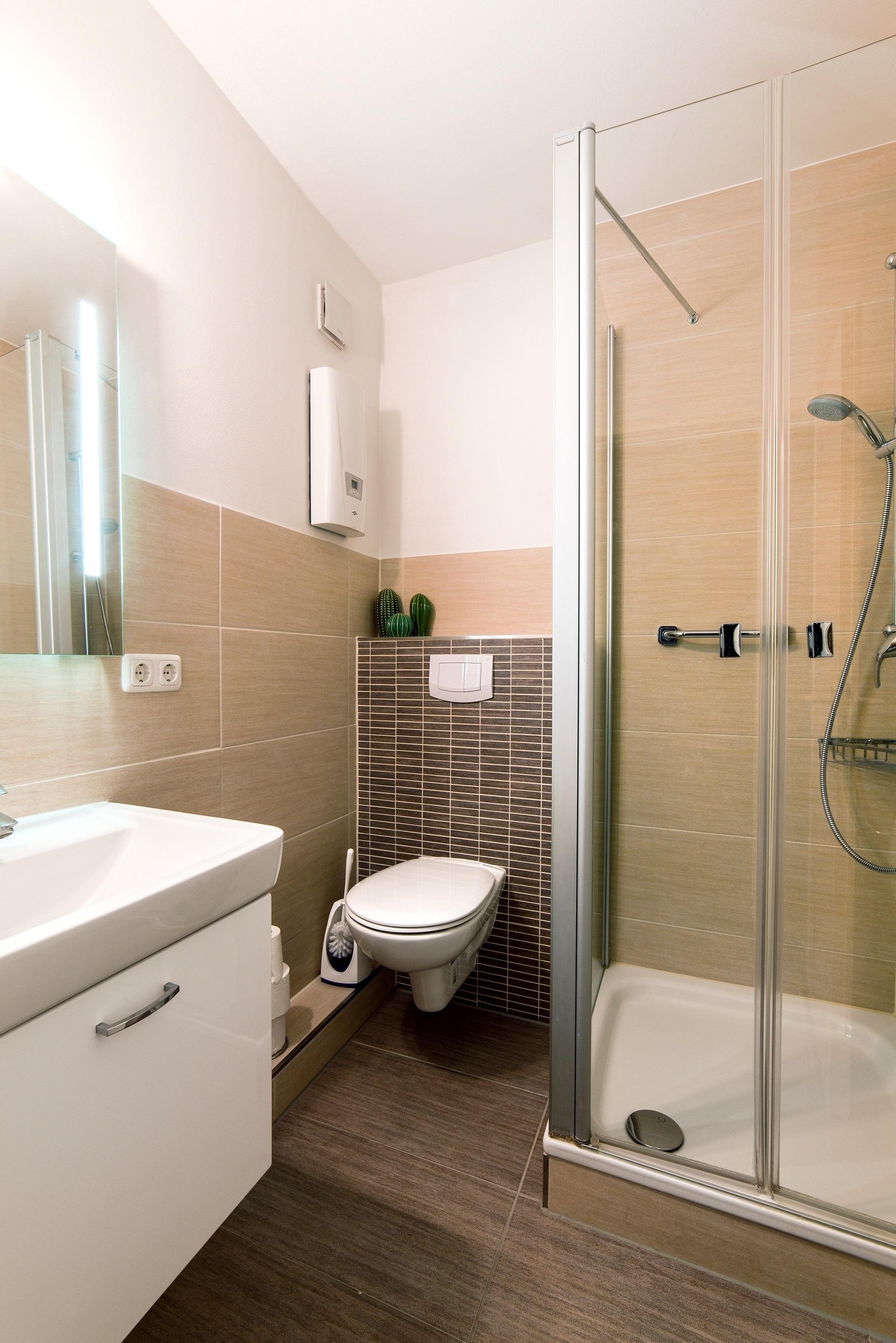 Badezimmer mit Dusche, Waschbecken und WC