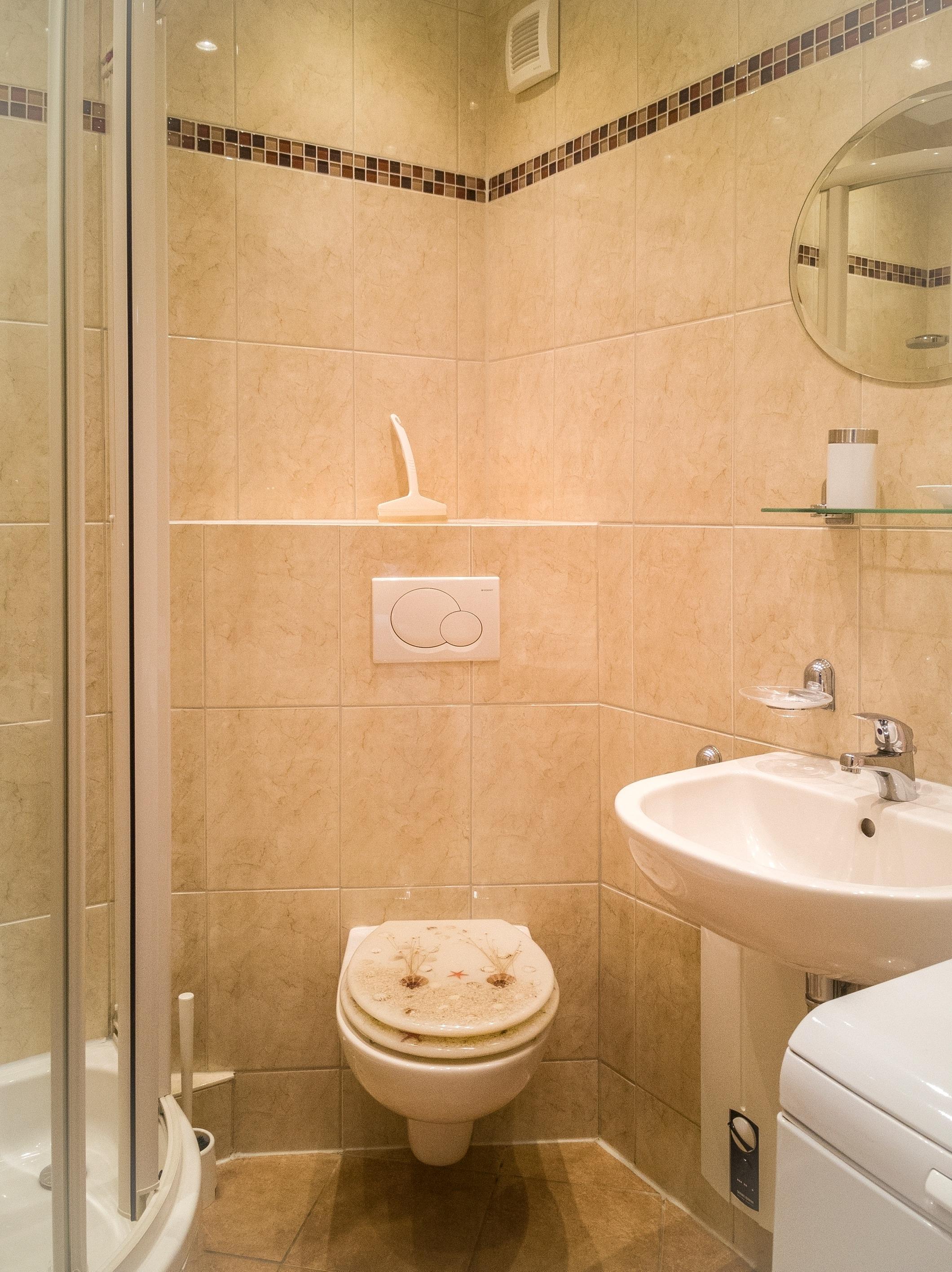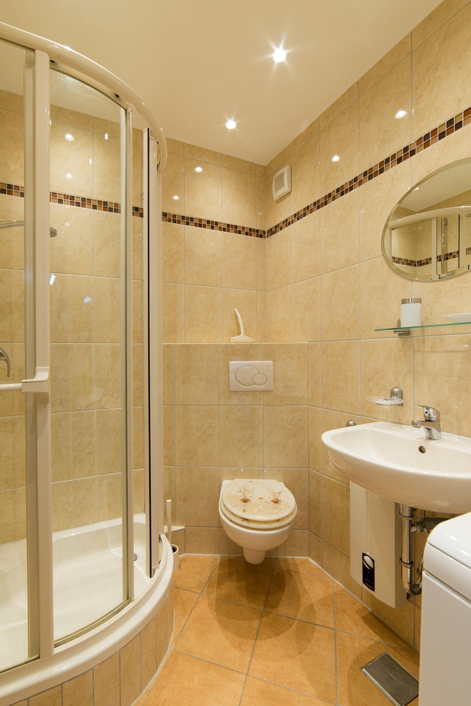Badezimmer mit Dusche und Waschmaschine