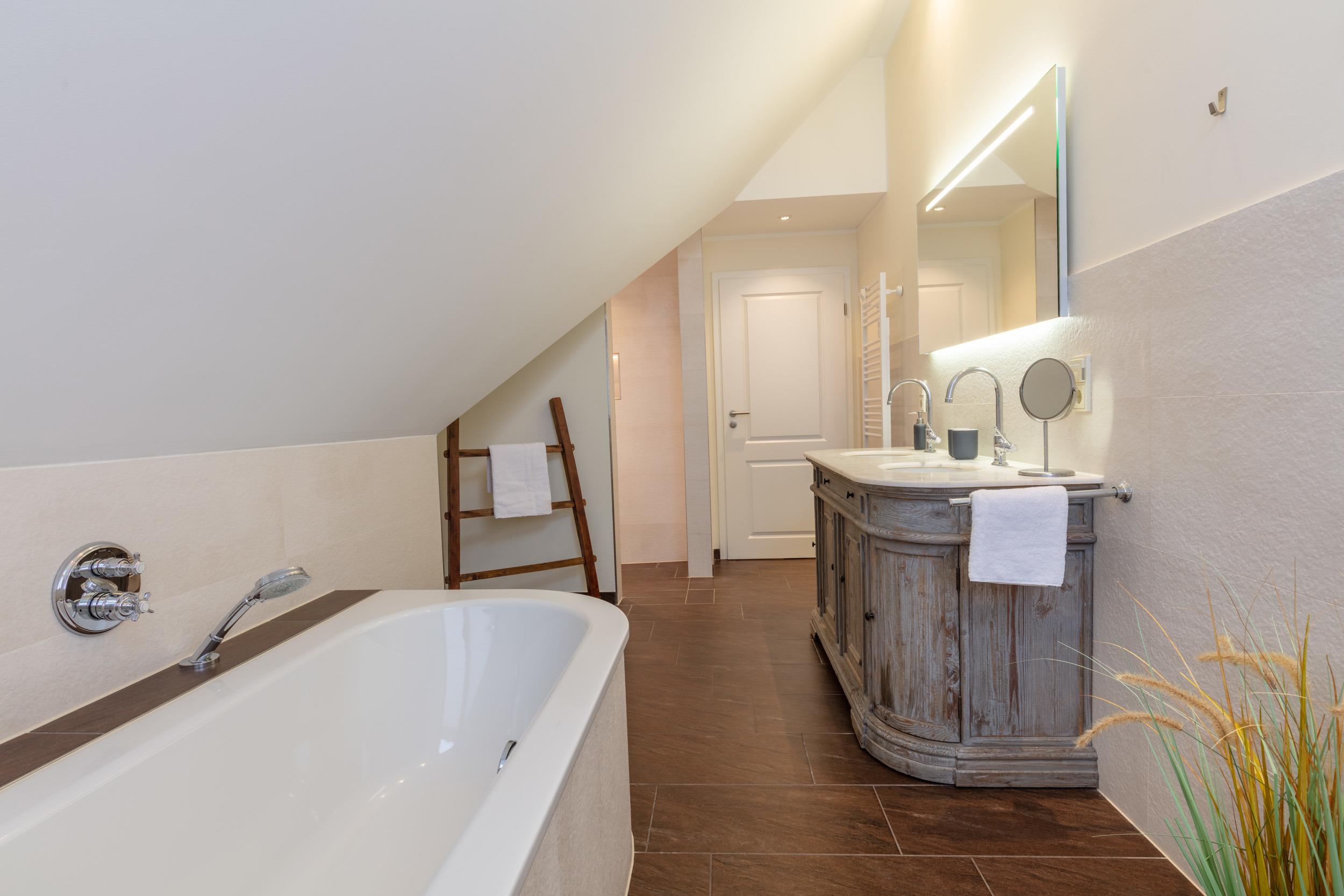 In fast jedem Zimmer fängt sie die Strahlen der Morgensonne ein. Im Erdgeschoß ist der Lebensraum: verbringen Sie den Tag im geräumigen und hellen Wohn- und Esszimmer oder auf Eurer privaten Terrasse. Im ruhigen Obergeschoß liegen die Schlafzimmer mit maximalem Komfort der Boxspringbetten. Wir legen Wert darauf, dass Sie im Urlaub auftanken können für den Alltag.