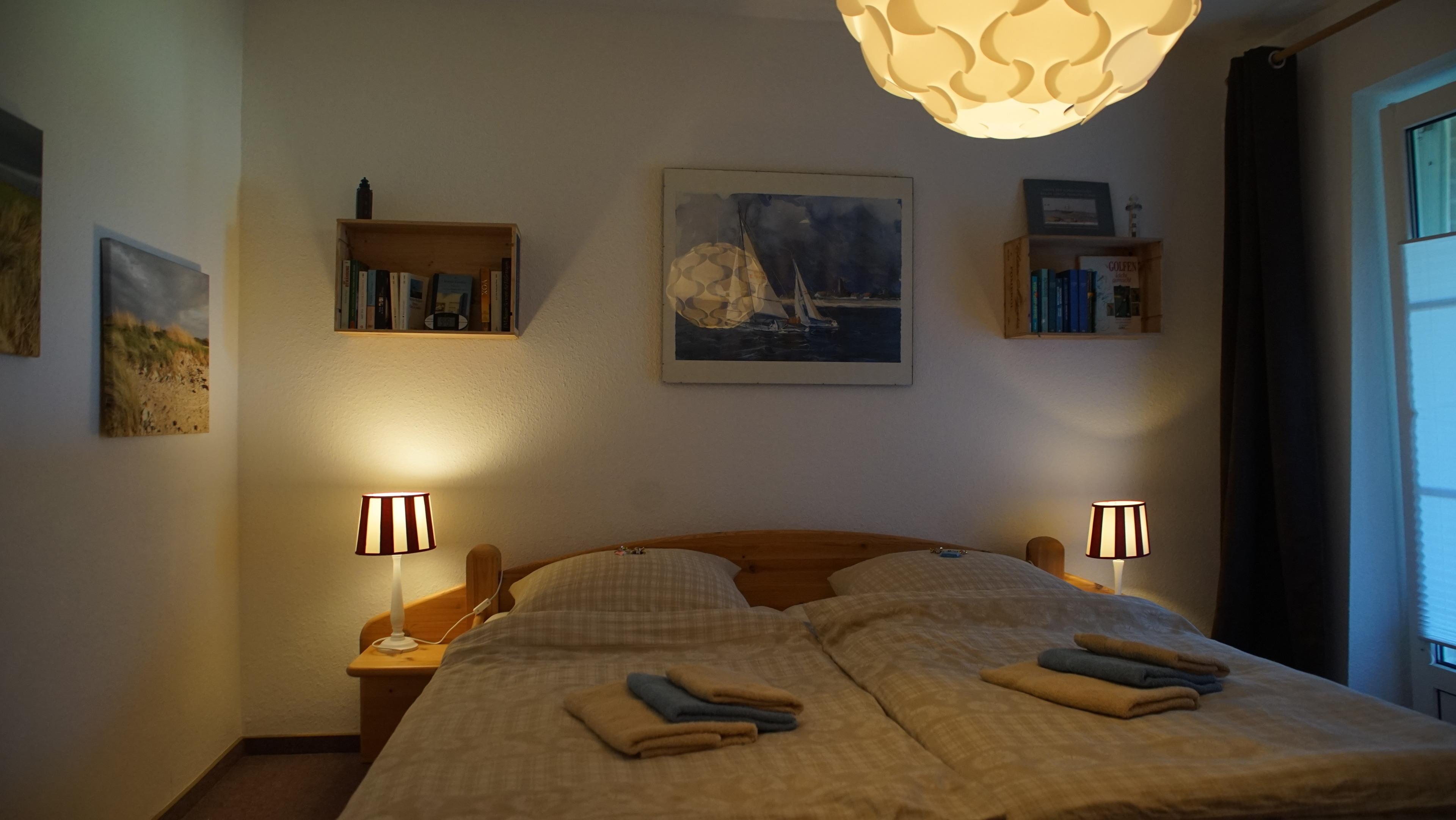 1 Schlafzimmer mit Doppelbett und 1 Schlafzimmer mit 2 Einzelbetten. Sie können zusätzlich gerne ein Babybett aufstellen.