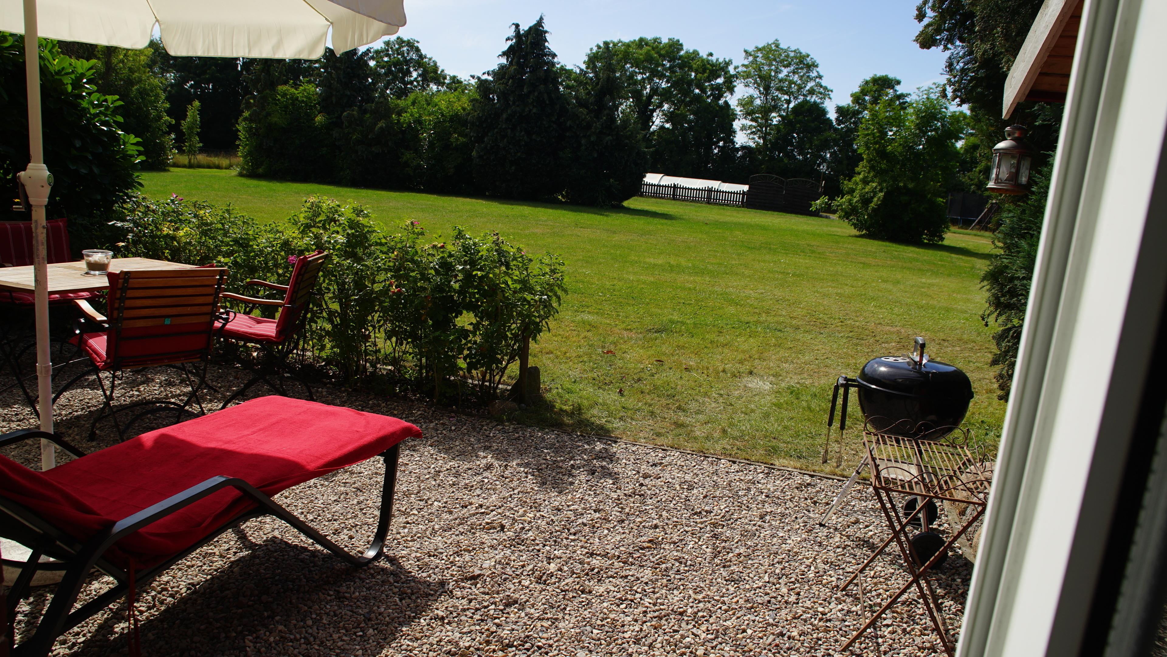 Auf der großen, mit einer Sitzgruppe, einem Webergrill und Liegen ausgestatteten Terrasse können Sie bis spät in den Abend die Sonne und den Blick auf den riesigen ca. 4000qm großen Garten genießen.
