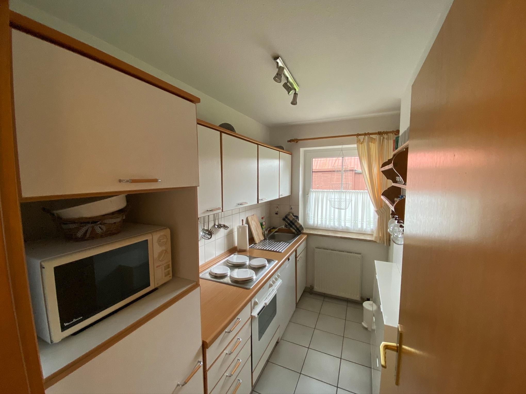 Die vollausgestattete Küche bietet unter anderem eine Spülmaschine, Mikrowelle, Herd mit Backofen und diverse Küchengeräte.