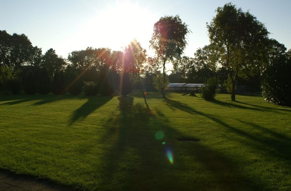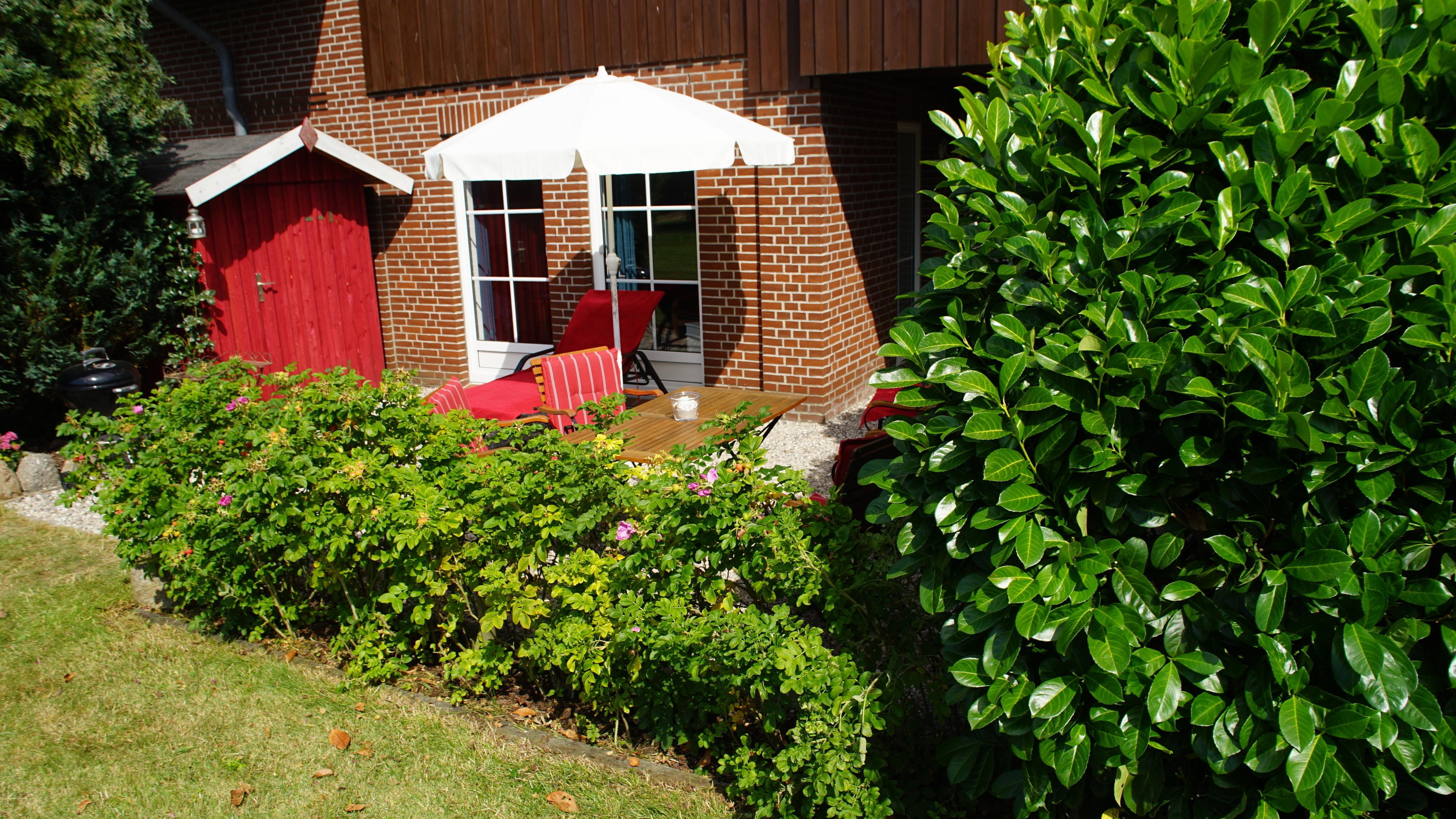 Direkt an der Terrasse steht ein schönes Gartenhäuschen zum Abstellen von Strandutensilien o.ä. Im hinteren Teil des Gartens befindet sich ein Kinderspielplatz mit Trampolin.