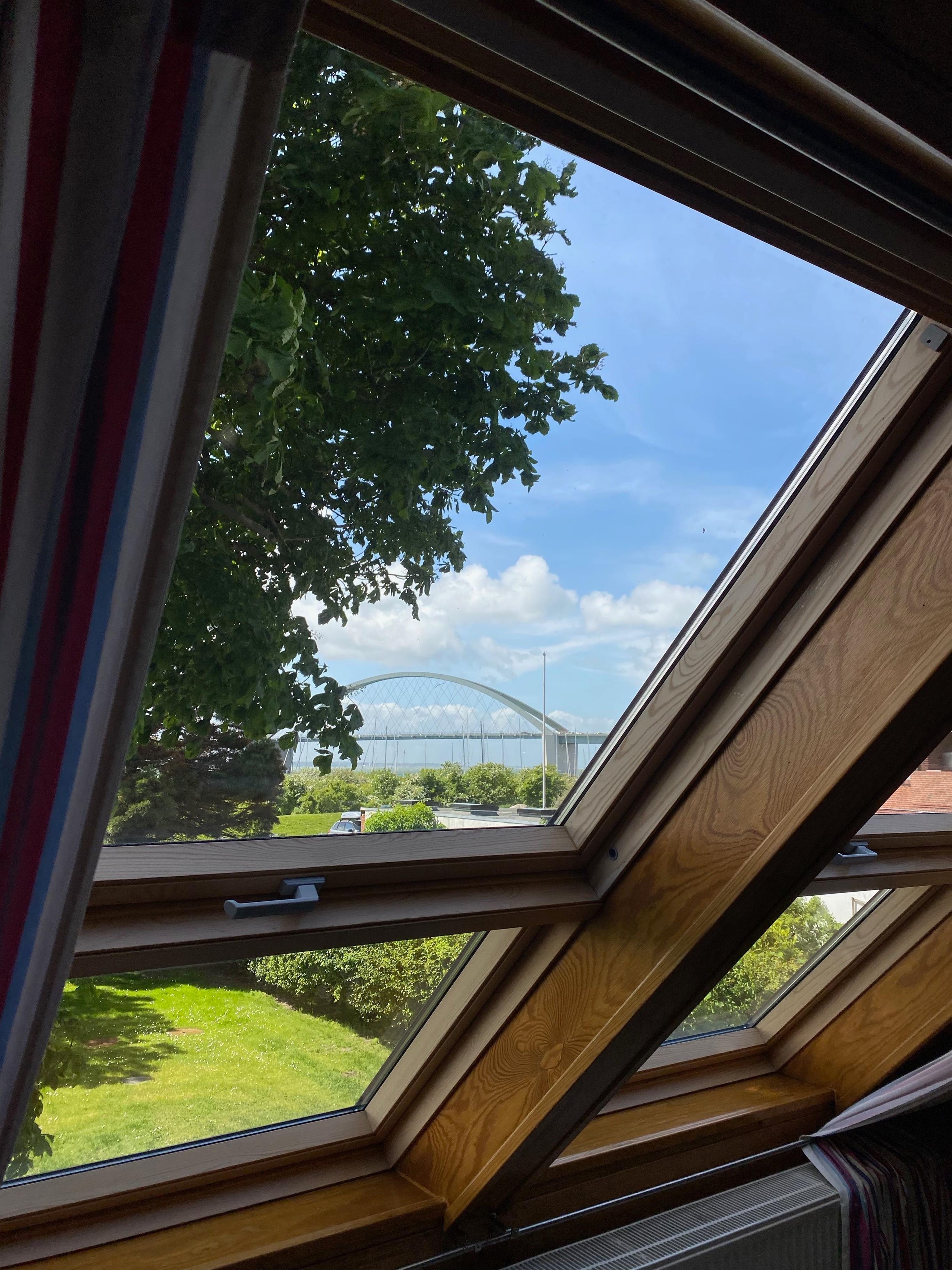 Das Obergeschoss verfügt über einen großen Wohn-/Schlafraum mit herrlichem Blick auf den Sund und die Brücke und ist mit zwei Einzelbetten und separatem Sofa ausgestattet. Außerdem gibt es ein weiteres Schlafzimmer mit Doppelbett (200 x 160) und Waschtisch