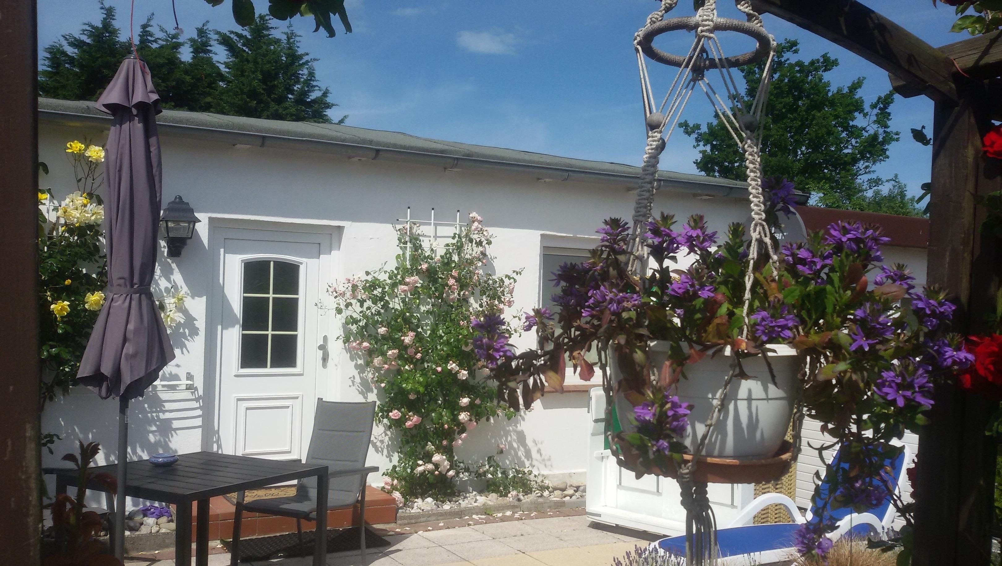 einer Terrasse mit Gartentisch und Stühlen, 2 Hotelliegen, Sonnenschirm und Strandkorb. Die mitgebrachten Fahrräder können untergestellt werden.
