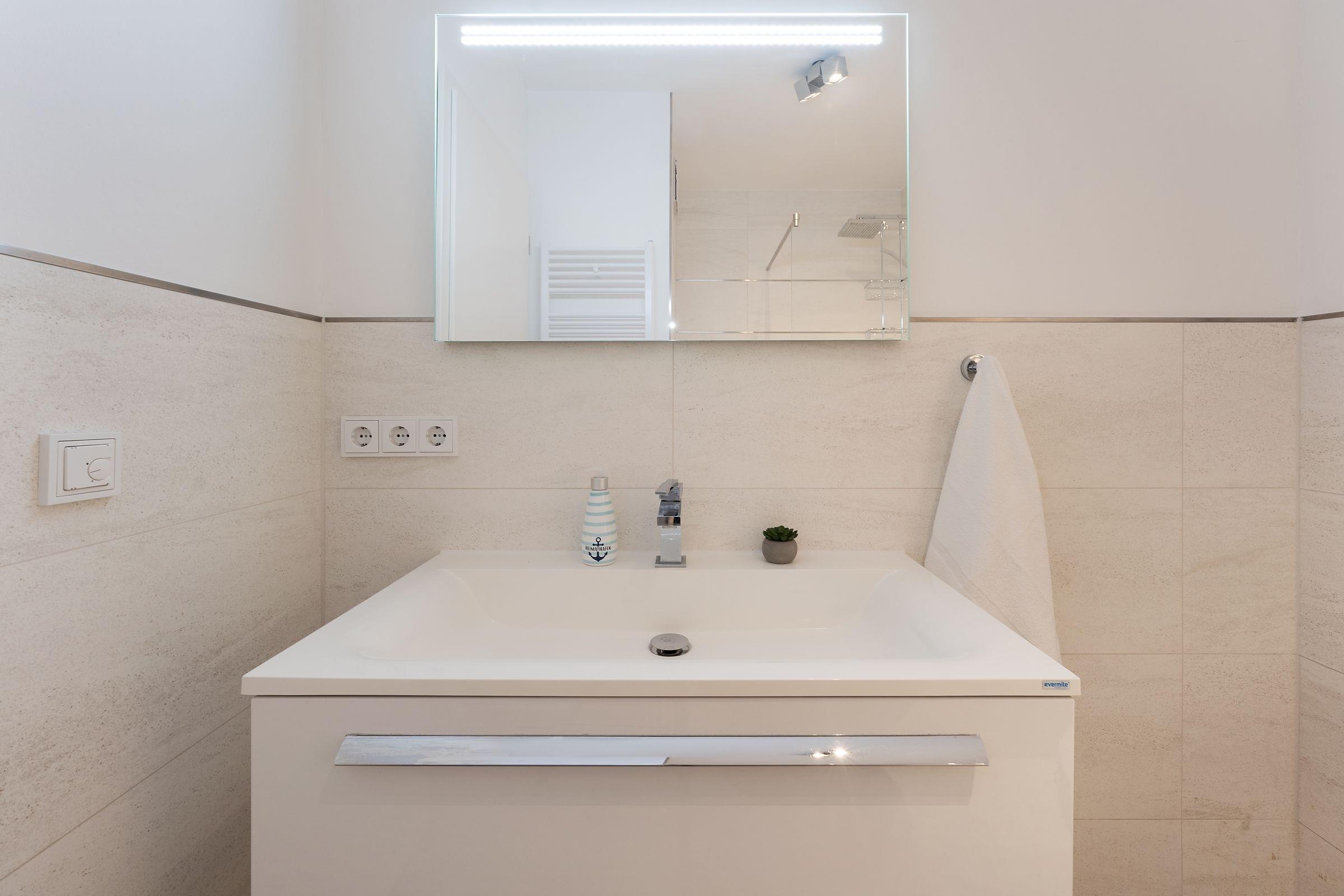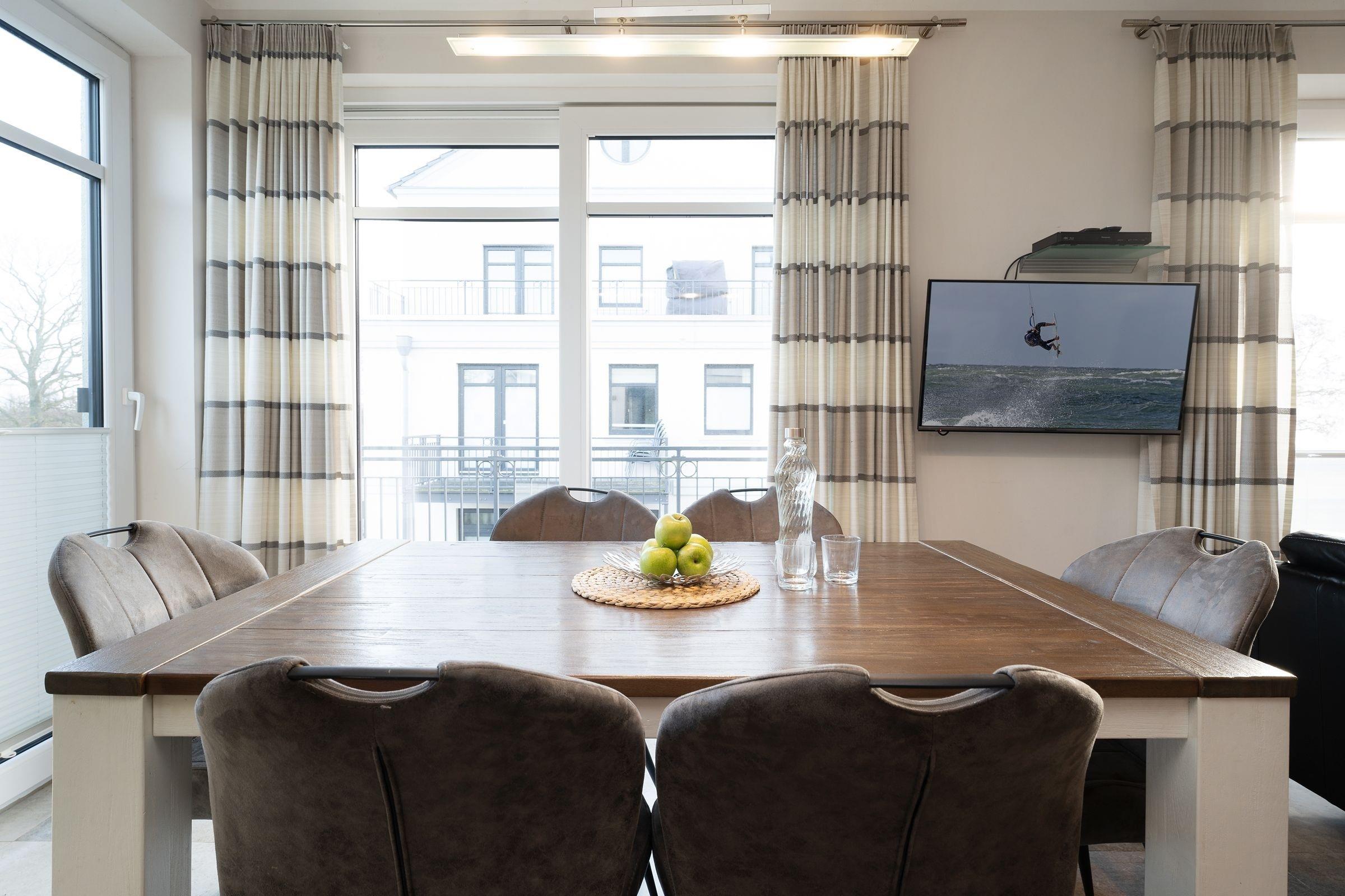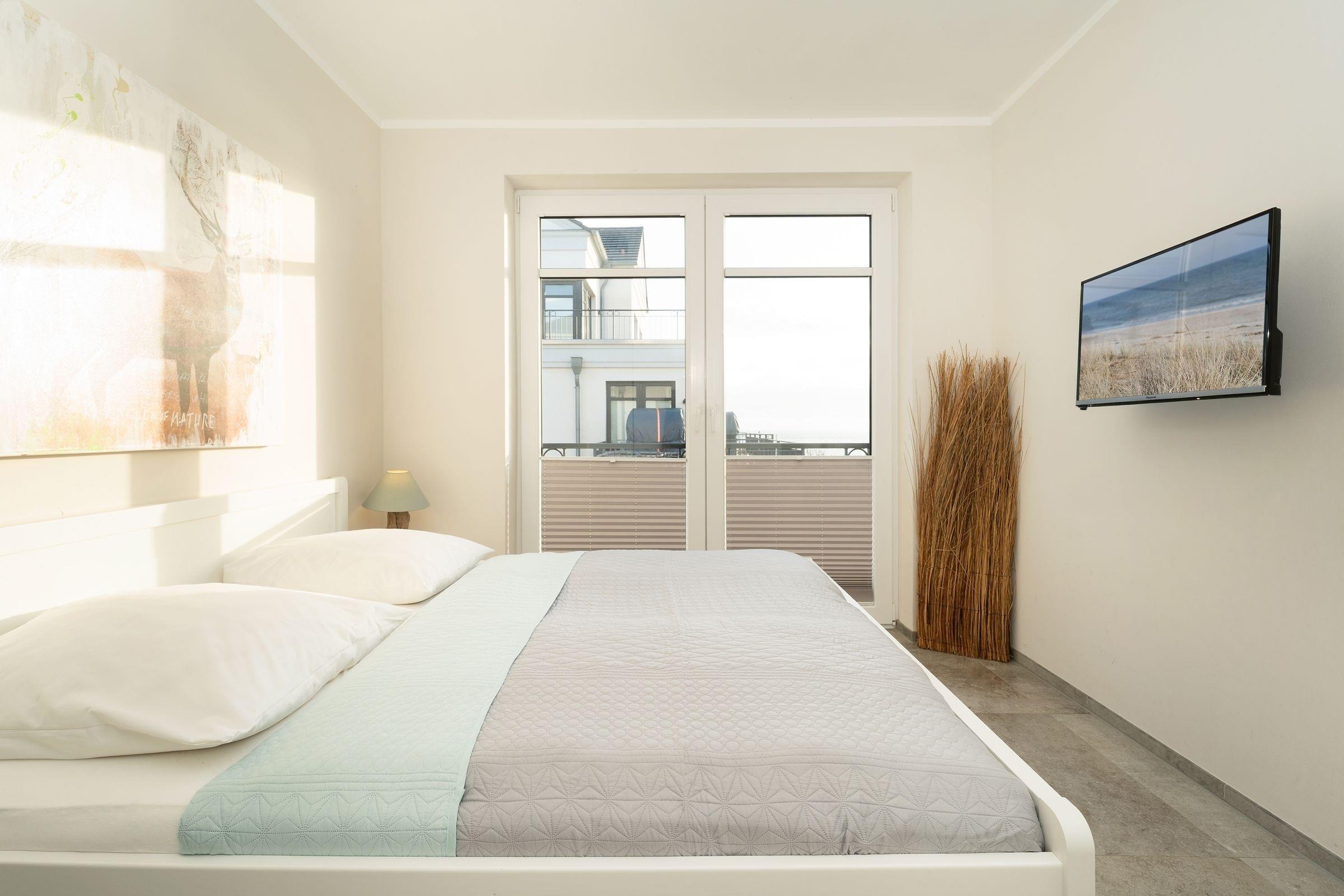 Lichtdurchflutende Fenster mit Blick auf die Ostsee und eine moderne, offene und sehr gut ausgestattete Küche mit angrenzendem Ess- und Wohnbereich laden Sie zum Erholen ein. Es gibt drei Schlafzimmer mit jeweils einem Doppelbett und einem TV-Gerät. Die zwei hochwertig ausgestatteten Duschbäder, eins davon mit einem Fenster, haben jeweils eine bodengleiche Dusche. Die Wohnung ist komplett gefliest und mit einer Fußbodenheizung ausgestattet. Der möblierte Balkon mit Meerblick und Strandkorb lädt zum Entspannen und Verweilen ein.