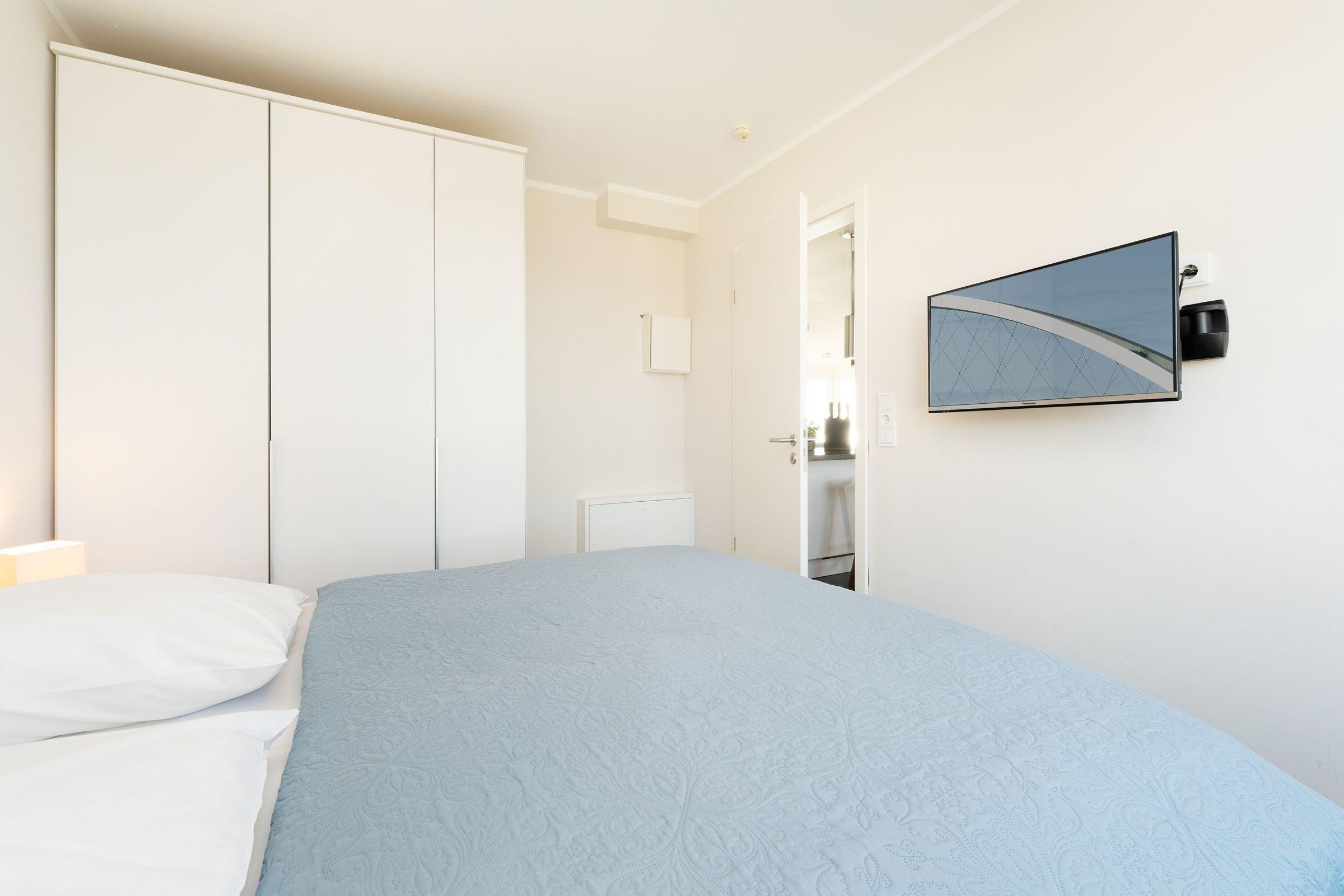 Schlafzimmer 1: Doppelbett, Kleiderschrank, TV