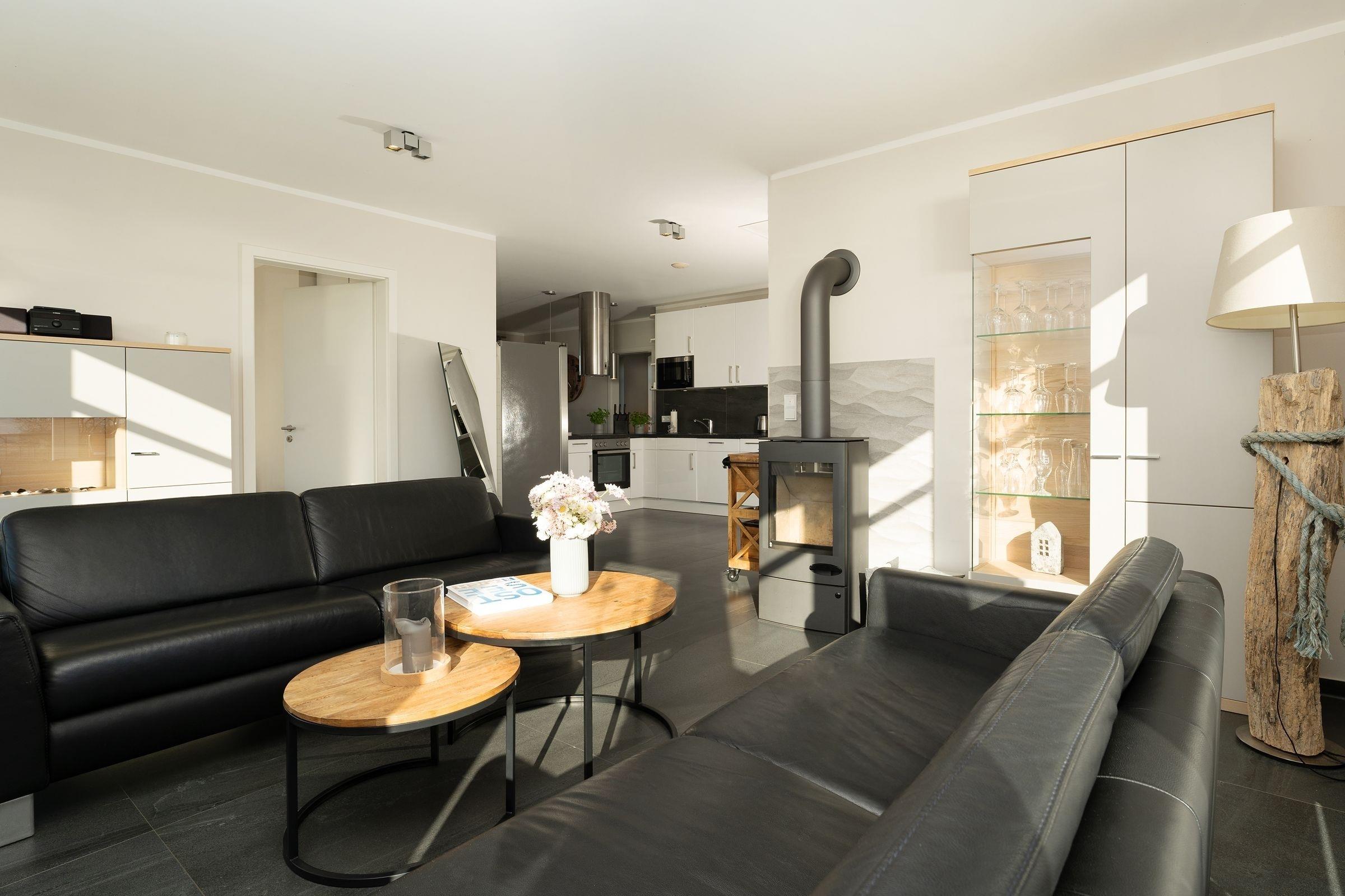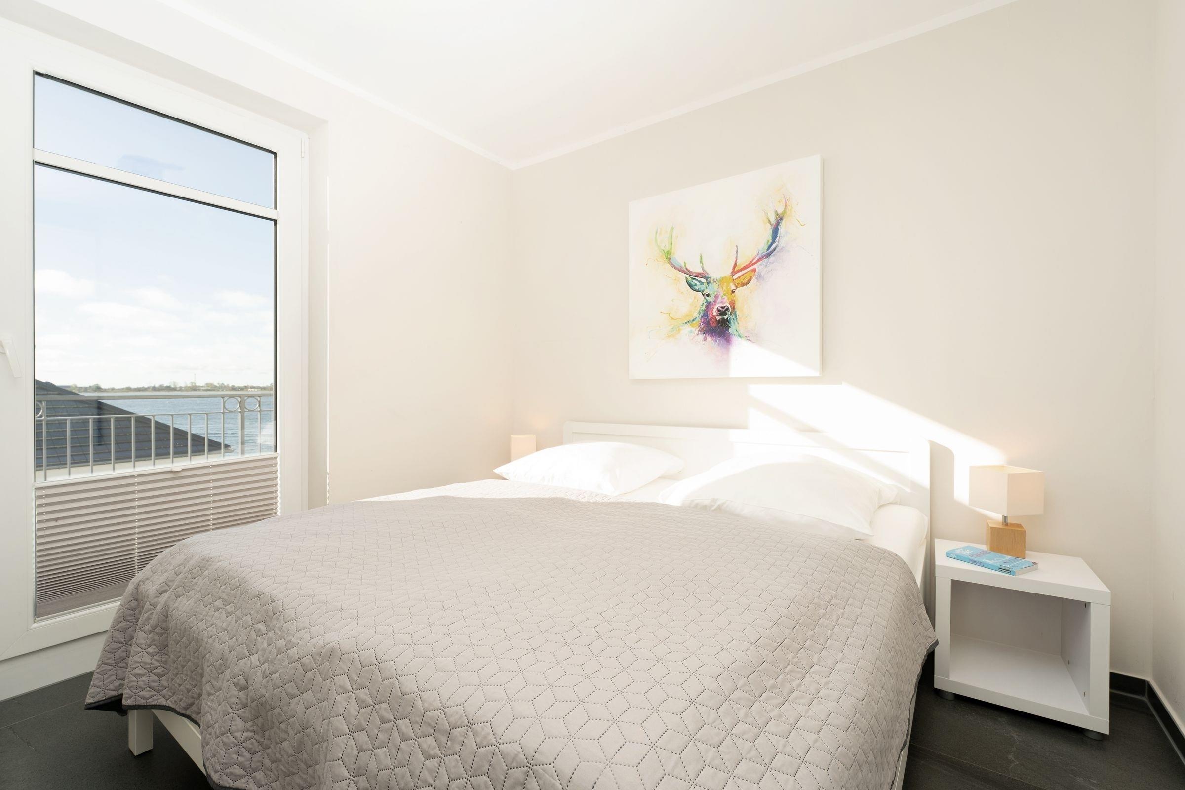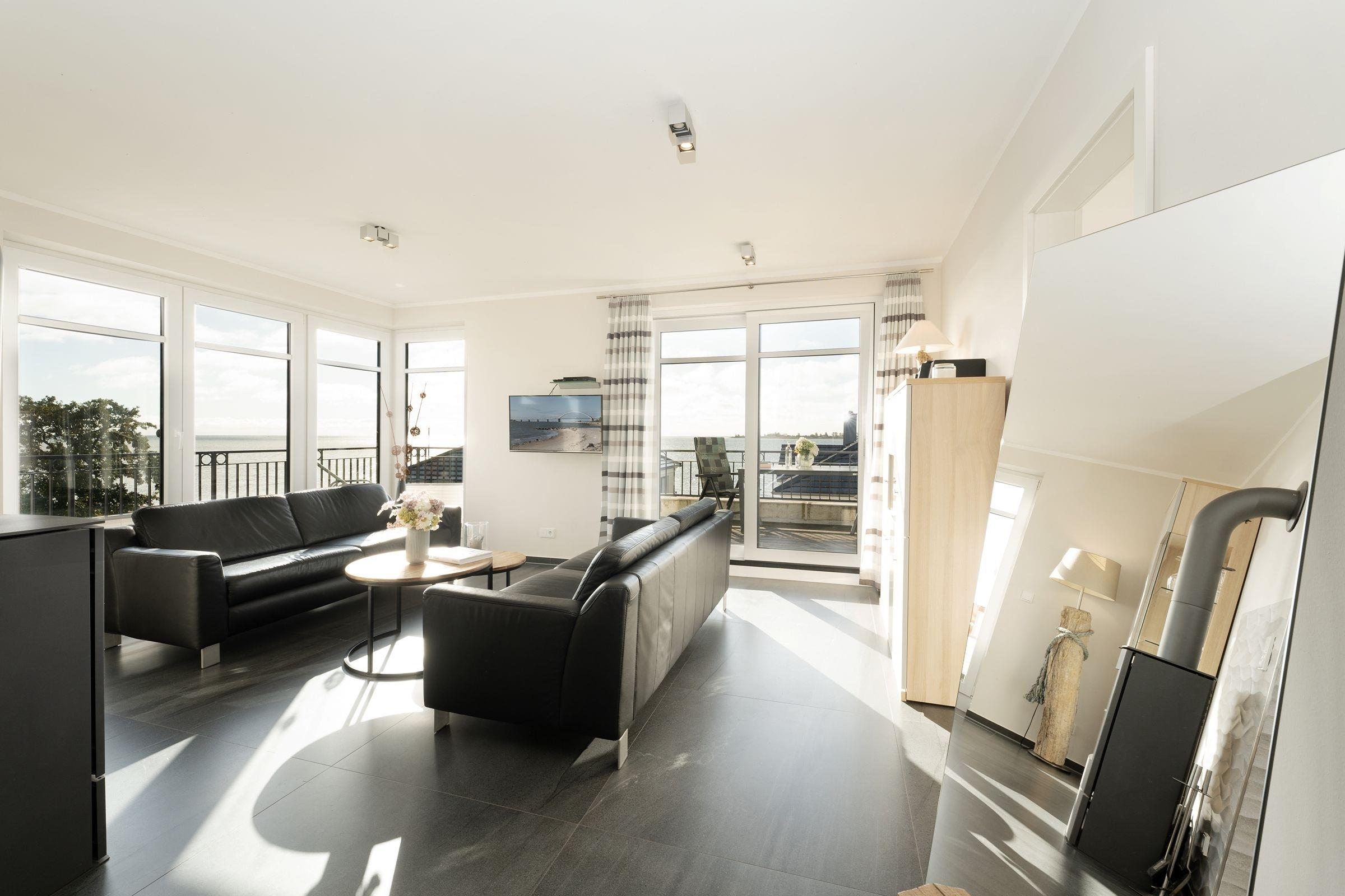 In bester Lage von Fehmarnsund: Exklusive 4-Zimmer-Ferienwohnung im 2. Stock mit Balkon und einer Größe von ca. 100 m² für bis zu 4 Personen. Mit einer eigenen Sauna, einem Weinkühlschrank, einem Ofen im Wohnbereich sowie traumhaften Meerblick bietet diese moderne Wohnung Urlaub der Extraklasse.
