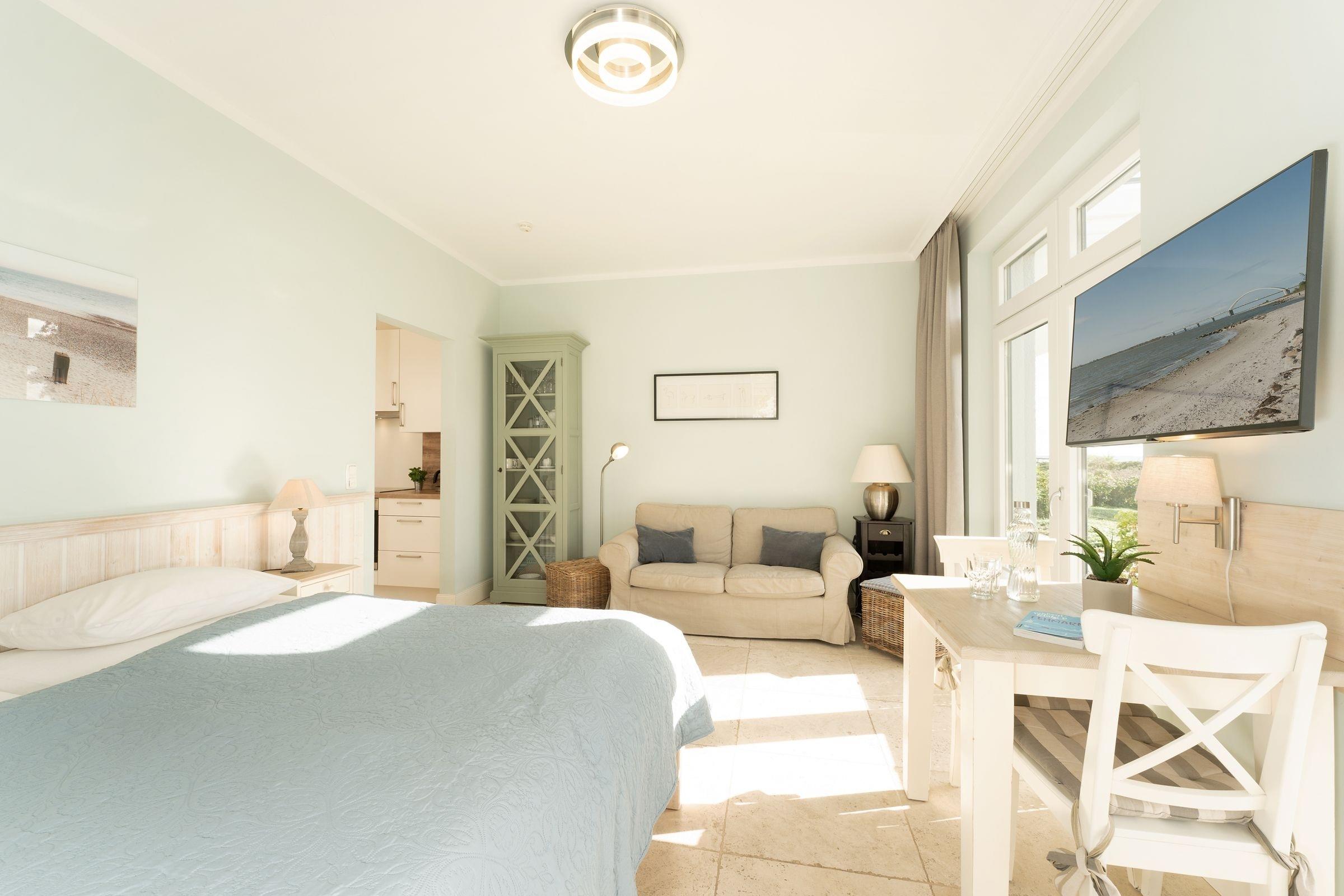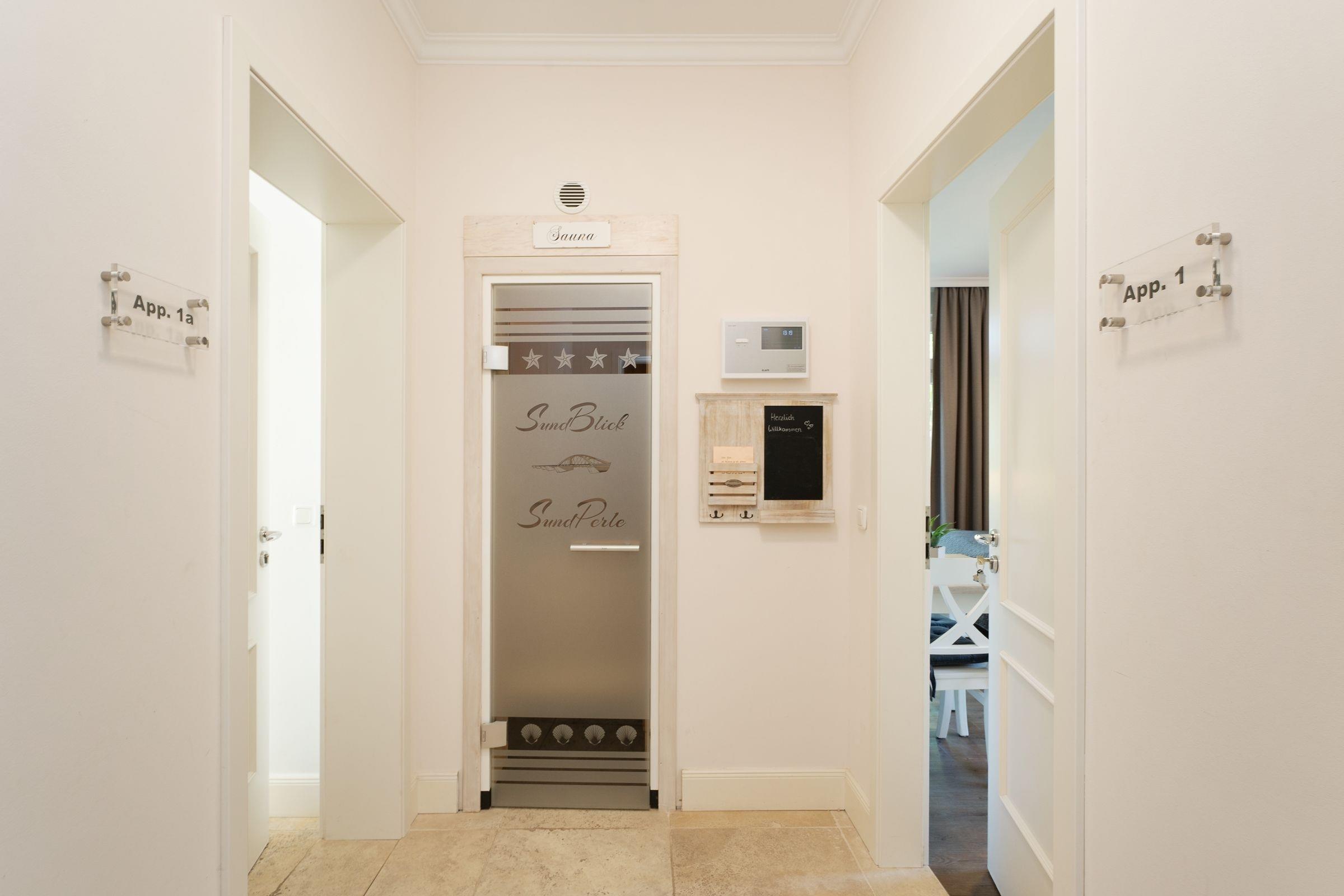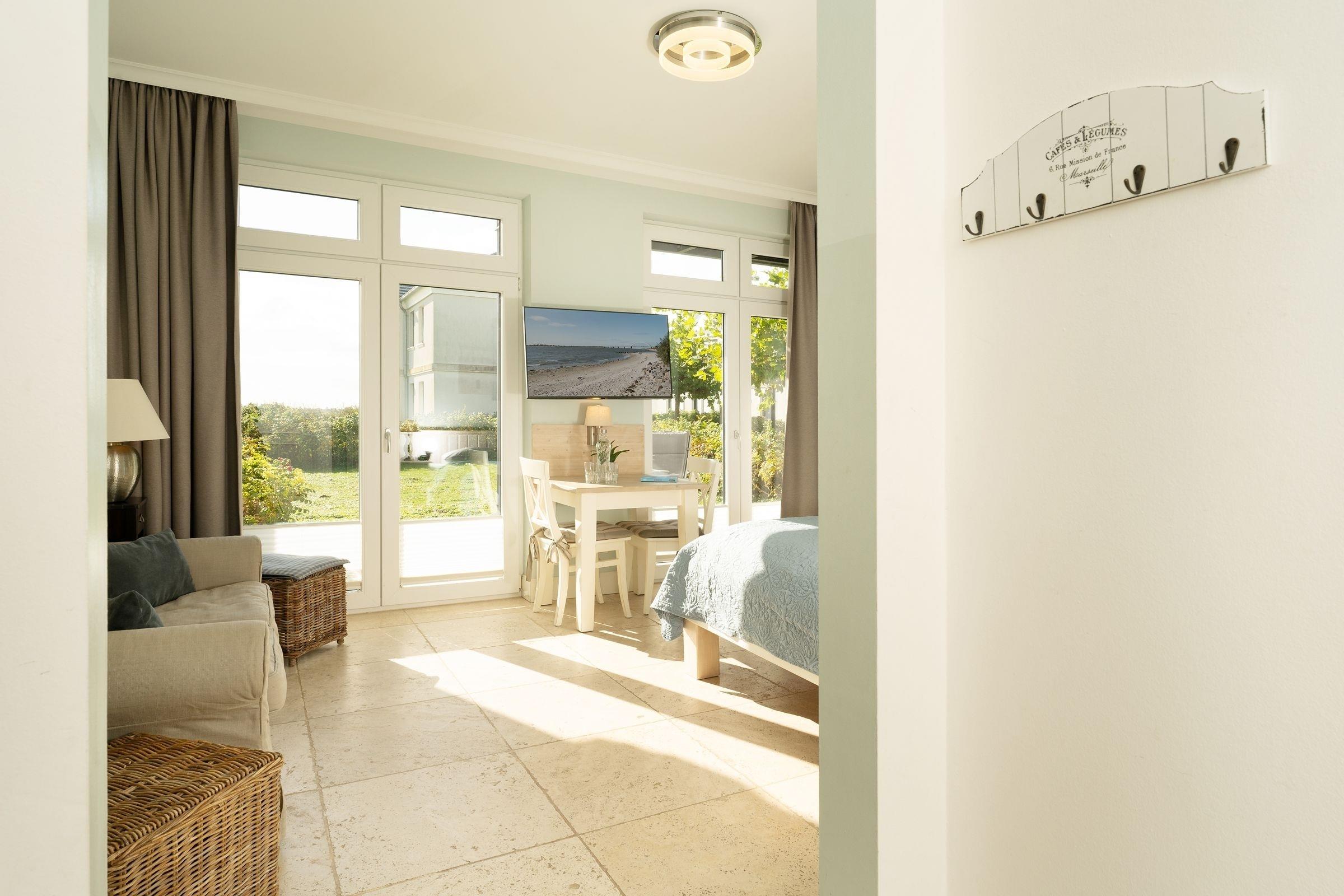 Das modern ausgestattete Appartement mit herrlichem Meerblick verfügt über alles, was Sie für einen erholsamen Urlaub an der Ostsee benötigen. Das Appartement besteht aus einem kombinierten Wohn-Schlafbereich mit Doppelbett, Couch und Esstisch. Im Eingangsbereich befindet sich eine moderne, sehr gut ausgestattete Einbauküche und eine Garderobe. Das Badezimmer punktet mit einer XL-Dusche. Hinzu kommt eine geräumige möblierte Terrasse mit einem schönen Ostseestrandkorb. Sie ist nach Süden und Westen ausgerichtet und geht direkt in den Garten über, ideal für das morgendliche Frühstück. Als besonderes Highlight steht Ihnen eine moderne Premium-Einbausauna zu Verfügung. Diese ist im Vorflurbereich der Appartements I und IA untergebracht - daher ist eine Absprache mit den Mietern des App. I notwendig, um zeitliche Überschneidungen zu verhindern.