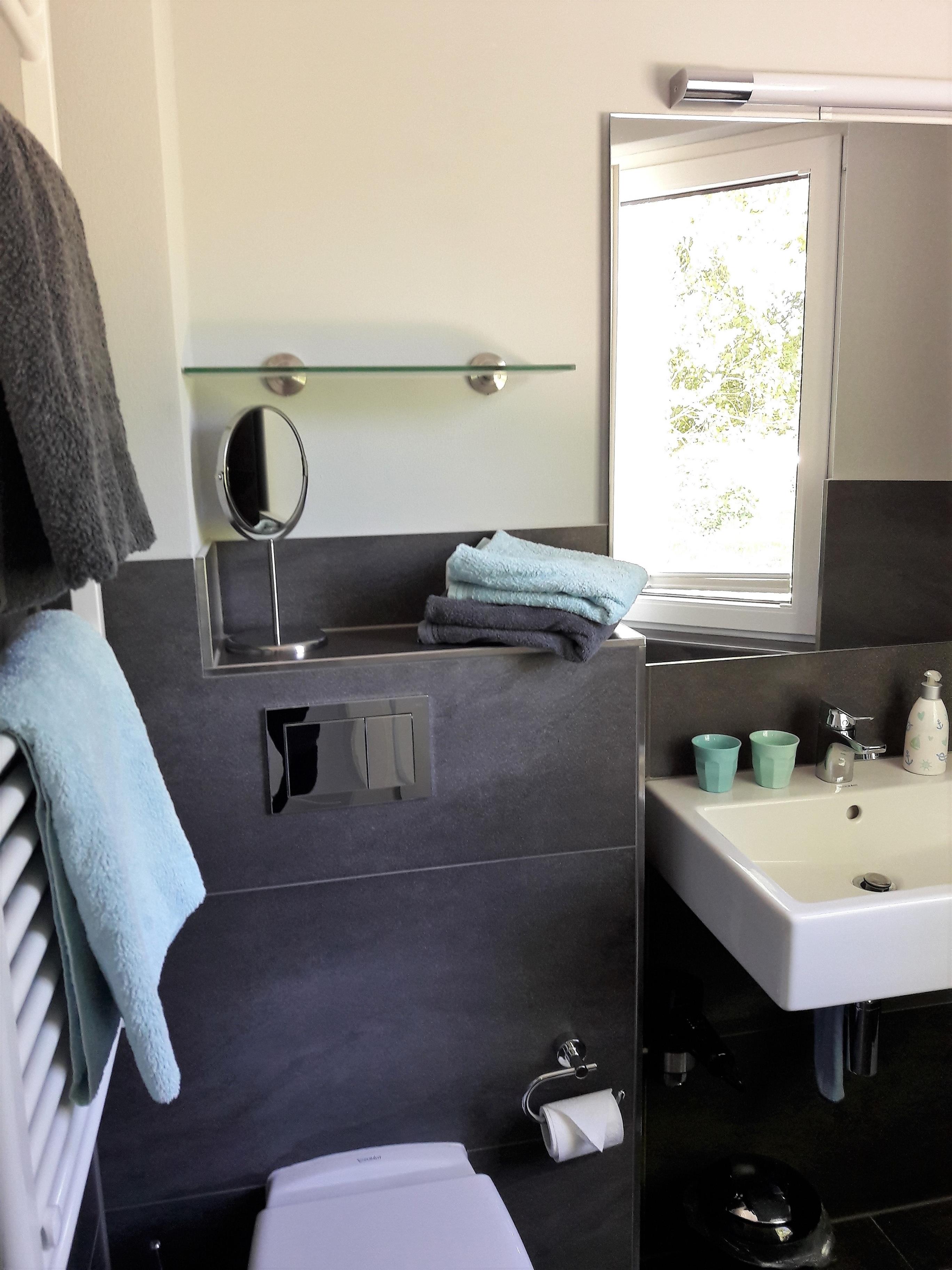 Im Erdgeschoss des ****-Ferienhauses liegen die beiden Schlafzimmer mit Doppelbett und TV ( im Eltern-Schlafzimmer) sowie das moderne Duschbad und ein Abstellraum mit Waschmaschine.