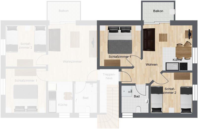 Auf dem sonnigen Balkon lässt es sich herrlich frühstücken, ein Buch lesen oder den Inseltag ausklingen lassen. Parkplätze, ein großer Gemeinschaftsgarten mit Liegewiese und Kinderspielgeräte sind direkt auf dem Grundstück. Im Haus befinden sich insgesamt 4 Wohneinheiten.
