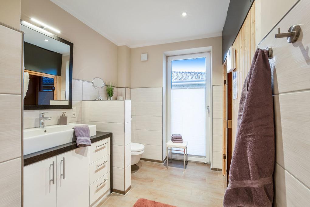 • 1 Wellnessbad mit Sauna, Wellnessliegen, große ebenerdiger Dusche, Whirlpool
