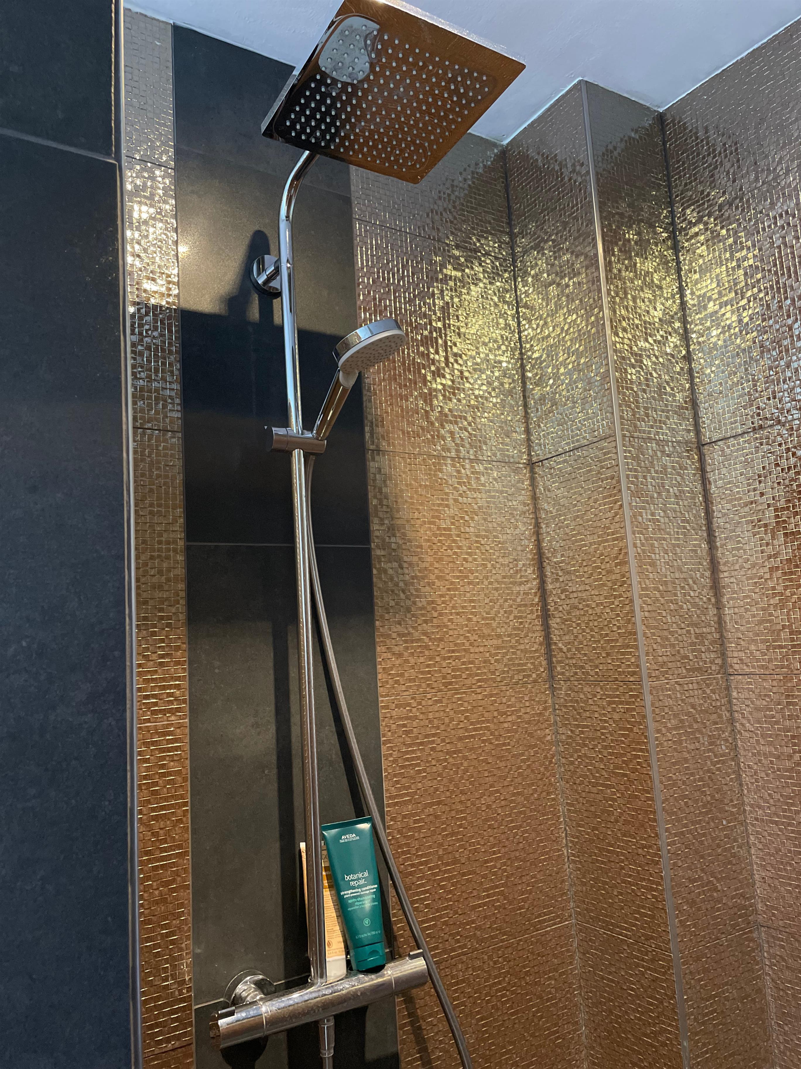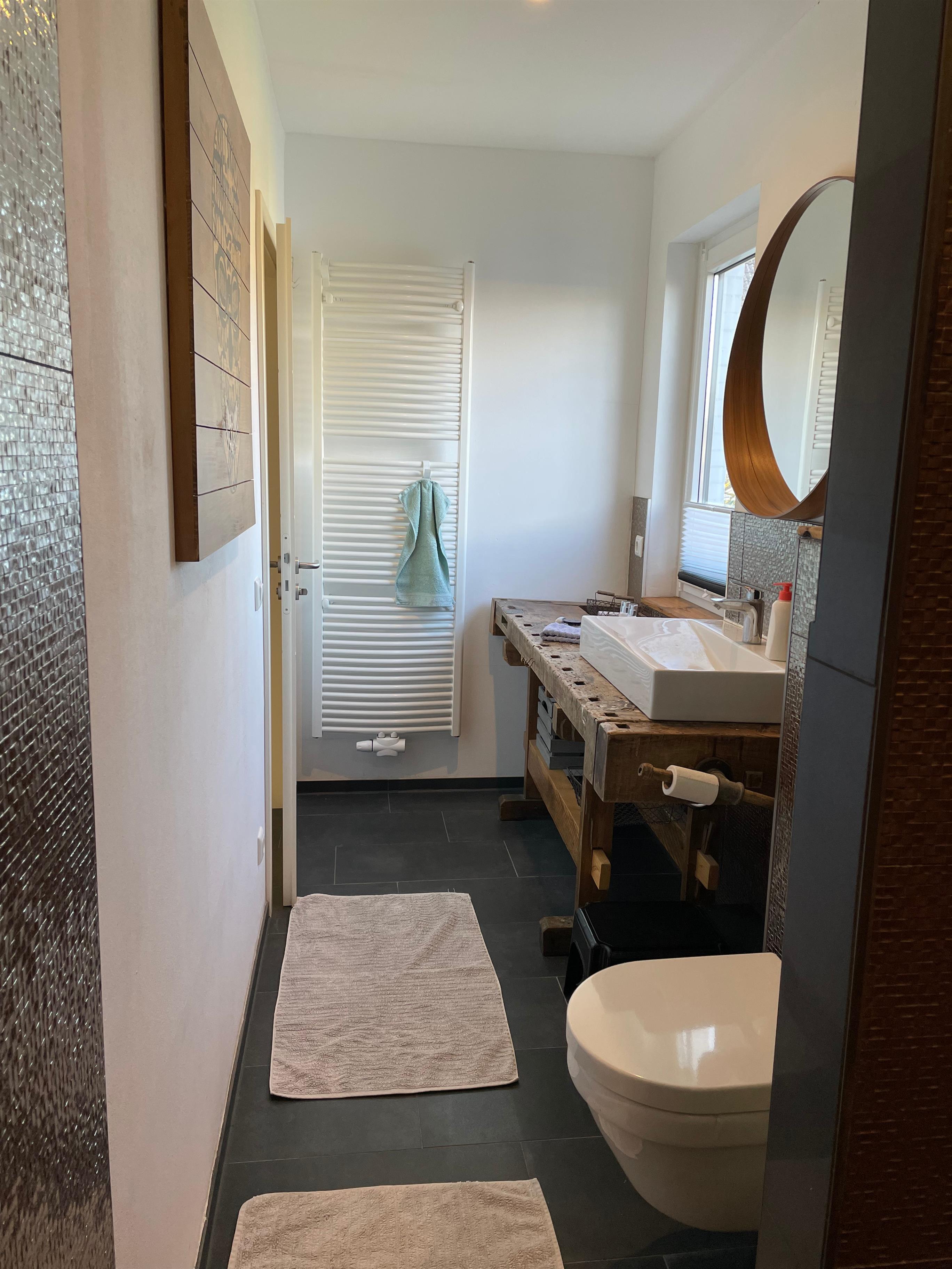 Die Küche ist durch die Form des Studios etwas abgeschieden vom Wohn- und Schlafbereich. Sie ist hervorragend ausgestattet und bietet genügend Platz für gemeinsames Kochen. Über den separaten Flur gelangst du in das Badezimmer. Die barrierefreie Dusche ist sehr groß und bietet einen Hauch von Wellness.