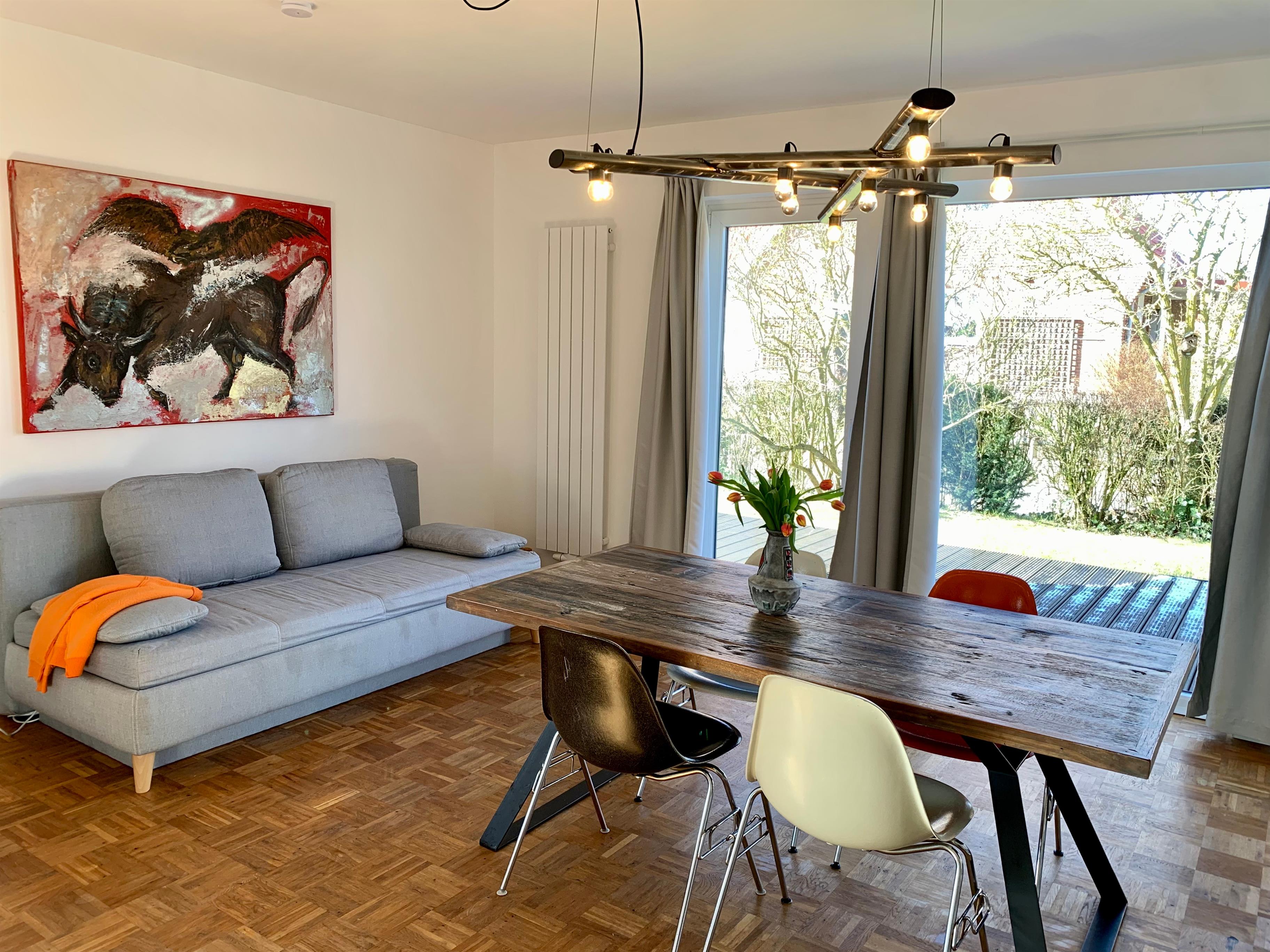 In dem stylischen 60 qm großen Studio in L-Form fühlen sich Paare sowie kleine Familien wie zu Hause. Durch die bodentiefen Fenster scheint ganztags die Sonne in die Wohnung und du genießt einen direkten Zugang über die Terrasse in den Garten.