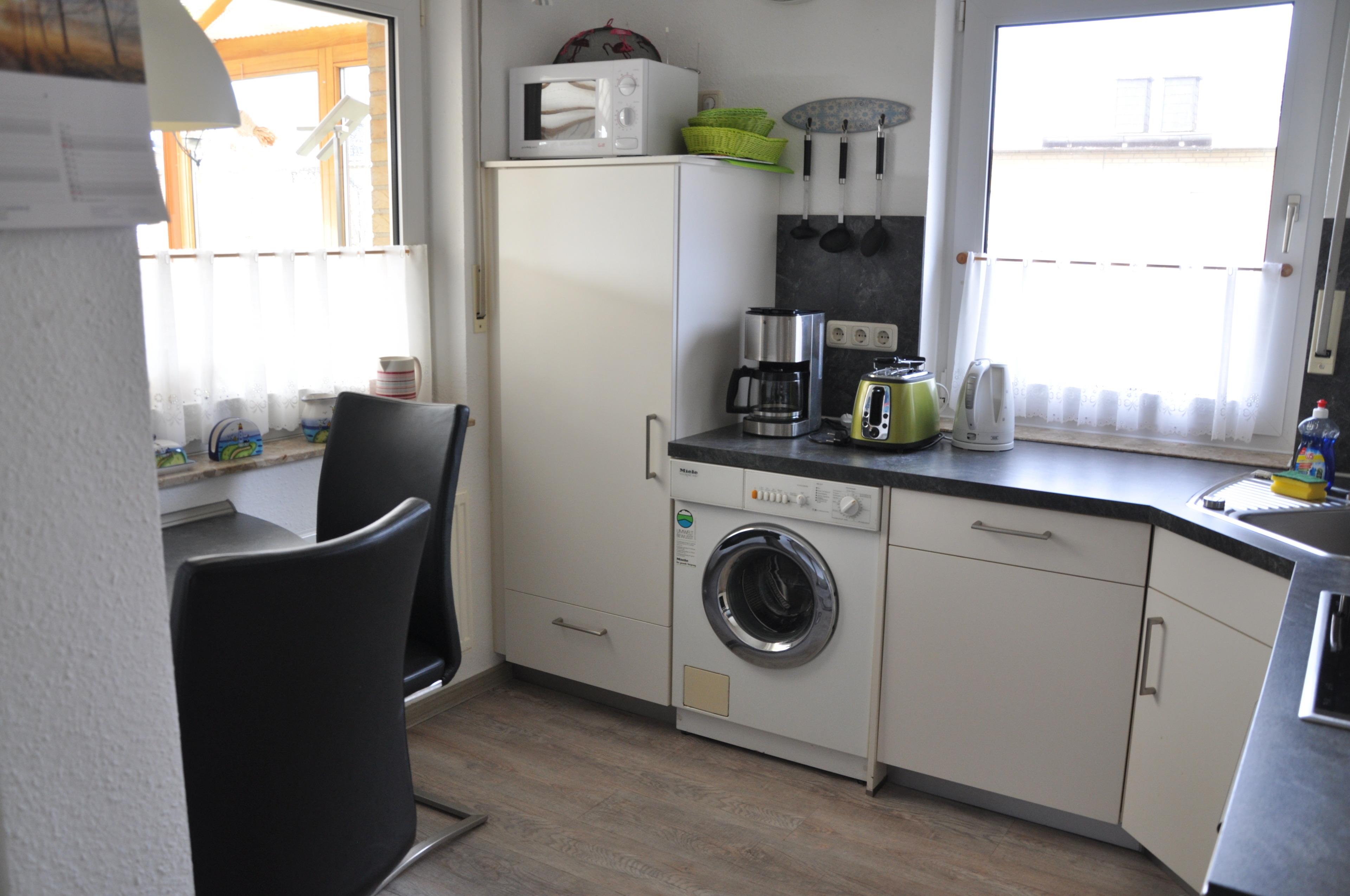Das Schlafzimmer hat ein klassisches Doppelbett, das Kinderzimmer verfügt über ein Hochbett und eine Schlafcouch. Die moderne Küche verfügt über einen Geschirrspüler, Backofen, Cerankochfeld, Dunstabzugshaube, Kühlschrank mit Gefrierfach, Mikrowelle, Kaffeemaschine, Wasserkocher, Mixer, Eierkocher, Toaster und eine Waschmaschine.