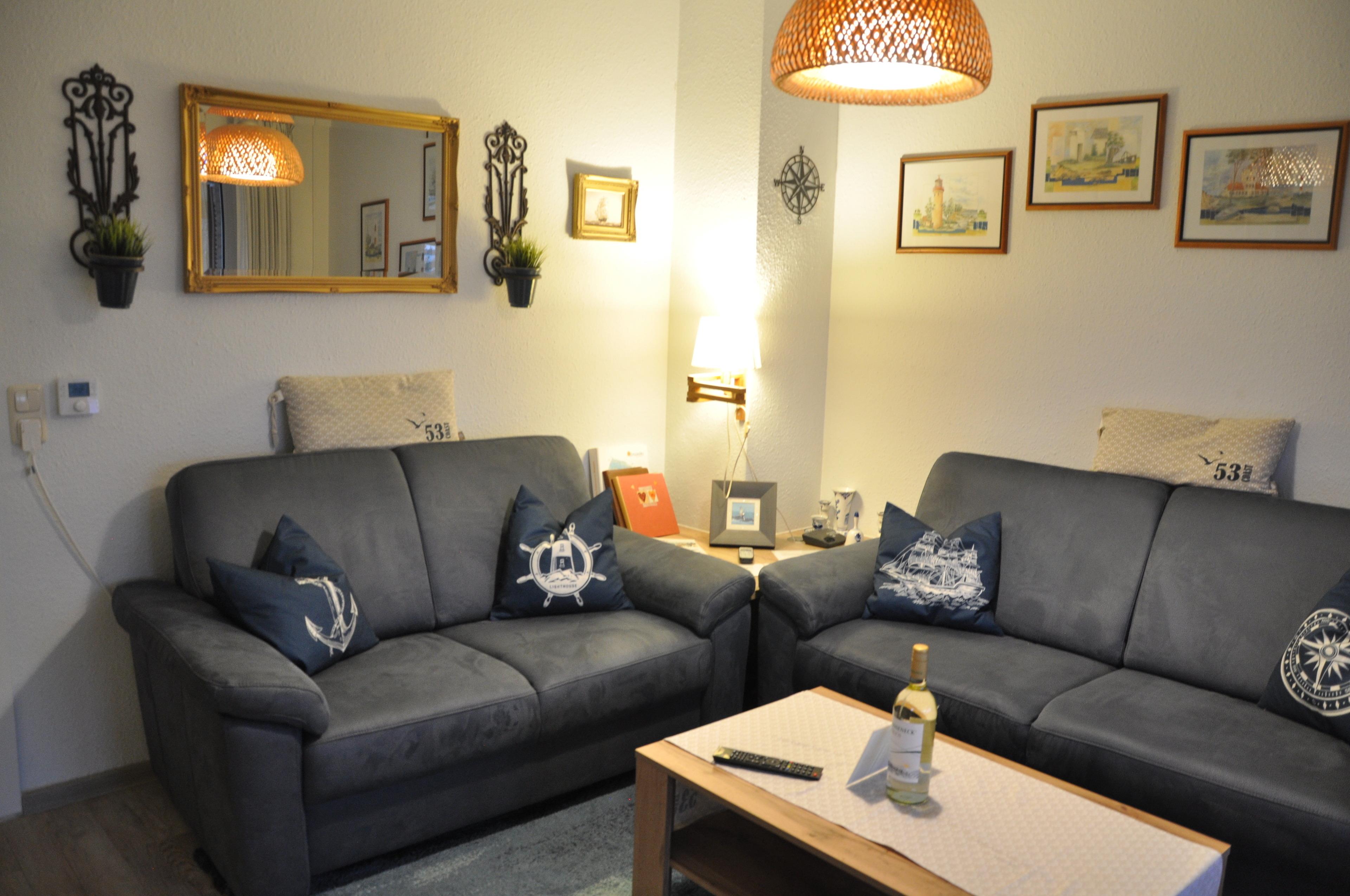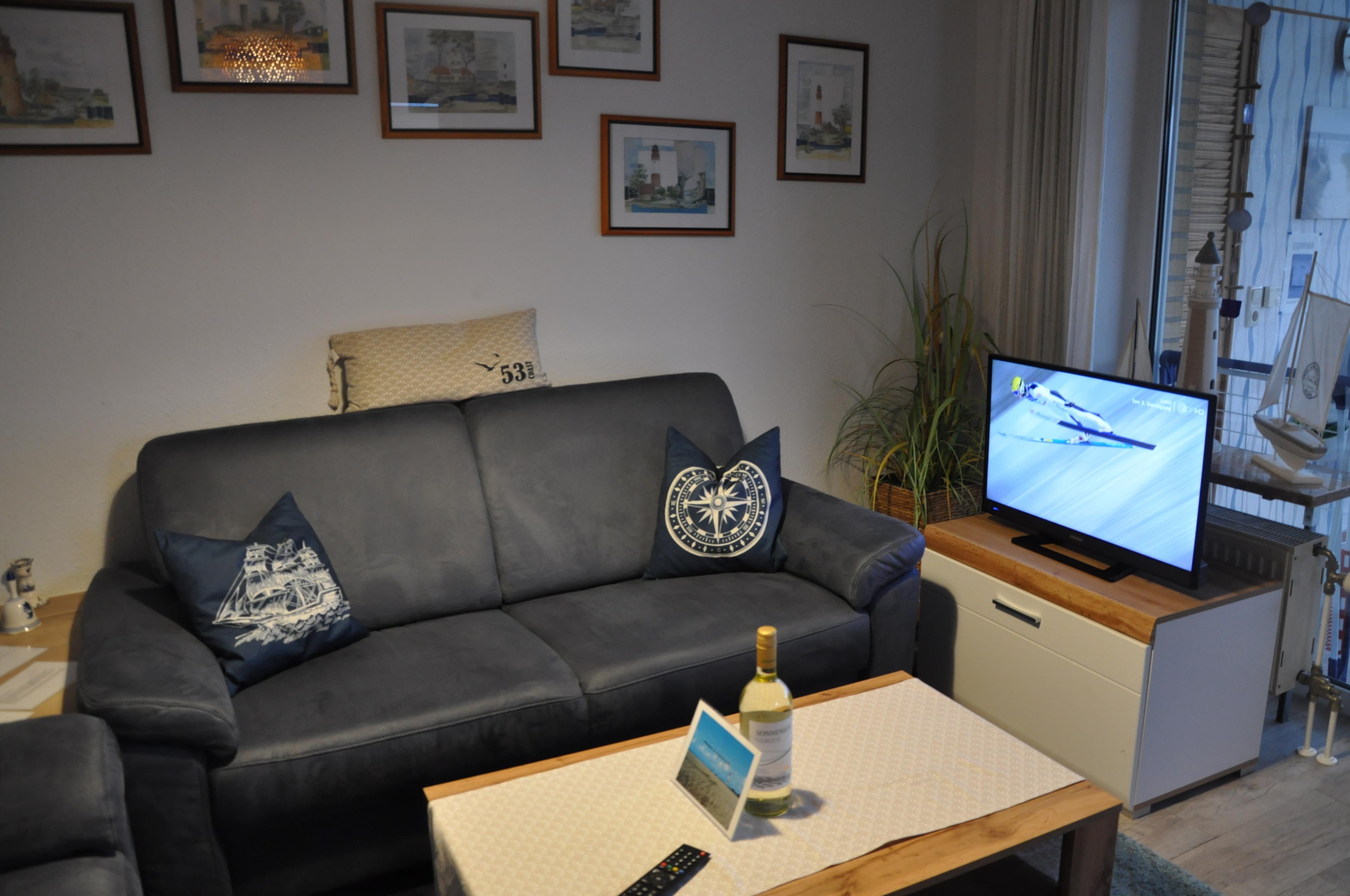 Das angrenzende Wohnzimmer mit Fernseher, Radio (USB/ Bluetooth/CD), DVD- Player, Funktelefon, LAN und WLAN-Anschluss steht für gemütliche Abende zur Verfügung. (Telefonate (ohne kostenpflichtige Nummern) in das deutsche Festnetz stehen sowie der LAN/WLAN kostenlos zu Ihrer Verfügung.