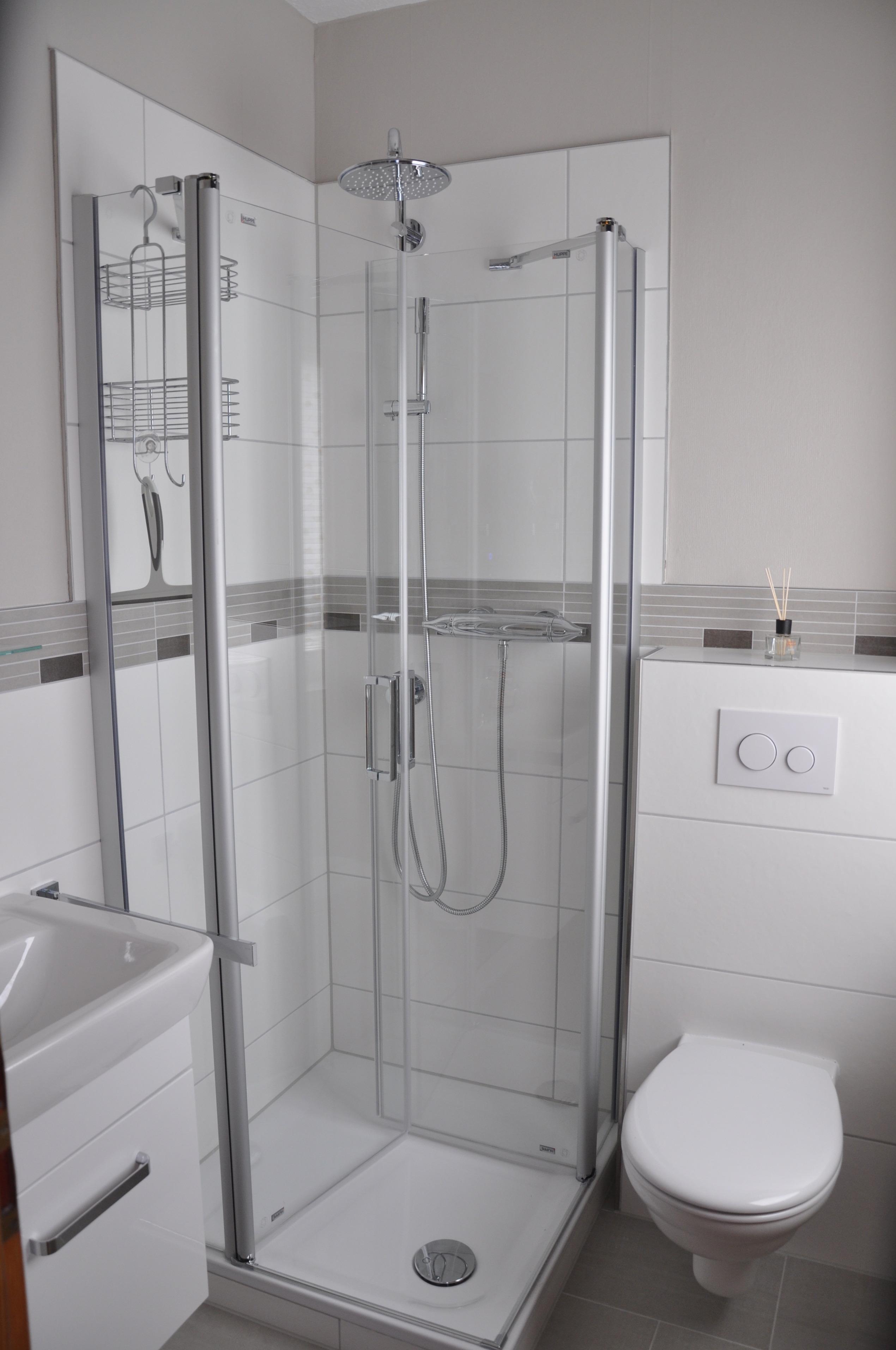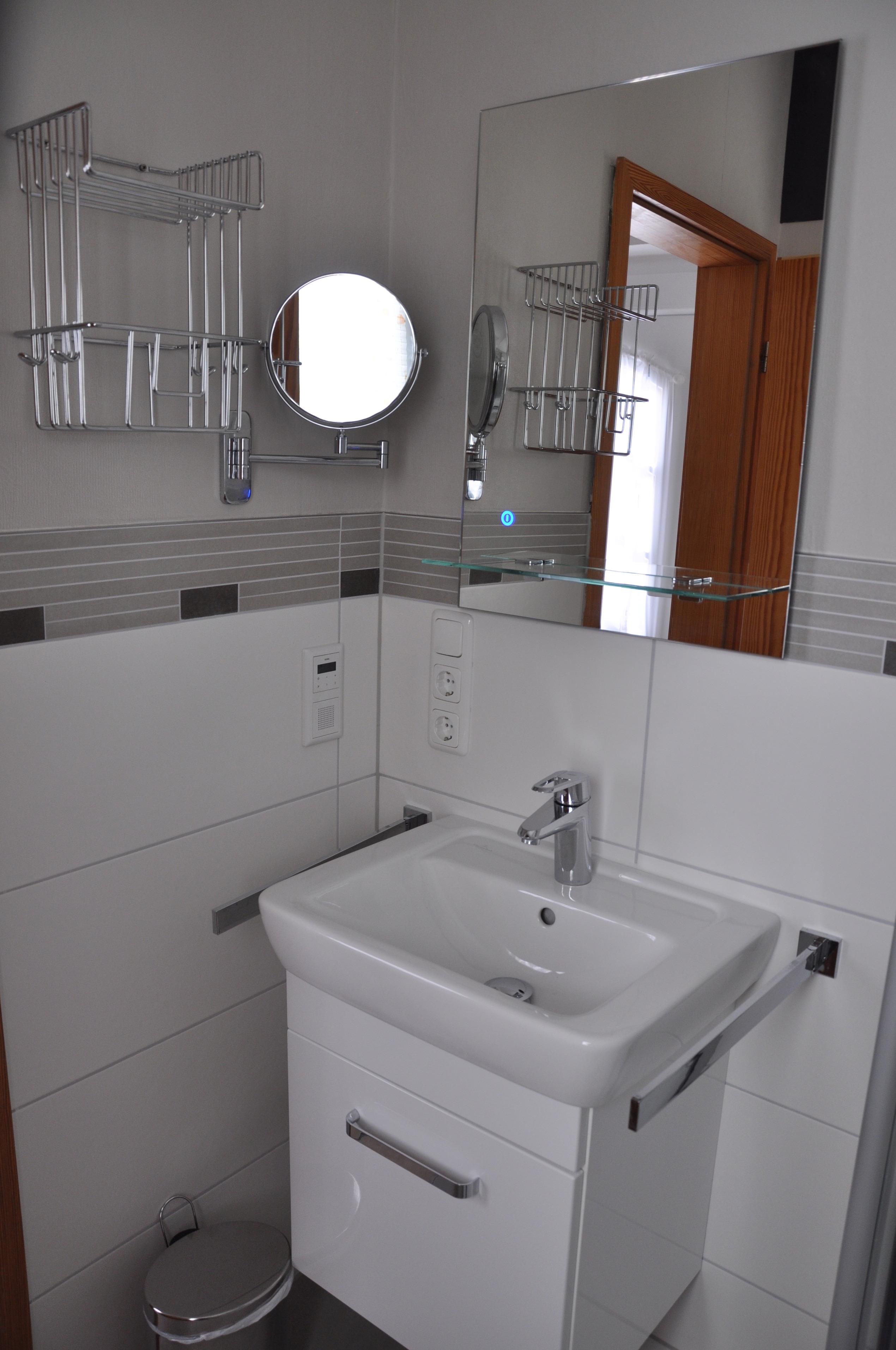 Das Bad verfügt über ein Waschtisch, ein WC, eine Dusche mit zusätzlicher Regenbrause, Radio, Kosmetikspiegel sowie einen Fön.