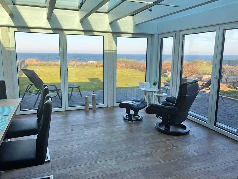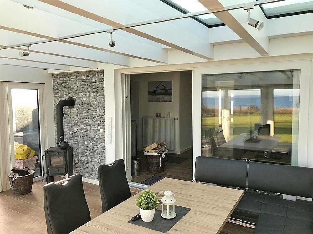 Es erwarten Sie ein großzügiger Wohnbereich mit Kaminofen und angrenzender offener Küche. Ein großer Wintergarten mit Essplatz und einem weiteren Kaminofen und herrlichem Ausblick schließt sich an.
