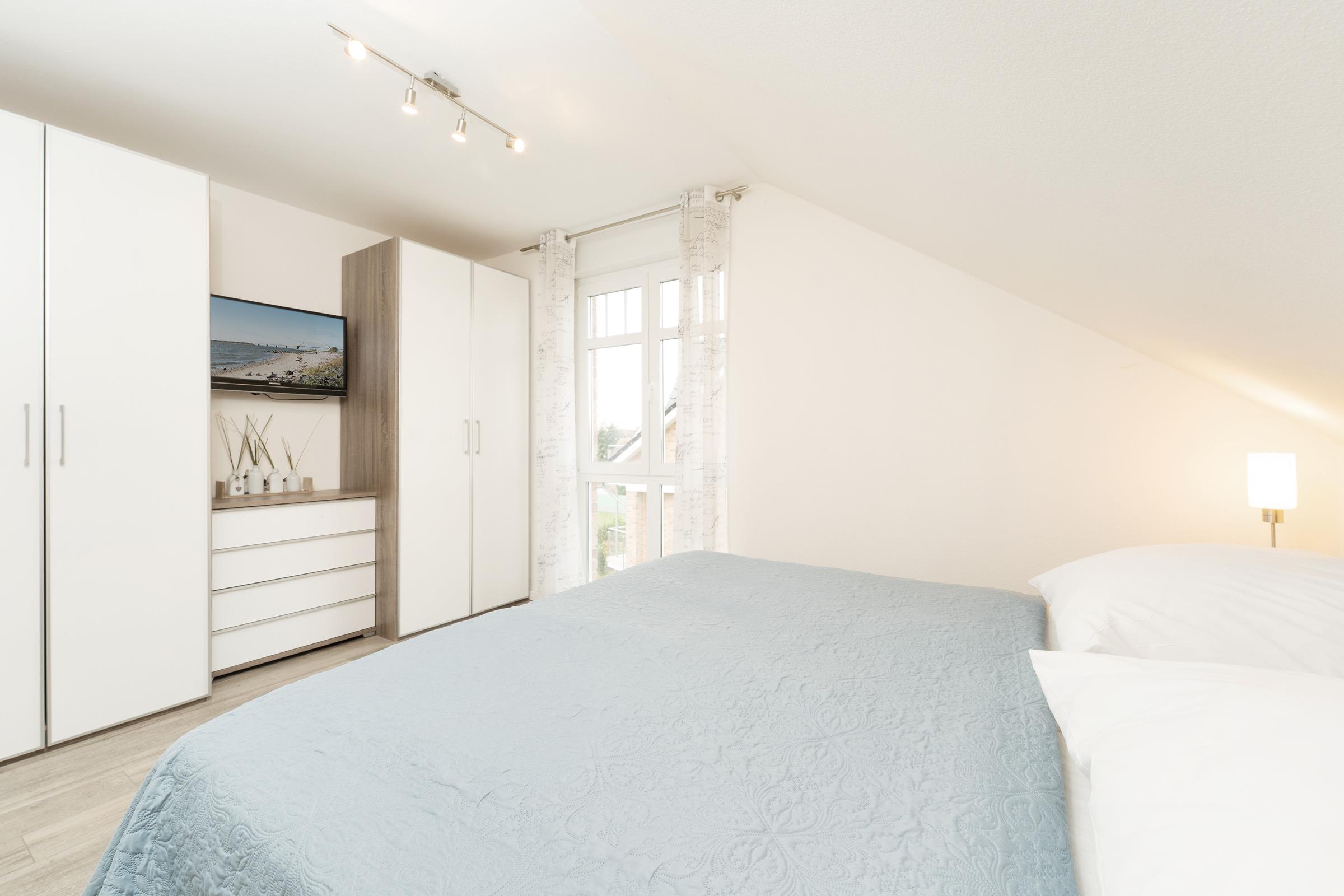 Schlafzimmer: Boxspring-Doppelbett (ca. 180x200cm), Kleiderschrank, Verdunkelung (Außenjalousien), TV, Platz für Kinderreisebett vorhanden