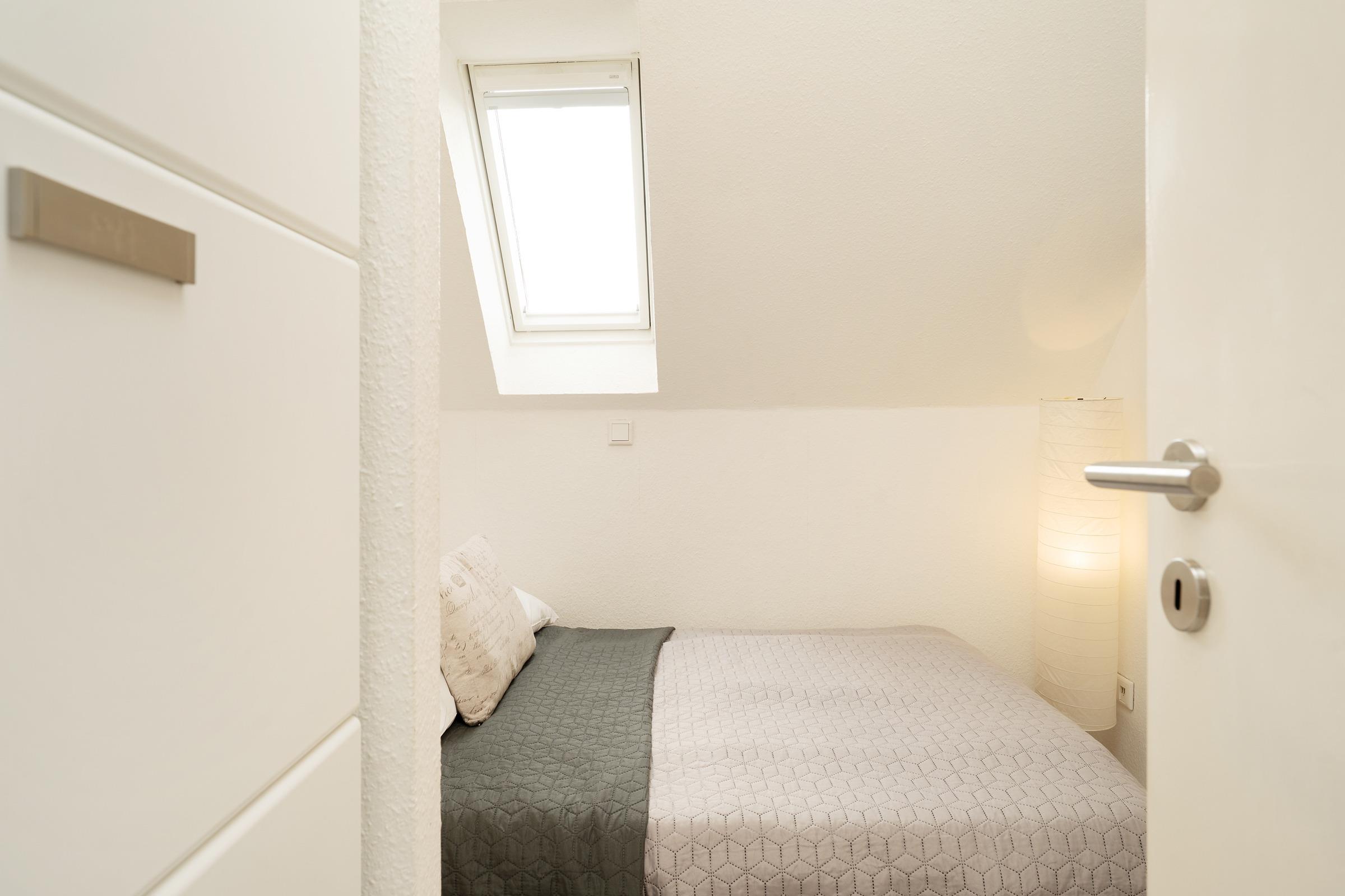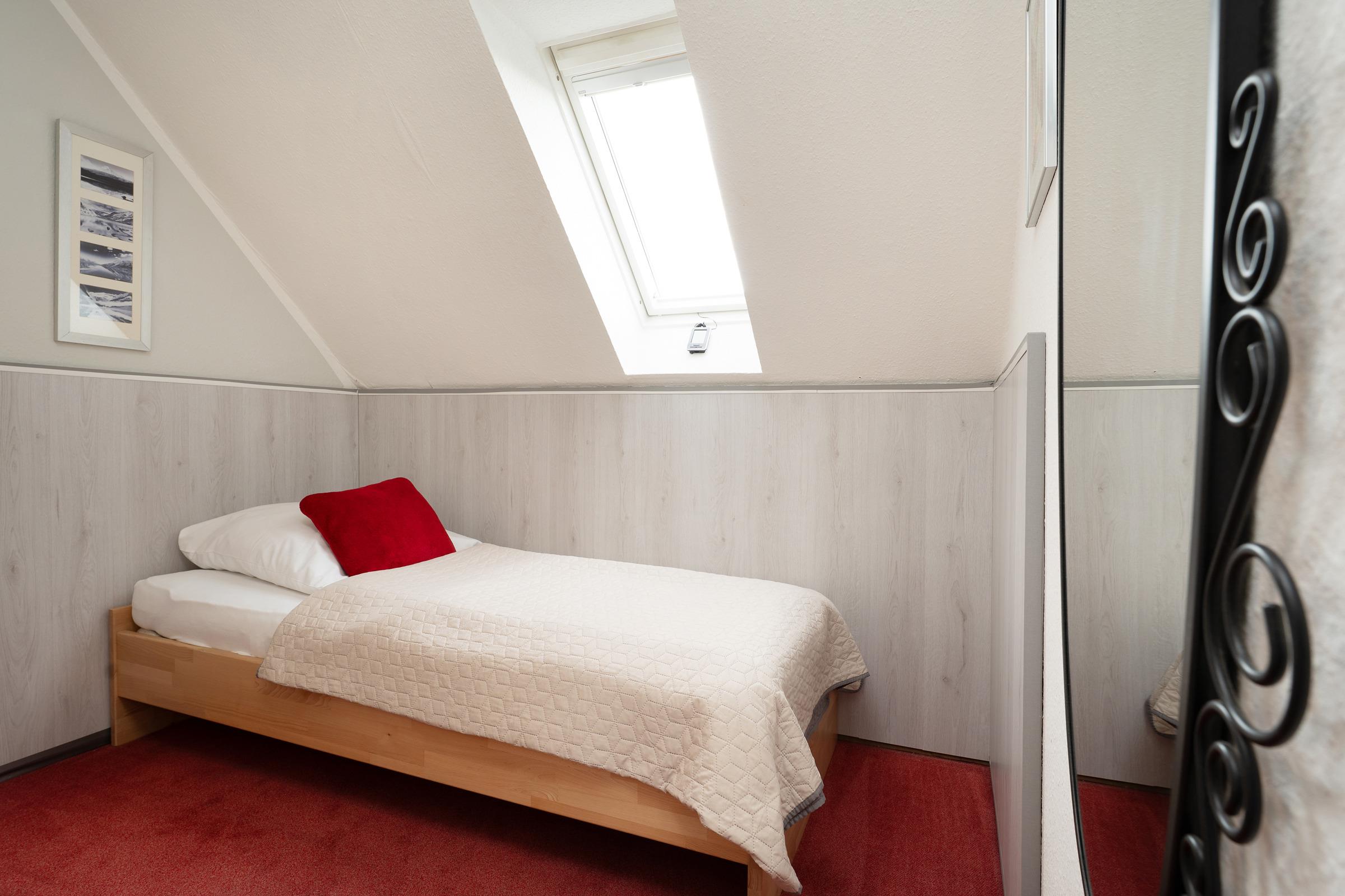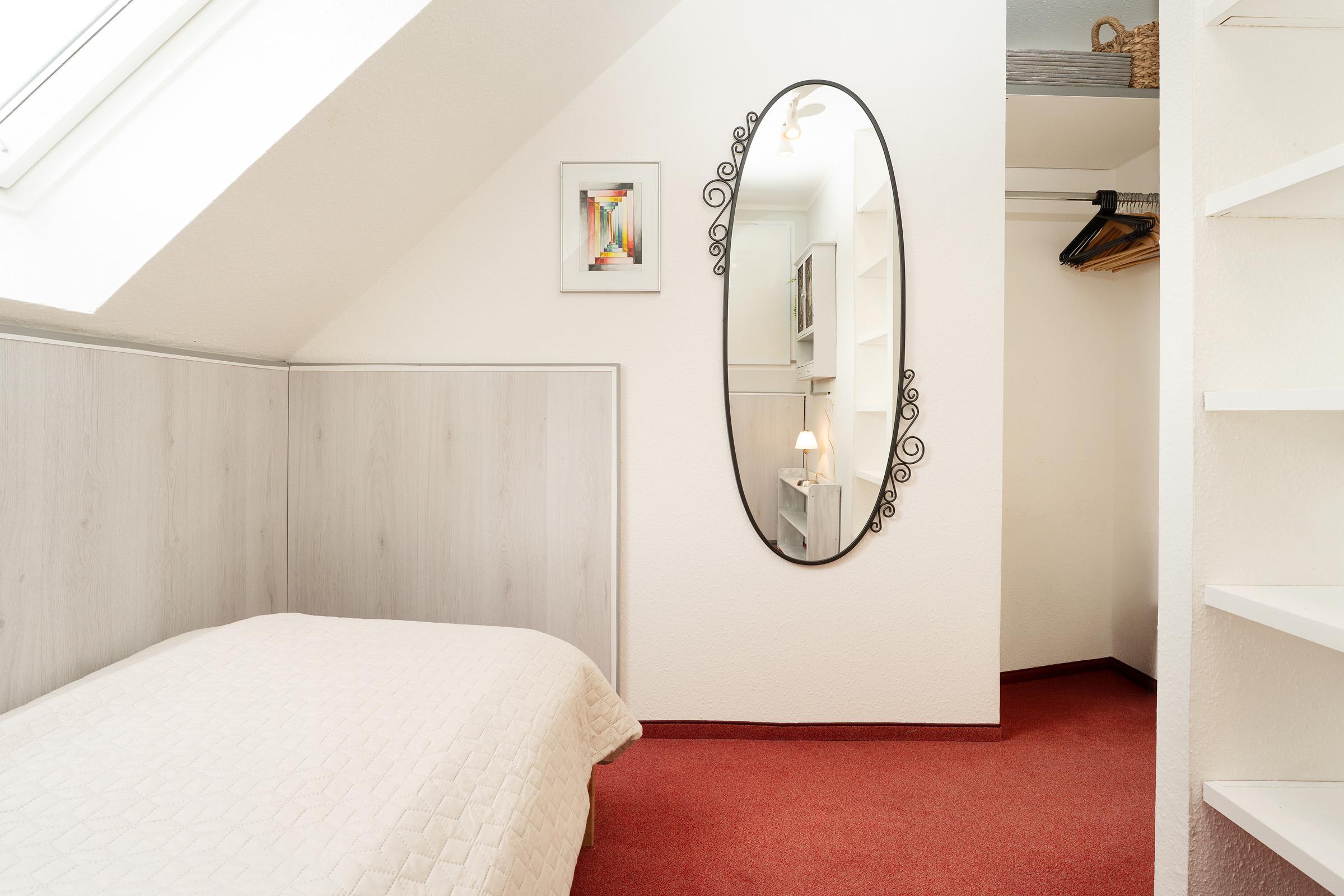 Schlafzimmer 2:1 Einzelbett (90x200cm), Regal, Kleiderstange, Verdunkelungsmöglichkeit Rollo, Platz für Babybett vorhanden