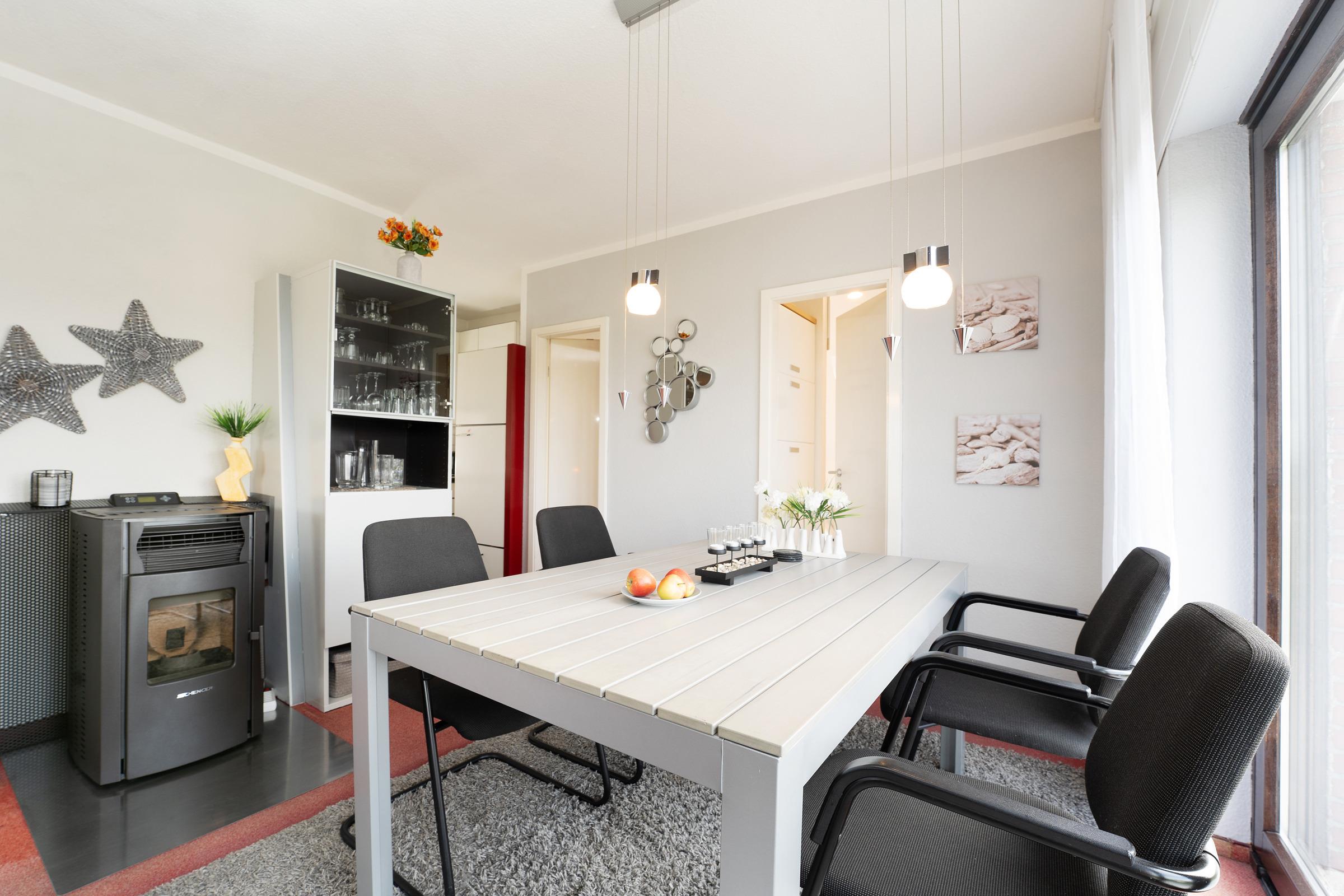 Diese charmante Ferienwohnung bietet Ihnen einen hellen, freundlich eingerichteten Wohnbereich mit gemütlichem Sofa, Fernseher, CD-Player, Stereoanlage sowie Radio. Von hier aus gelangen Sie direkt auf den möblierten Balkon, von dem aus Sie das Meer bestaunen und so richtig entspannen können. Die offene Küche ist mit allem ausgestattet, was Sie für einen komfortablen Aufenthalt benötigen – darunter Cerankochfeld, Backofen, Mixer und Toaster. Der Essbereich lädt zu gemeinsamen Mahlzeiten ein.