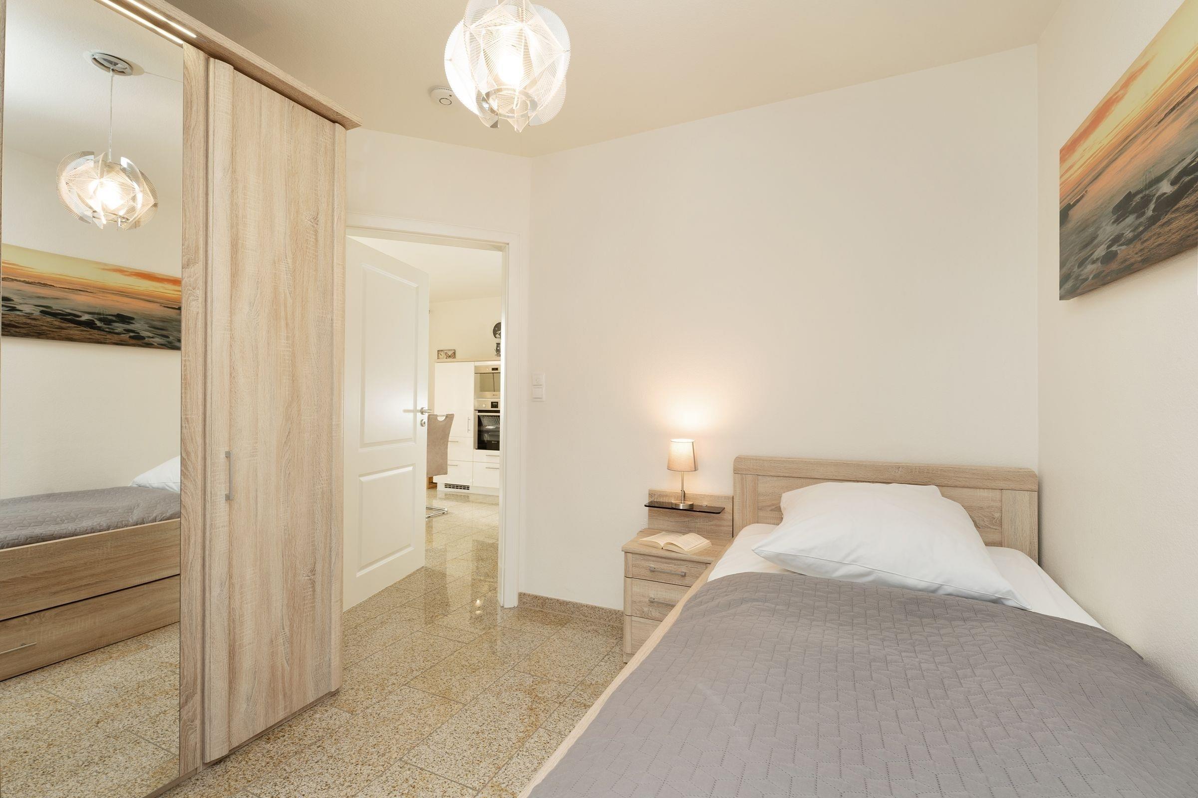 Schlafzimmer 2: 2 Einzelbetten (100x200 cm, ausziehbares Kojenbett), Kleiderschrank