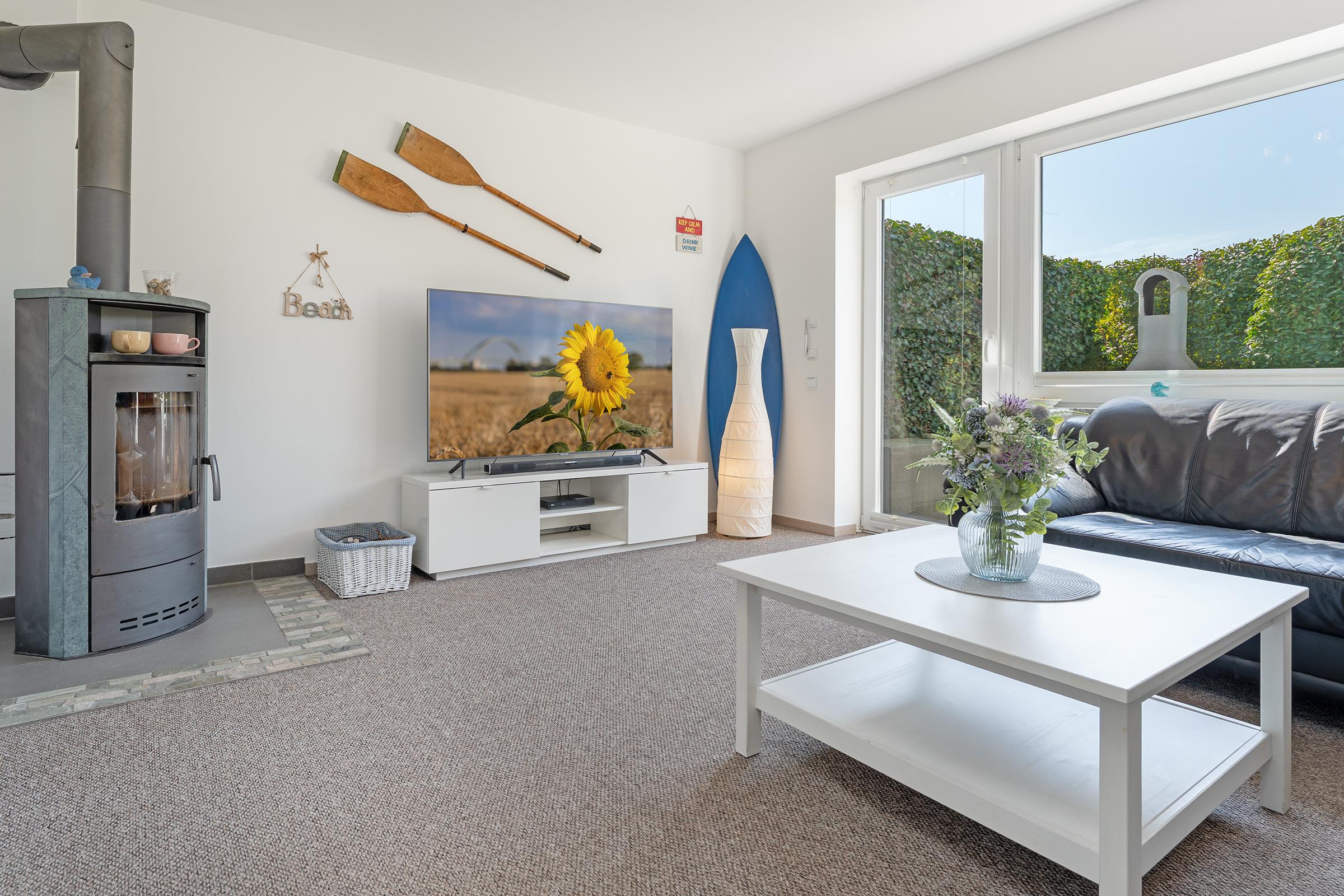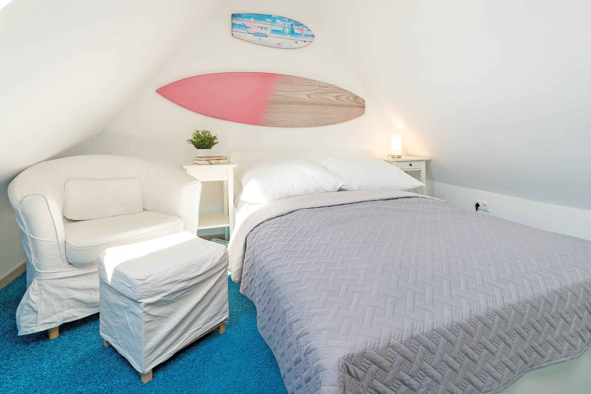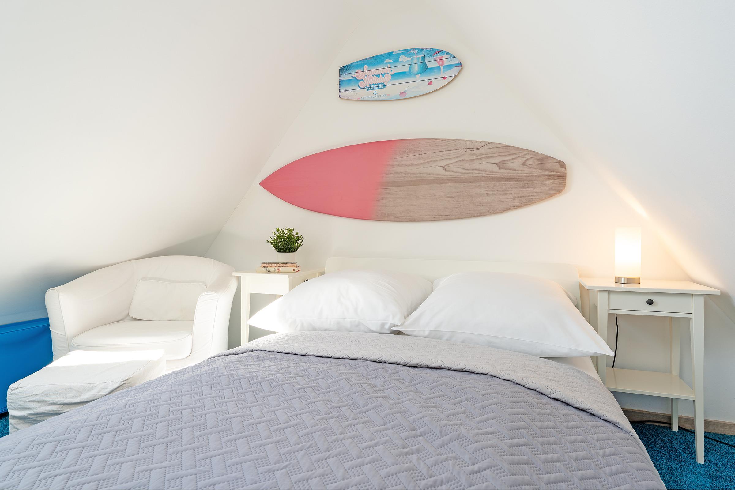Reinkommen, wohlfühlen und Urlaub machen - ist in diesem Ferienhaus das Motto. Hier wurde an alles gedacht, was das Herz begehrt. Das Haus wurde mit viel Liebe zum Detail und zum Wassersport eingerichtet. Im Erdgeschoss empfängt Sie ein geschmackvoll möblierter Wohnbereich mit Sofa und TV. Über die Terrassentür gelangen Sie nach draußen. Hier befindet sich ein gemütlicher Essplatz mit ausreichend Platz. Ein Holzkohlegrill ist vorhanden. Neben der Terrasse liegt der schöne Gemeinschaftsgarten. Die gut ausgestattete Küche bietet Ihnen Annehmlichkeiten wie eine Spülmaschine, eine Mikrowelle und einen Backofen. Den Kaffee am Morgen können Sie sich mit einer Filter-Kaffeemaschine oder einer Kapsel-Maschine zubereiten. Ein Essbereich steht direkt in der Küche. Im Obergeschoss gibt es ein Schlafzimmer mit einem Doppelbett (180 cm breit). Drei Kommoden, ein Fernseher mit kleiner Couch und Tisch stehen hier zur Verfügung. Vom Schlafzimmer aus gelangen Sie auf den Balkon, der mit vier Sitzplätzen und einem Tisch möbliert ist. Weitere Schlafgelegenheiten bieten ein kleines Kinderzimmer mit Etagenbett (90x200 cm) sowie ein Doppelbett (140x200 cm) im Dachgeschoss.