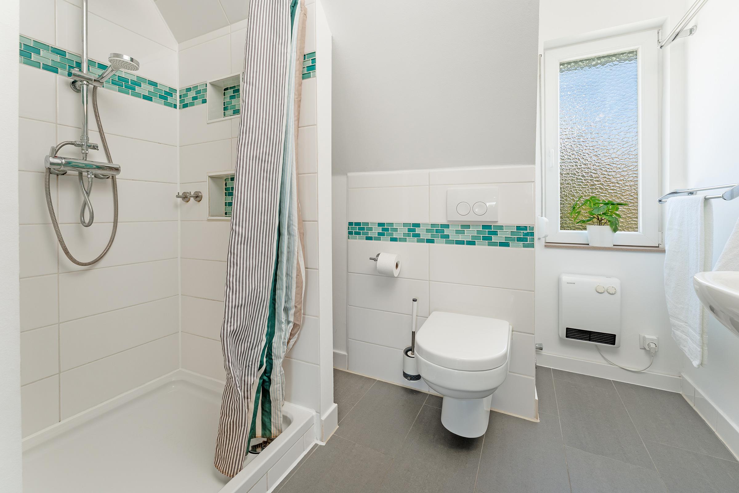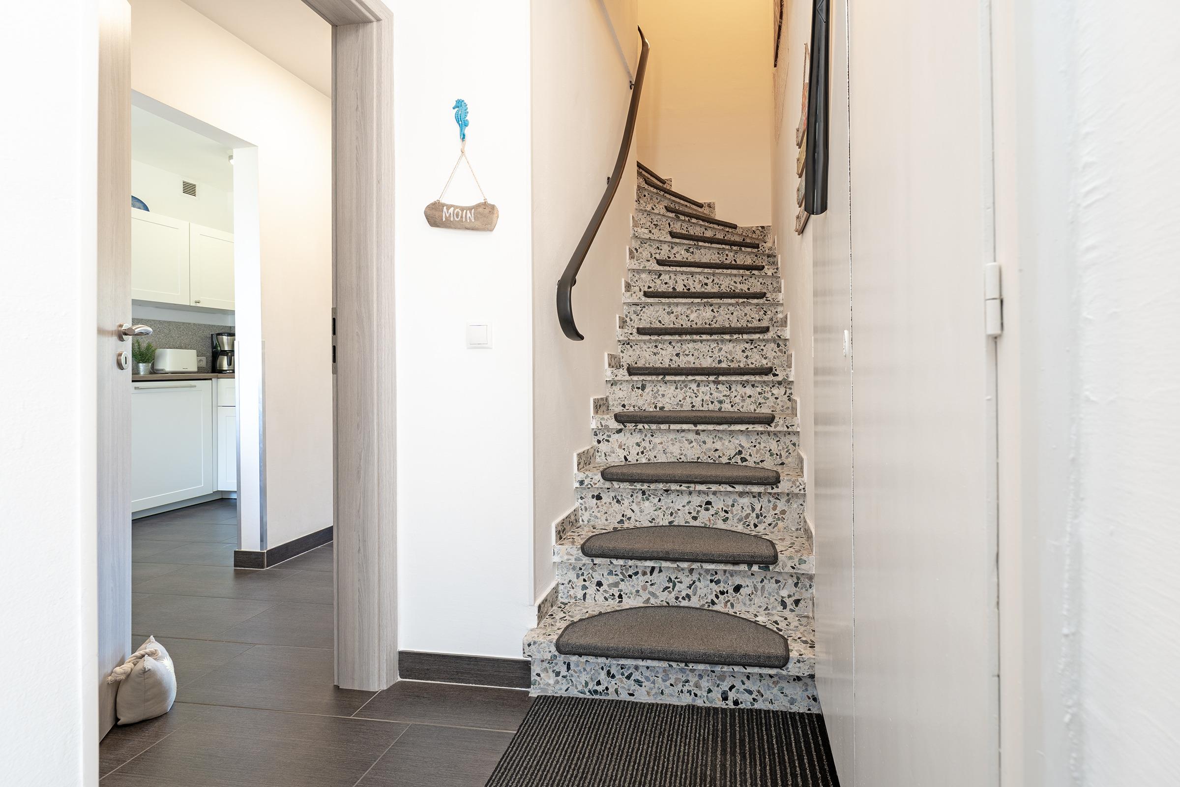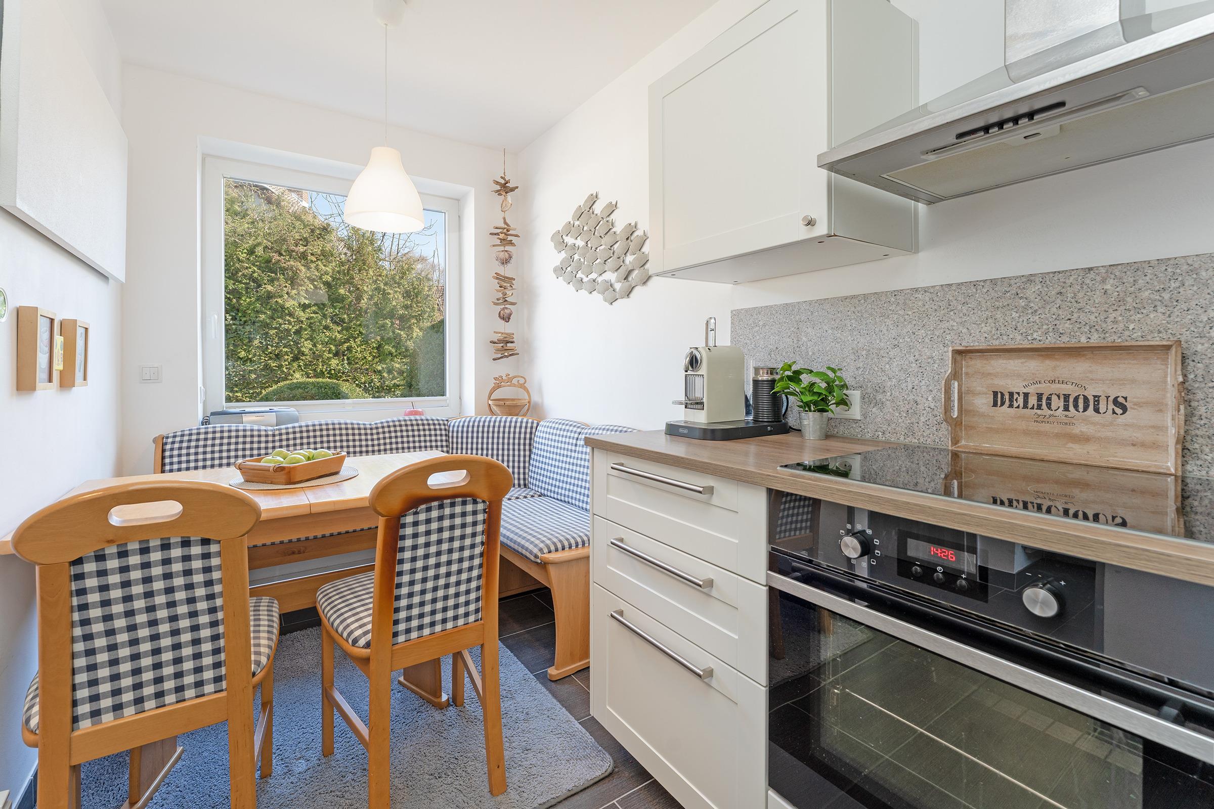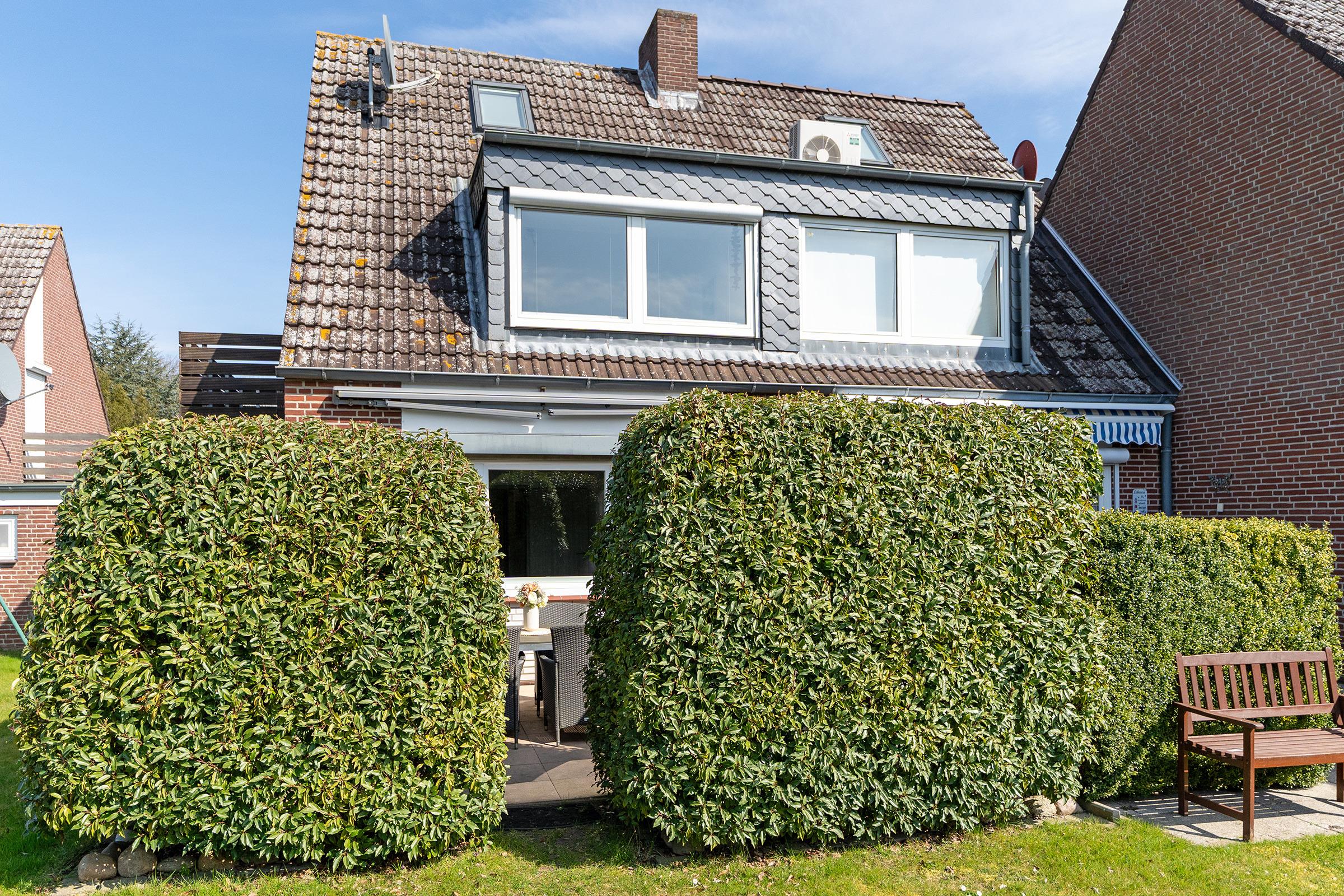 Reinkommen, wohlfühlen und Urlaub machen - ist in diesem Ferienhaus das Motto. Hier wurde an alles gedacht, was das Herz begehrt. Das Haus wurde mit viel Liebe zum Detail und zum Wassersport eingerichtet. Im Erdgeschoss empfängt Sie ein geschmackvoll möblierter Wohnbereich mit Sofa und TV. Über die Terrassentür gelangen Sie nach draußen. Hier befindet sich ein gemütlicher Essplatz mit ausreichend Platz. Ein Holzkohlegrill ist vorhanden. Neben der Terrasse liegt der schöne Gemeinschaftsgarten. Die gut ausgestattete Küche bietet Ihnen Annehmlichkeiten wie eine Spülmaschine, eine Mikrowelle und einen Backofen. Den Kaffee am Morgen können Sie sich mit einer Filter-Kaffeemaschine oder einer Kapsel-Maschine zubereiten. Ein Essbereich steht direkt in der Küche. Im Obergeschoss gibt es ein Schlafzimmer mit einem Doppelbett (180 cm breit). Drei Kommoden, ein Fernseher mit kleiner Couch und Tisch stehen hier zur Verfügung. Vom Schlafzimmer aus gelangen Sie auf den Balkon, der mit vier Sitzplätzen und einem Tisch möbliert ist. Weitere Schlafgelegenheiten bieten ein kleines Kinderzimmer mit Etagenbett (90x200 cm) sowie ein Doppelbett (140x200 cm) im Dachgeschoss.