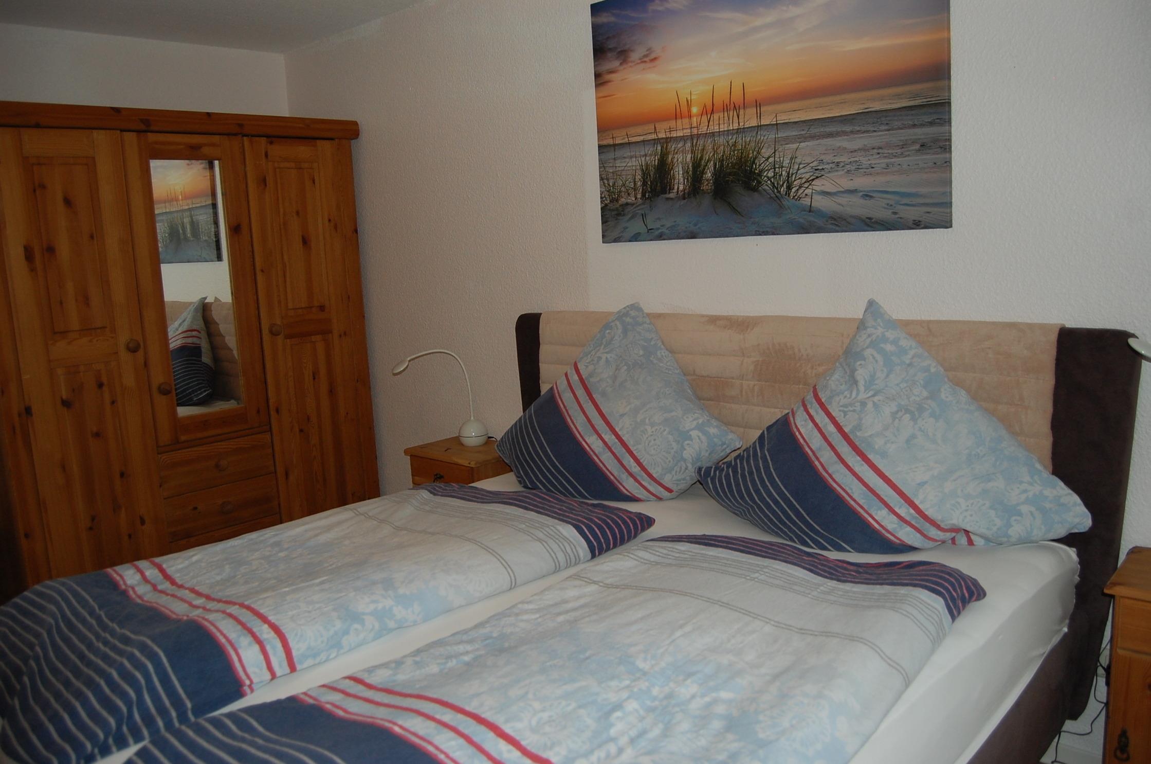 Ebenfalls vom Wohnraum erreichen Sie das gemütliche Schlafzimmer mit einem erhöhten Polsterbett mit verstellbarem Kopf- und Fußteil.