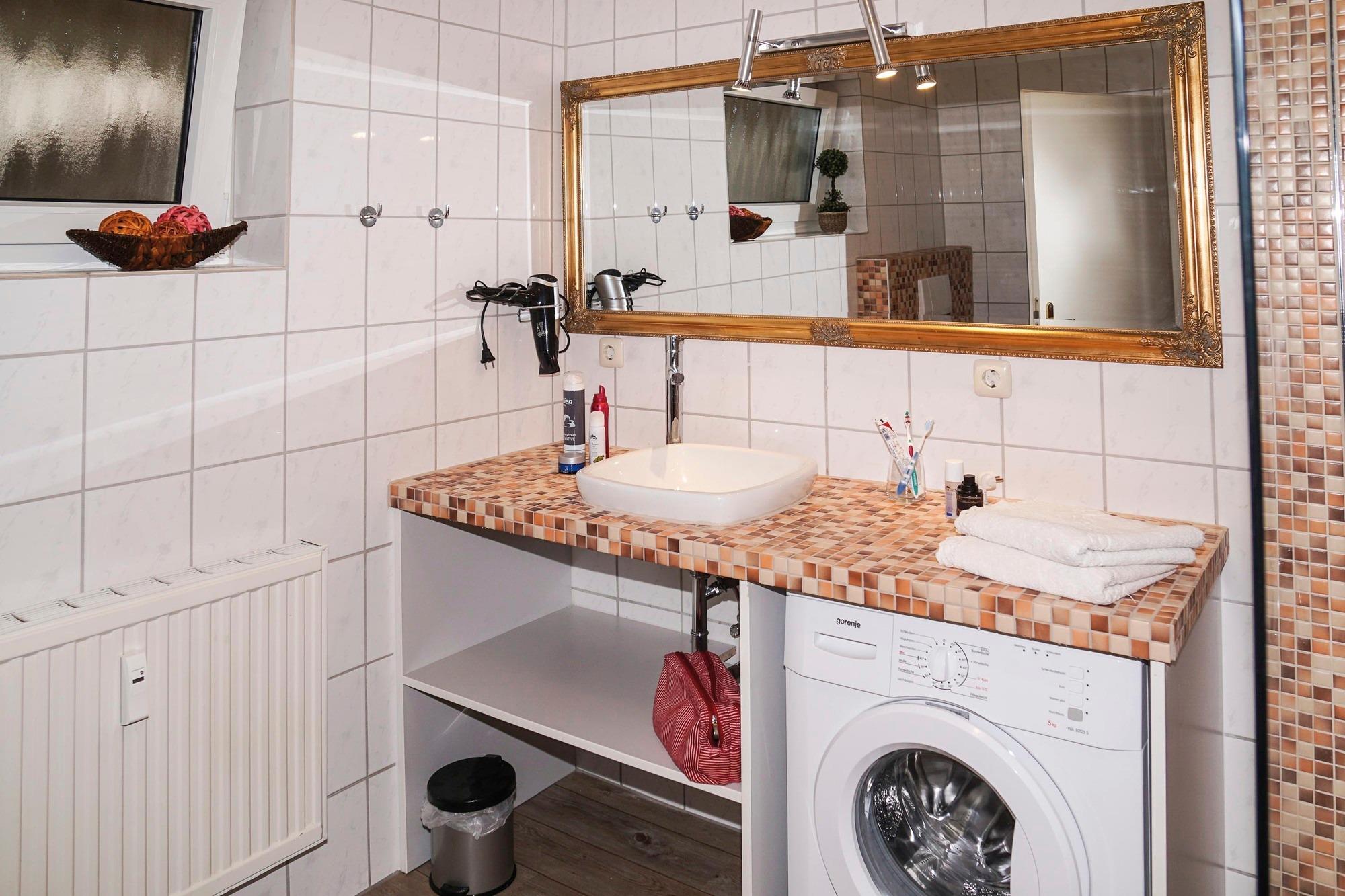 Gleich links befindet sich das großzügige altersgerechte Badezimmer mit großer offener Dusche, erhöhter Toilette und mit viel Ablagemöglichkeiten ,hier befindet sich auch die Waschmaschine.