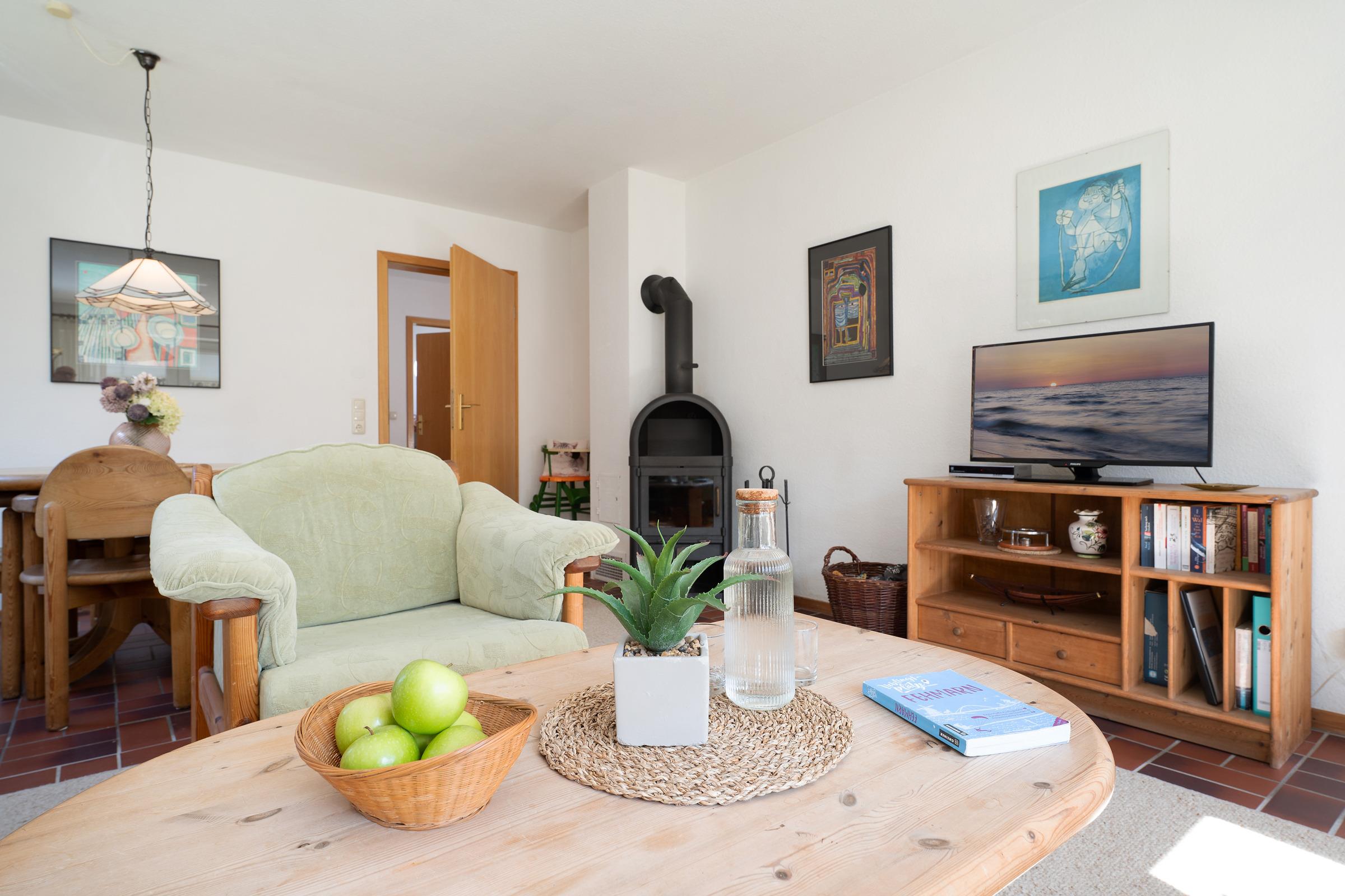 Der Wohnbereich ist gemütlich eingerichtet und verfügt über eine Sitz- und Essecke mit dänischem Kaminofen. Von hier aus können Sie nach draußen gehen: Die große Terrasse ist nach Süden ausgerichtet. Bequeme Gartenmöbel, ein toller Strandkorb sowie ein Grill versüßen Ihnen die Auszeit. Das anschließende Rasenstück ist durch eine Grünanlage vom Nachbargrundstück getrennt. In der separaten, gut ausgestatteten Küche können Sie Ihre Lieblingsspeisen zaubern, ein Geschirrspüler übernimmt anschließend den Abwasch. Ein Schlafzimmer verfügt über ein Doppelbett, im zweiten Schlafzimmer befindet sich ein Etagenbett. Das großzügige Duschbad hat Tageslicht und ist hell gefliest.