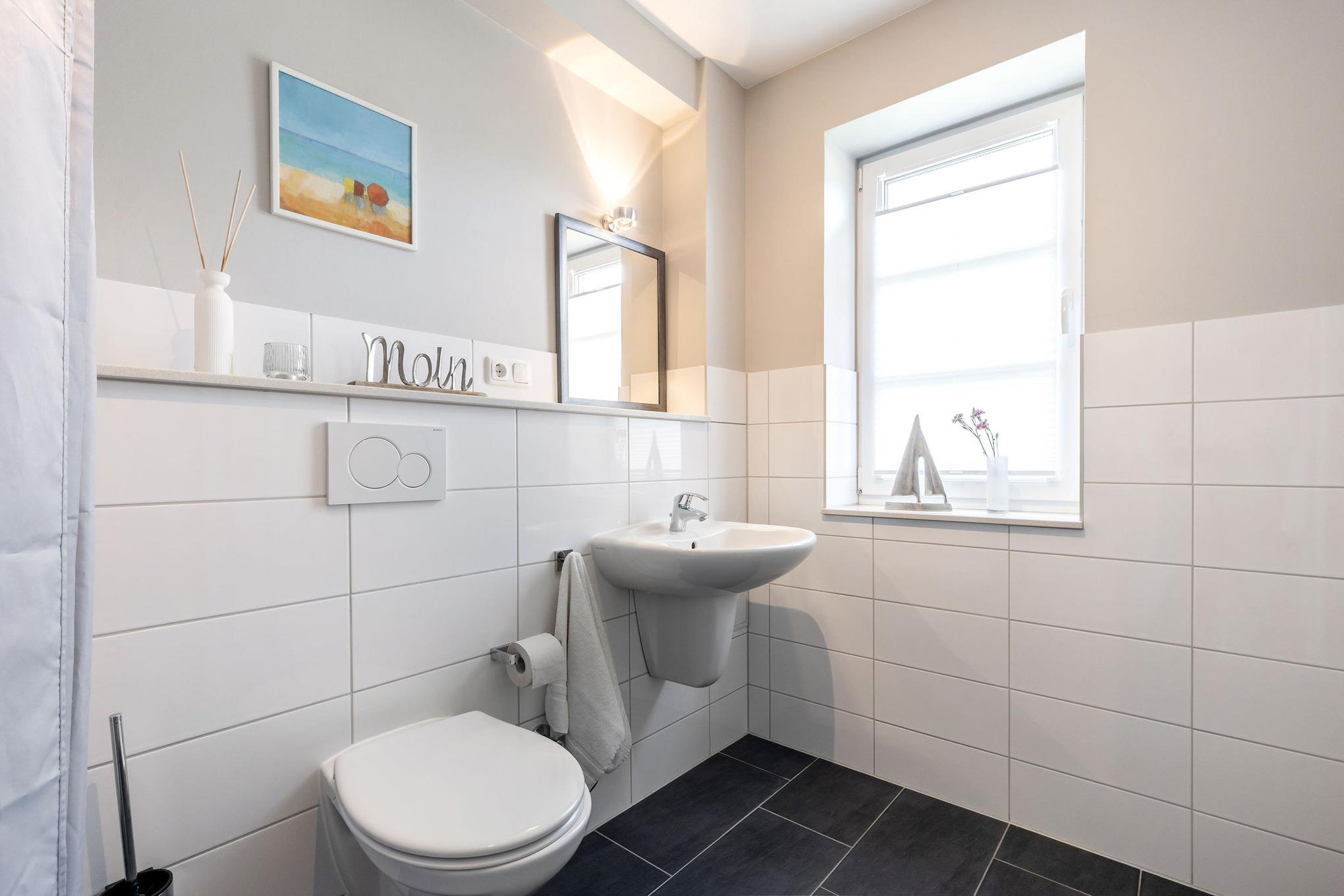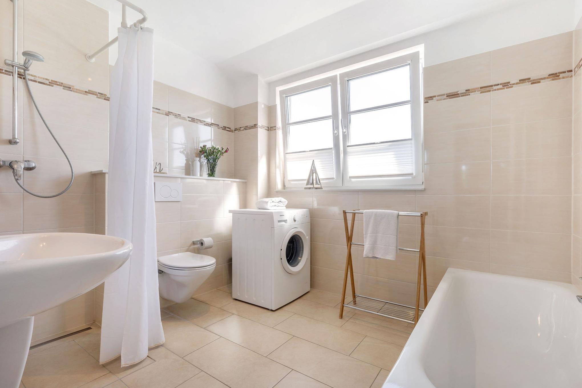 Das Bad im Erdgeschoss ist mit einer Dusche ausgestattet, das Vollbad im Obergeschoß verfügt über eine Dusche und eine Badewanne.