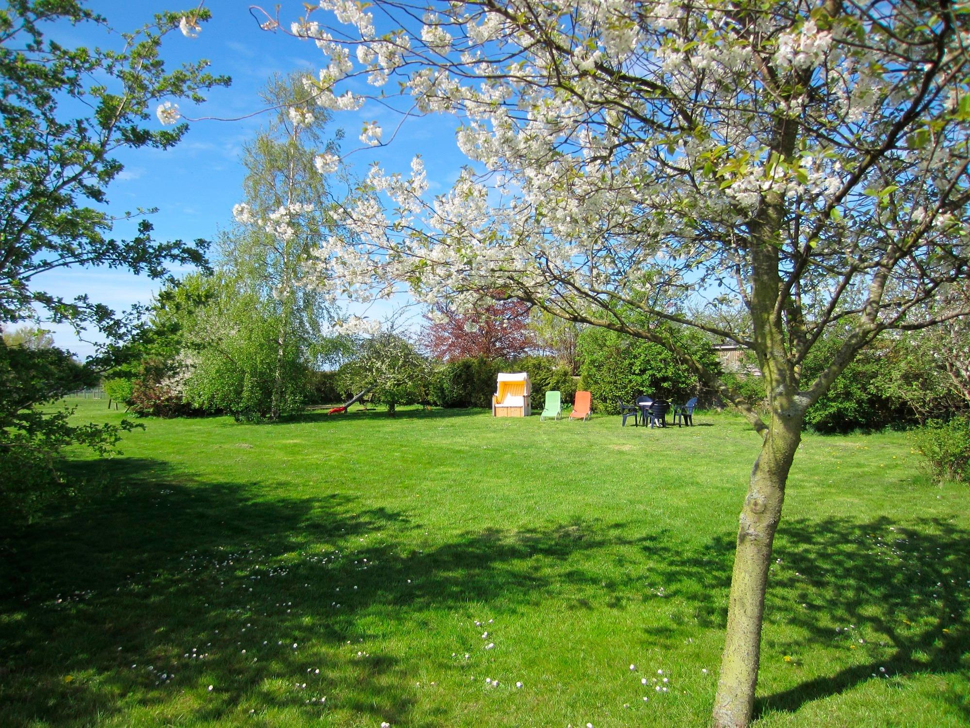 In der großen Gartenanlage laden ein Strandkorb, Gartenliegen und Gartenstühle zum Sonnenbaden ein.