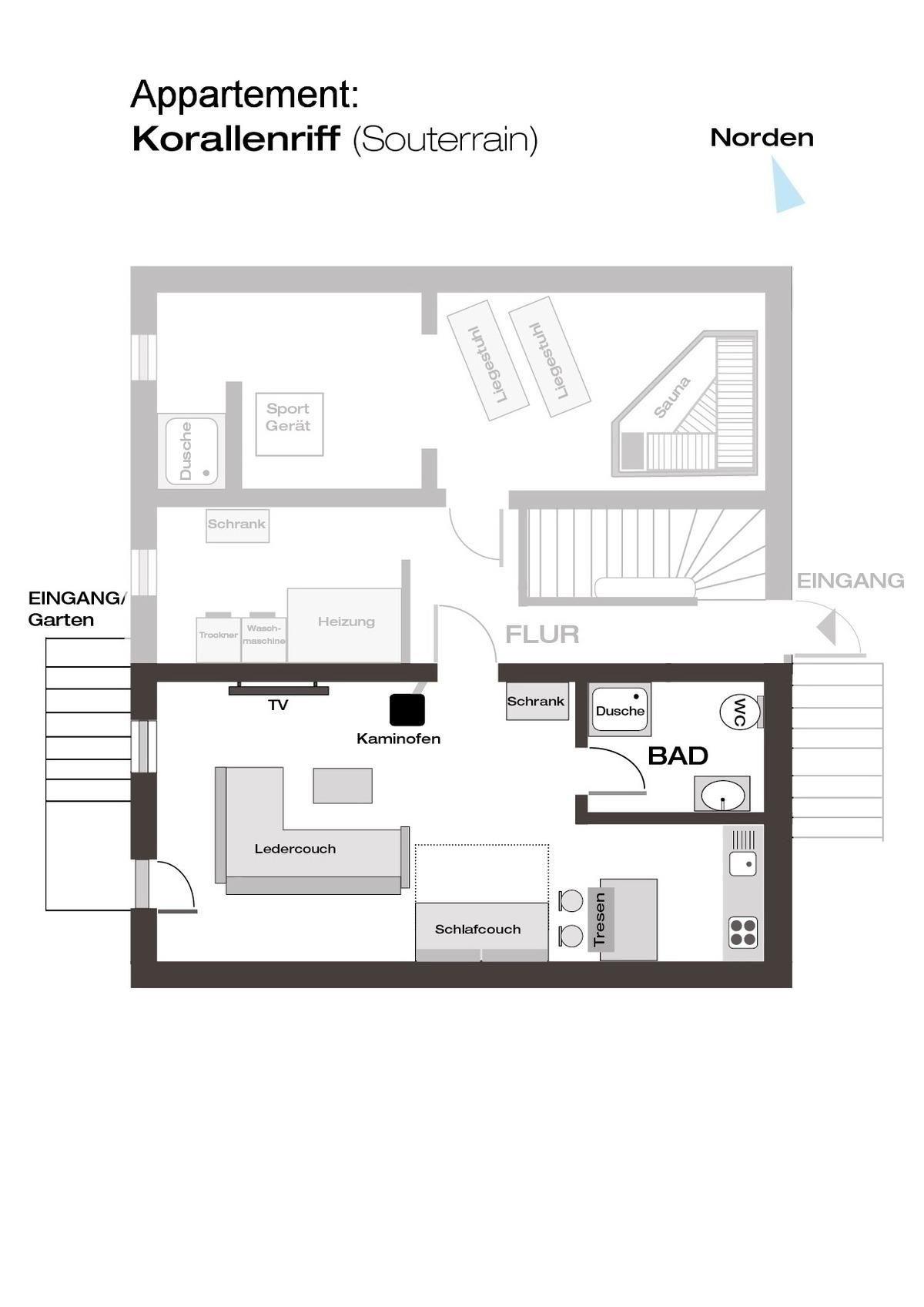 Das charmante 1-Zimmer-Appartement Korallenriff für max. 2 Personen befindet sich im Souterrain einer gepflegten Appartementhausanlage im Norden von Puttgarden in erster Reihe zur Ostsee.